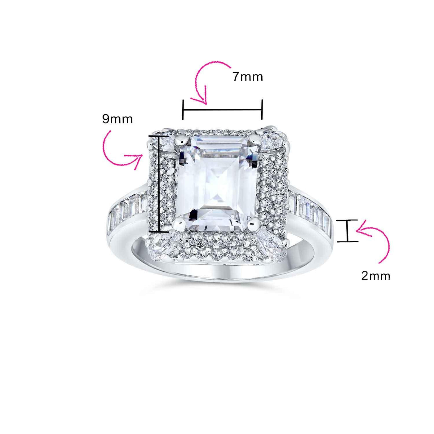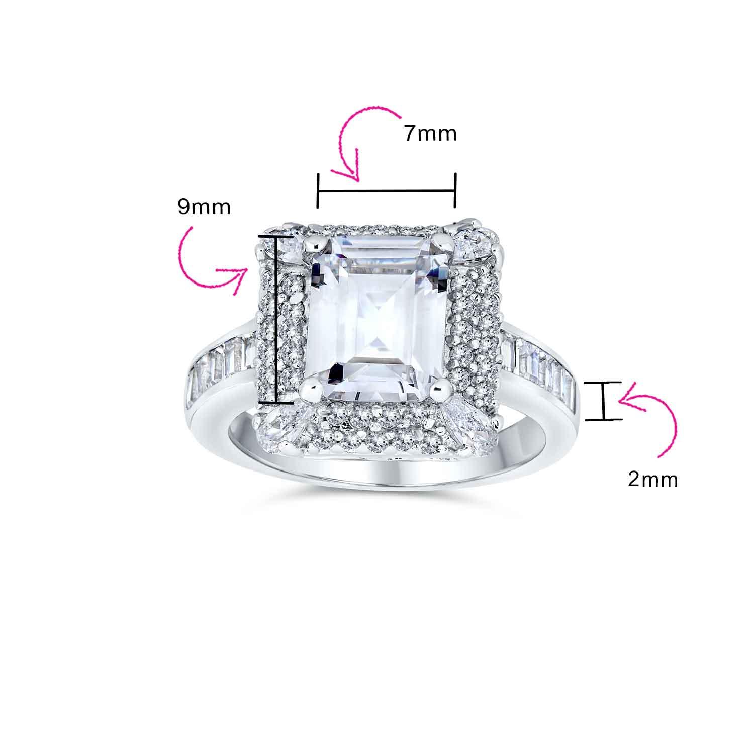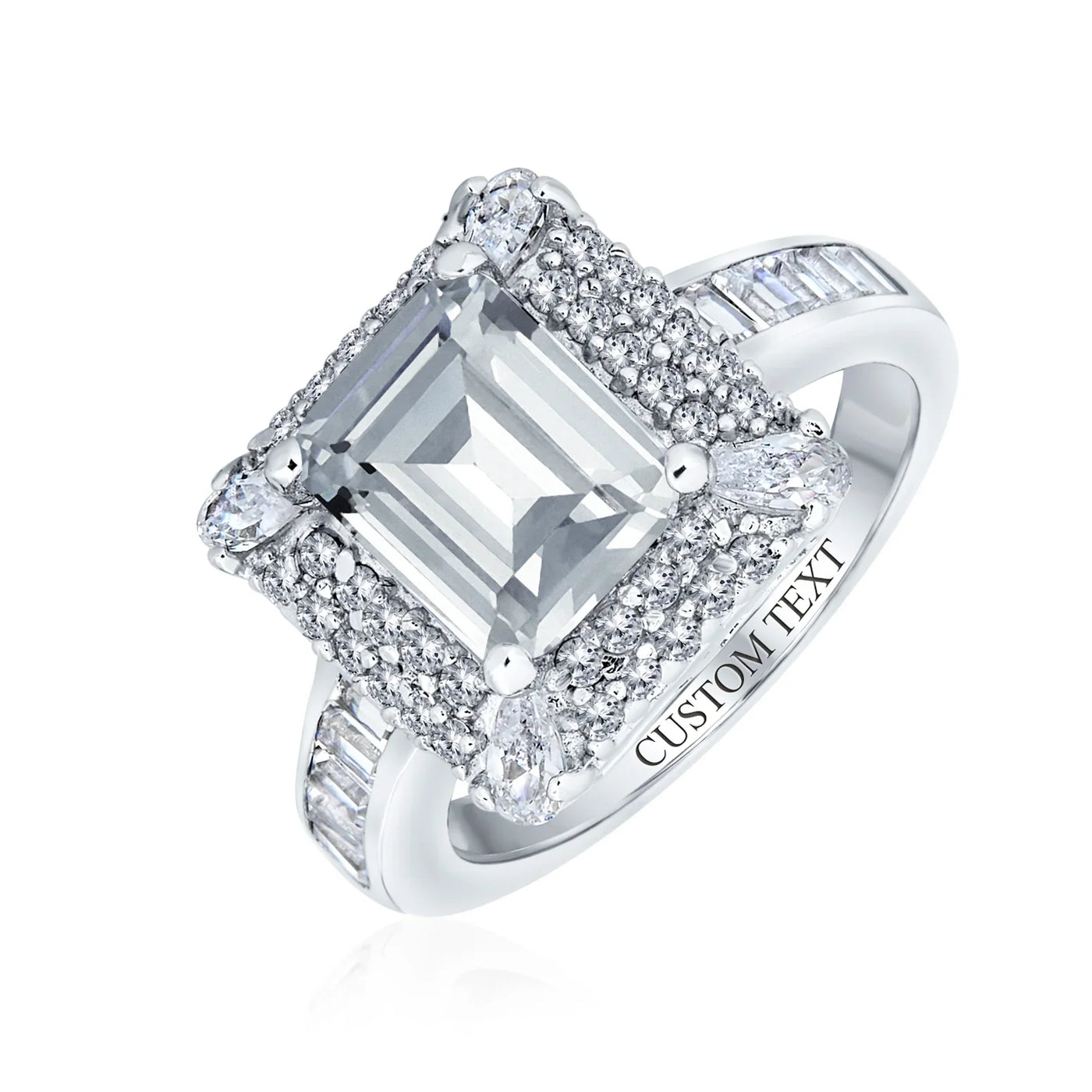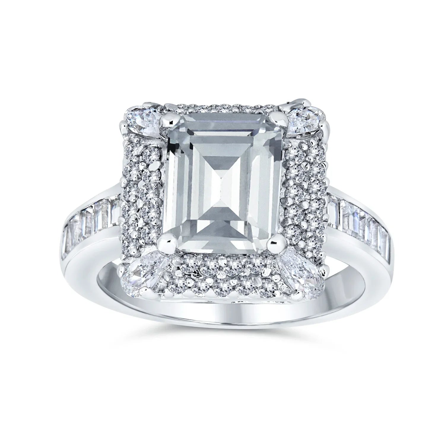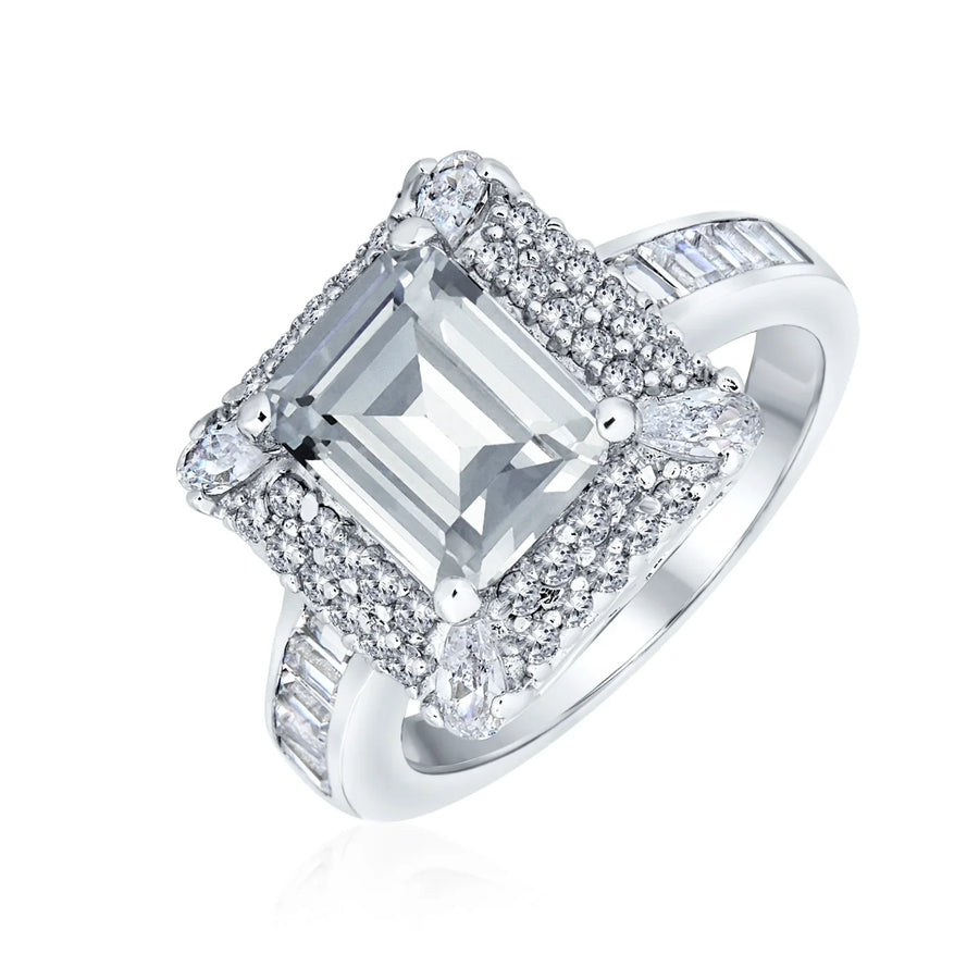 • Gift her the engagement ring of her dreams. This stunning sterling silver ring features gorgeous CZ stones in a vintage style. Emerald cut stones adorn the slim band, surrounded by round and pear-shaped stones. The centerpiece is a dazzling 2.5 carat emerald cut stone, giving it a cocktail ring look. Ideal for glamorous friends, this sterling silver jewelry is perfect for a memorable engagement.