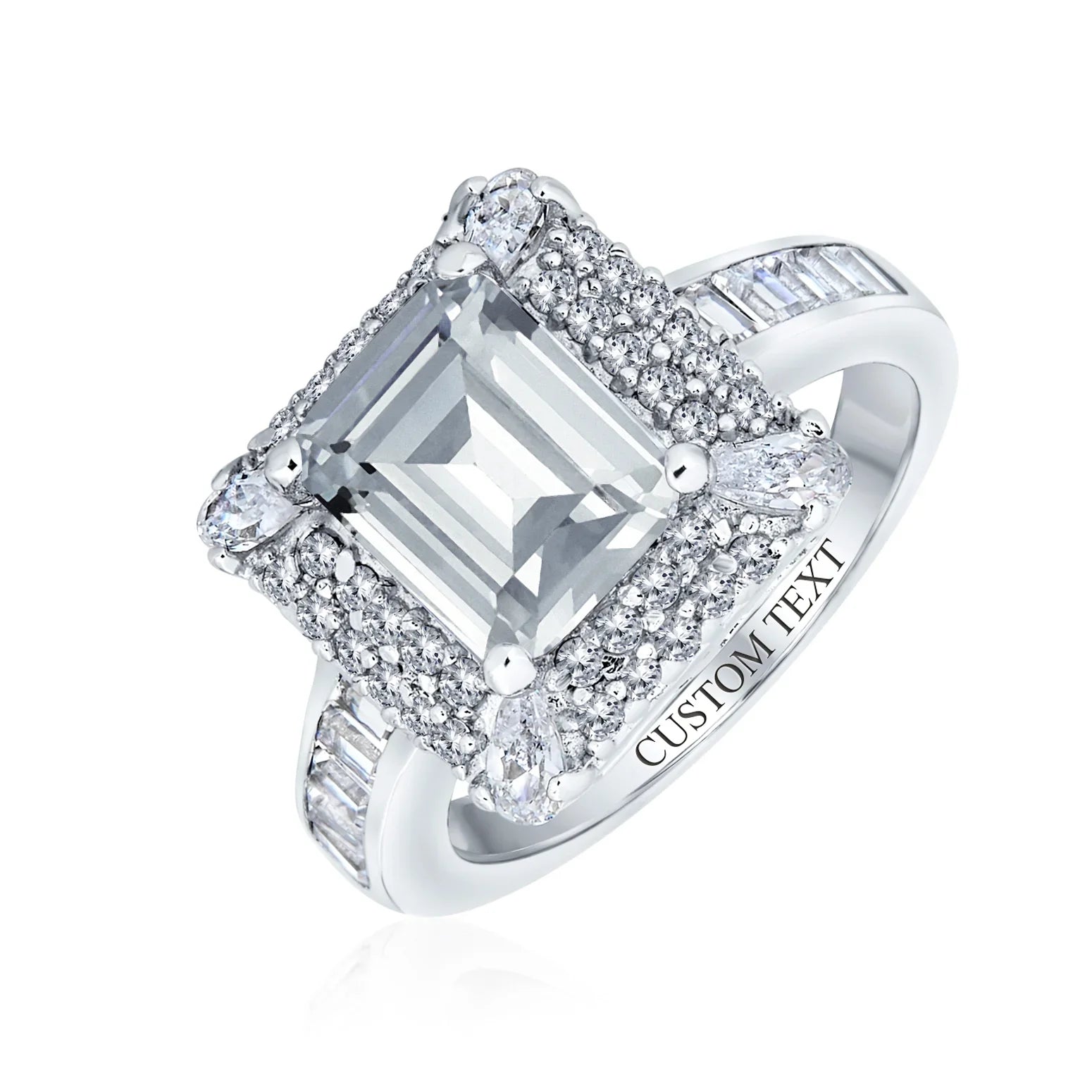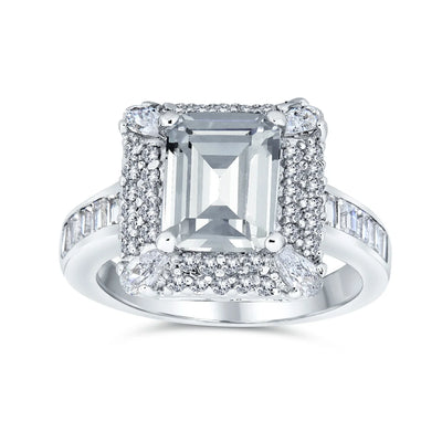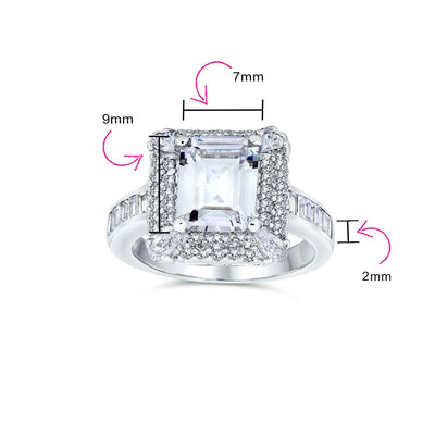 Classic 4CTW Emerald Cut CZ Halo Engagement Ring in Sterling Silver Pave Band