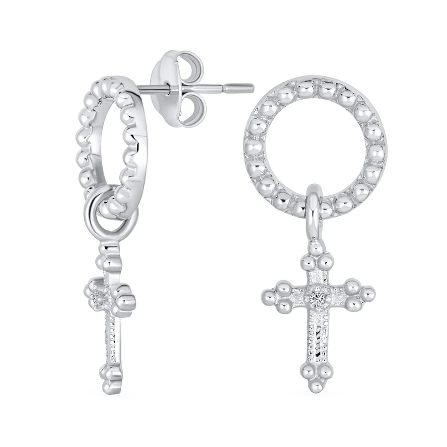 - STUNNING SPIRITUAL EARRING DESIGN - Embrace your faith with these stunning, secure dangle fleur de Lis cross earrings. Highlighted by a Christian cross delicately light weight dangles from a beaded edge circle this spiritual cross earrings exuding medieval, old world appeal with modern flare.