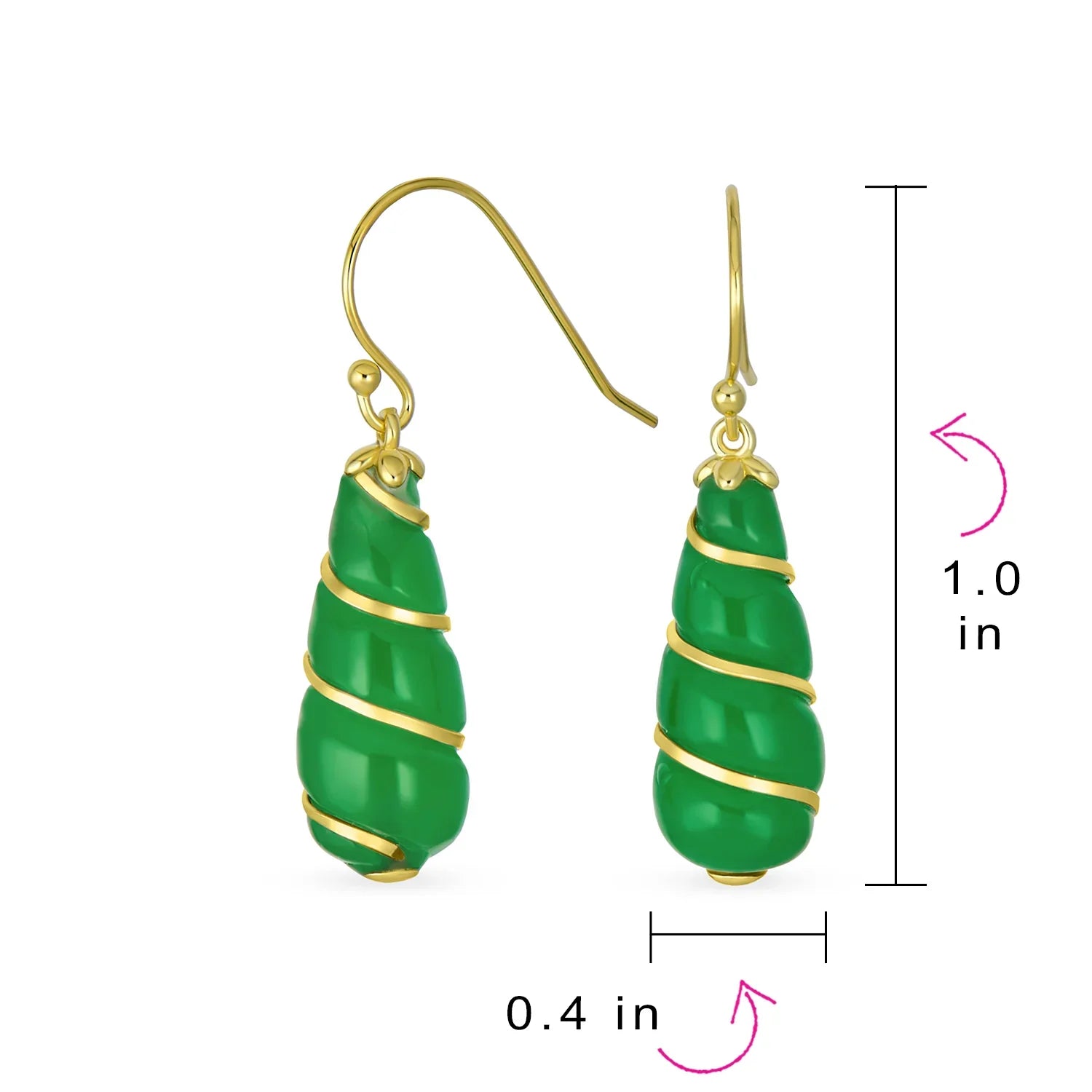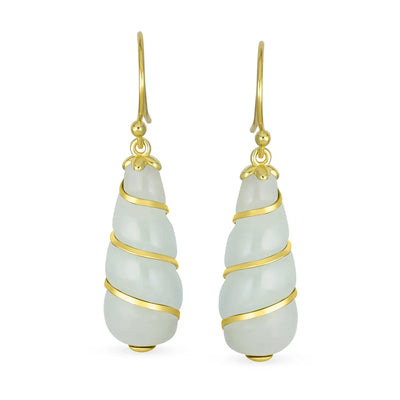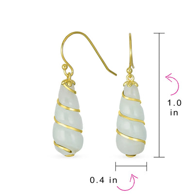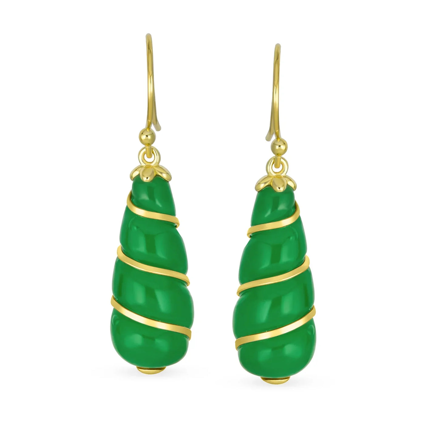 - These elegant jade teardrop earrings feature a gold spiral wire wrapped around a large jade gemstone, exuding celebrity flair. At a perfect 1-inch length, they make a bold statement. Known as the gemstone of purity and purification, jade adds a touch of healing and hope to any ensemble.