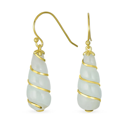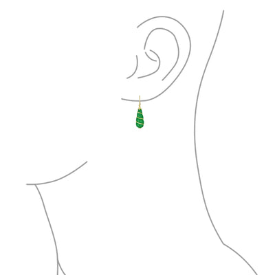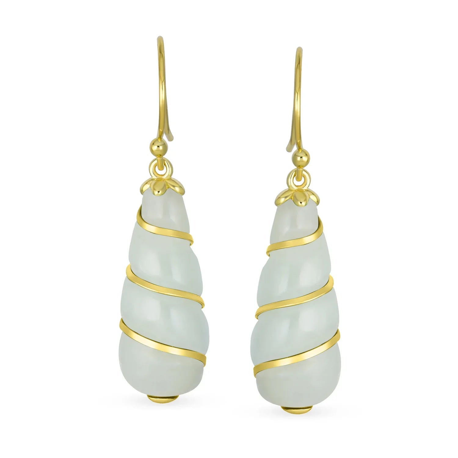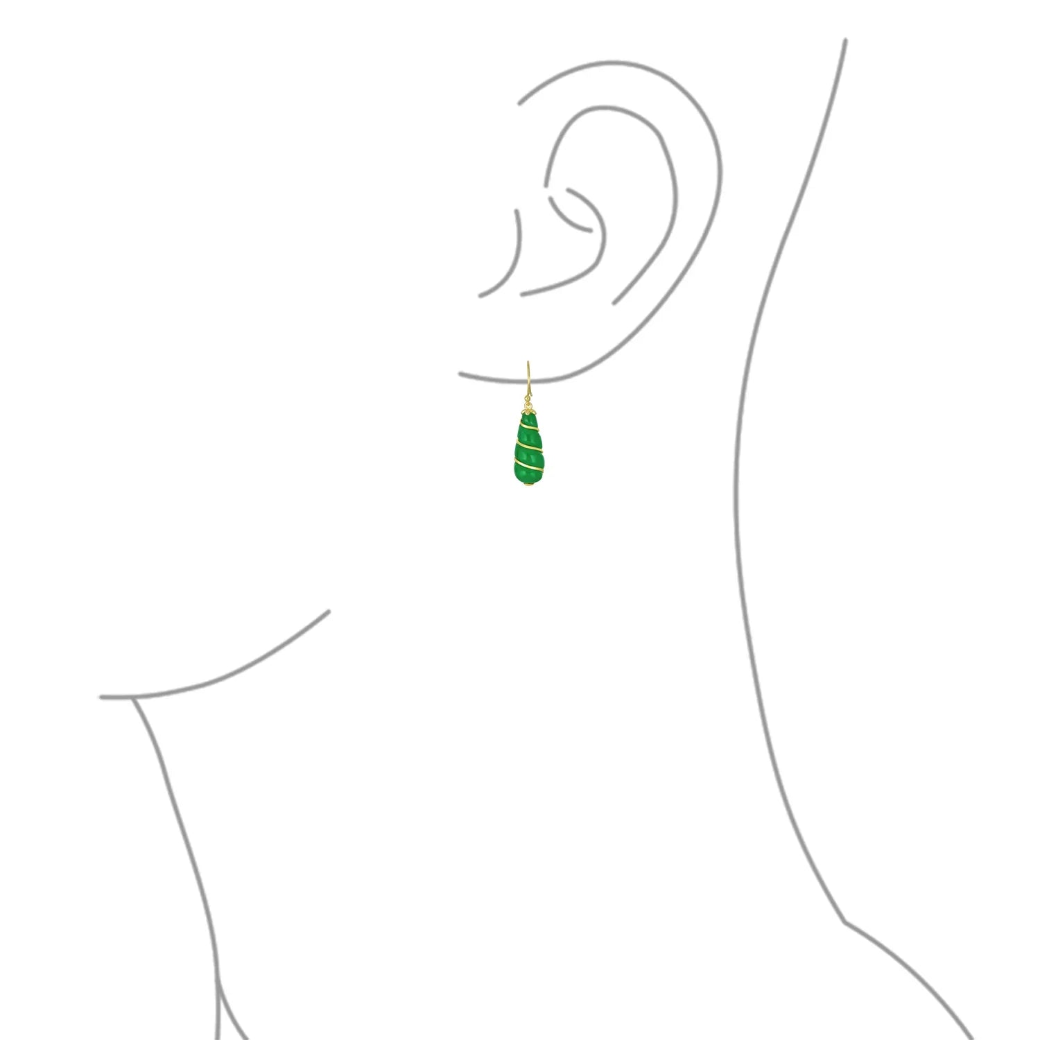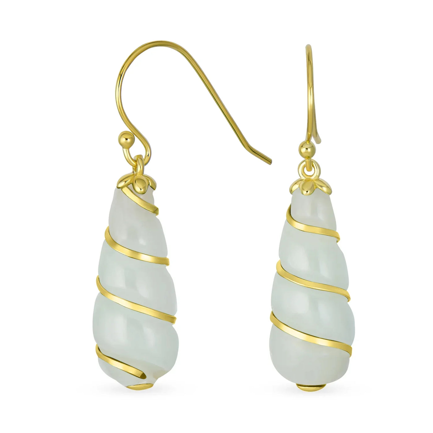- These elegant jade teardrop earrings feature a gold spiral wire wrapped around a large jade gemstone, exuding celebrity flair. At a perfect 1-inch length, they make a bold statement. Known as the gemstone of purity and purification, jade adds a touch of healing and hope to any ensemble.