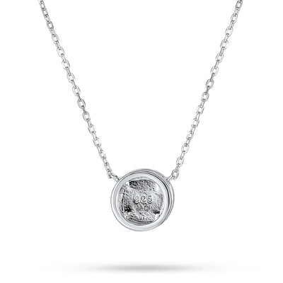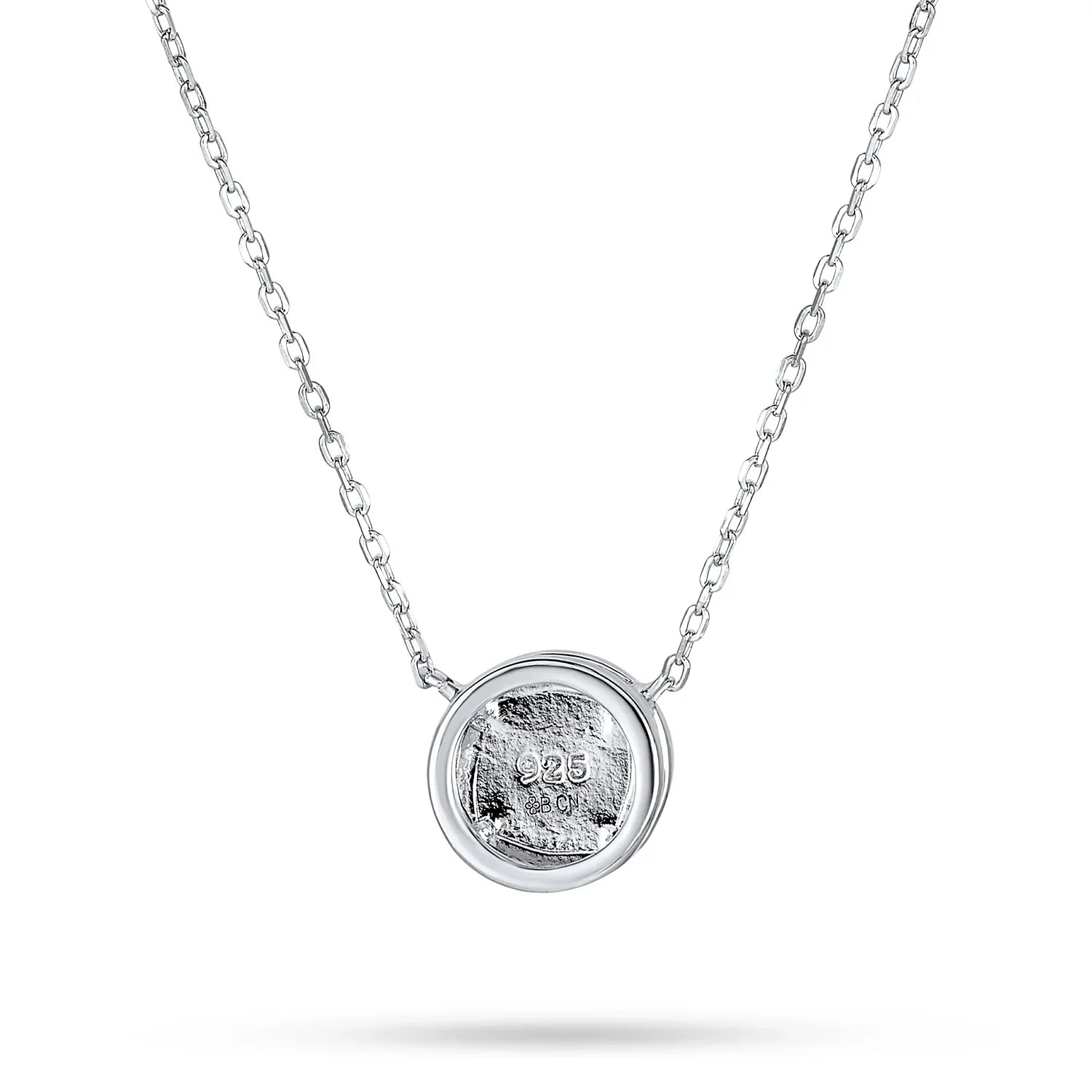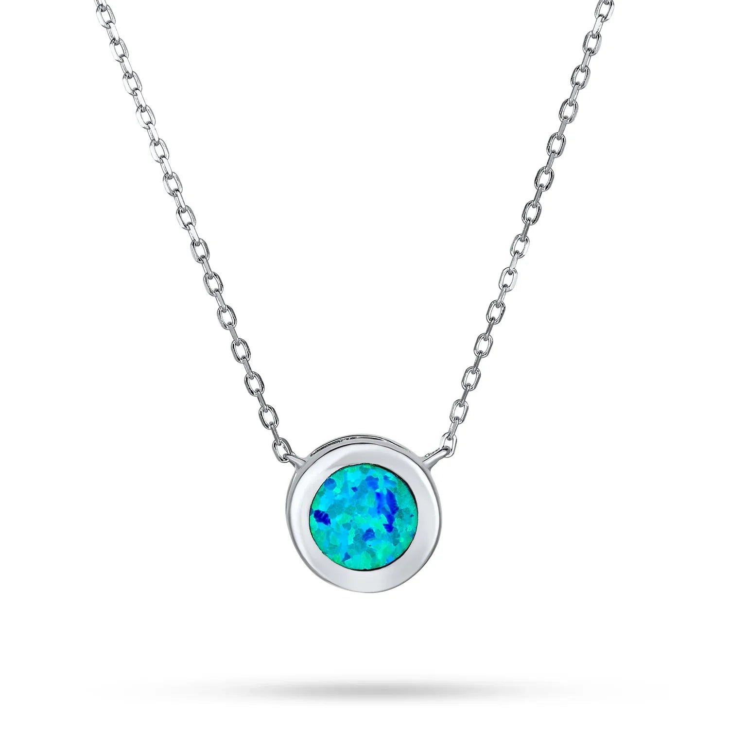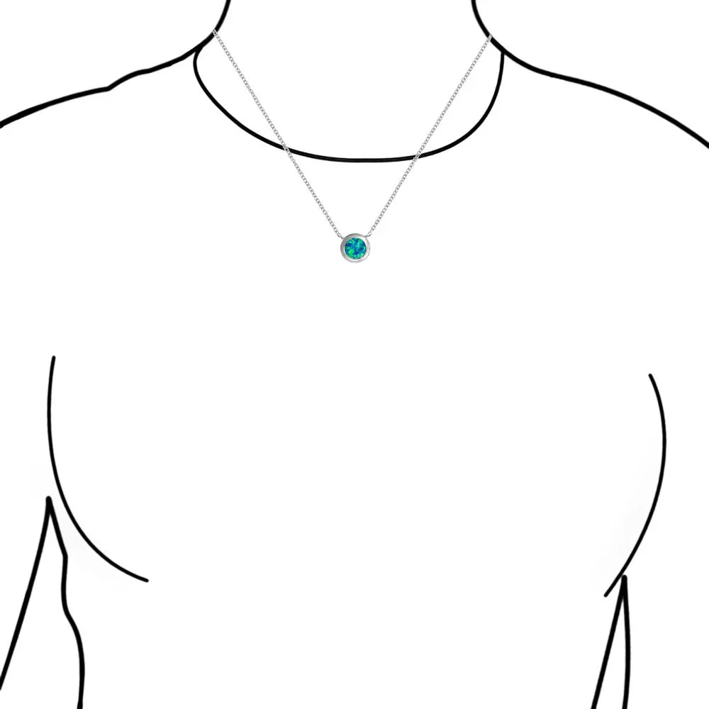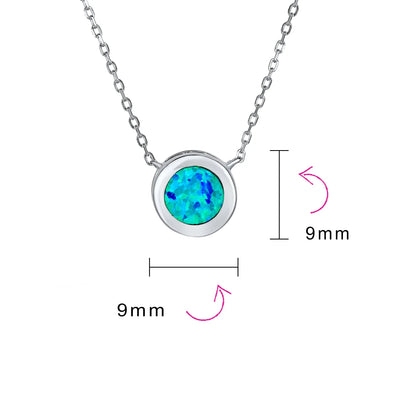 - This captivating solitaire round bezel set synthetic opal pendant necklace complements any outfit. The rhodium plated sterling silver sparkles brightly. Perfect as an October birthstone birthday gift. Surprise her with this stunning opal necklace and make her shine.