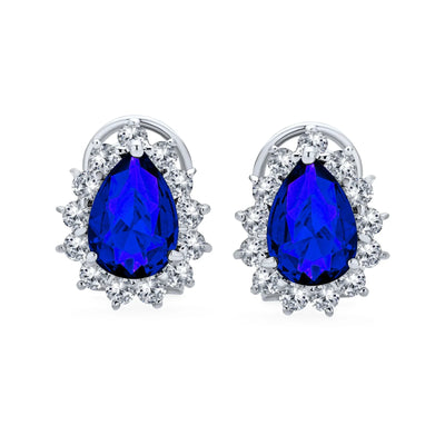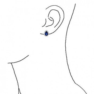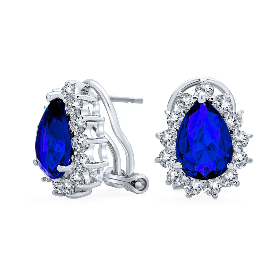 - Our stunning Simulated Sapphire, rhodium plated brass, omega back stud earrings will exquisitely heighten the glamour at your formal event. These teardrop stud earrings are designed with dazzling faceted 2.25ct CZ Simulated Sapphires each of which are framed with exquisite clear CZs. Our alluring blue Simulated Sapphire CZ teardrops have a deep rich color creating regal, dramatic visual appeal. A gorgeous option for a September birthday. Order your teardrop stud earrings today!
