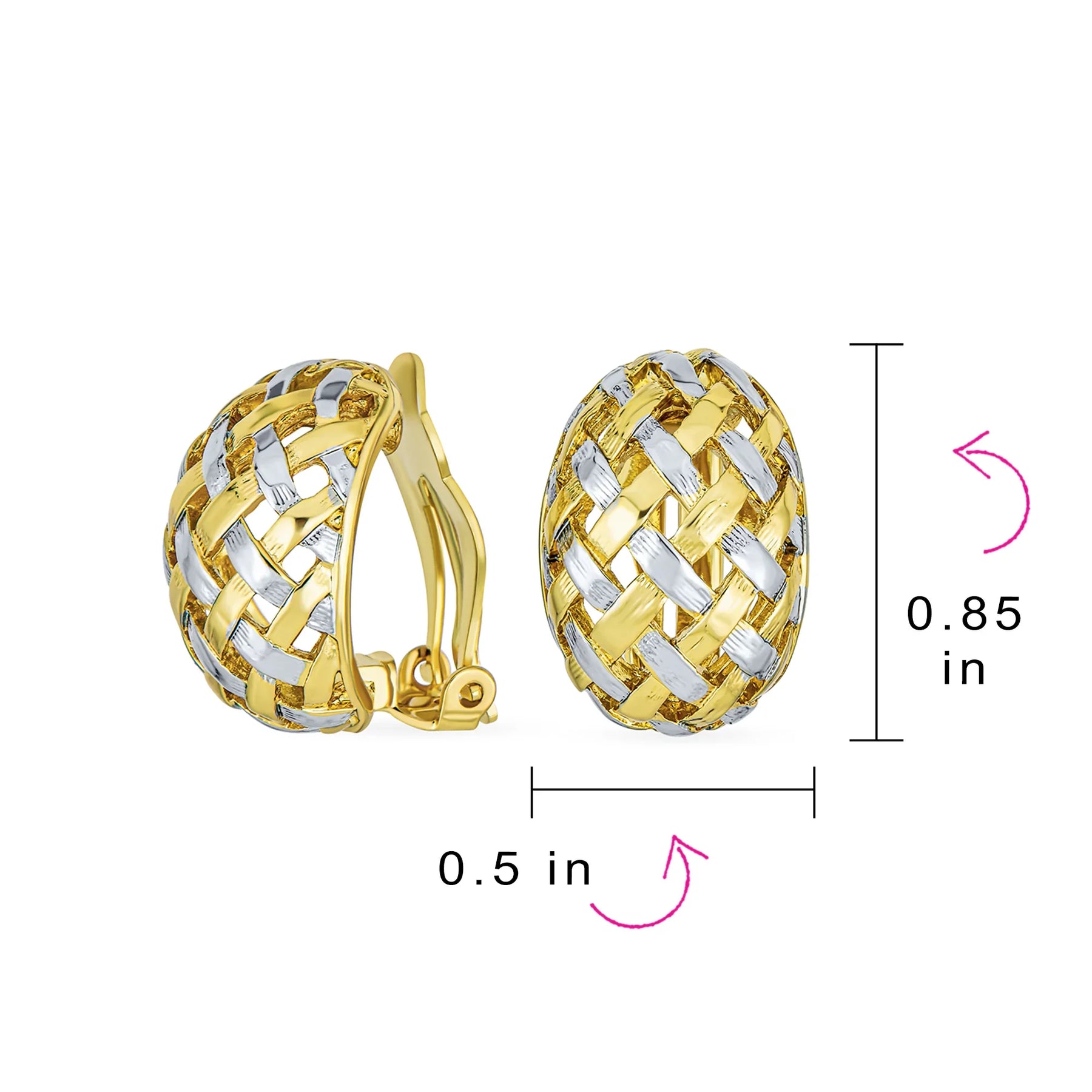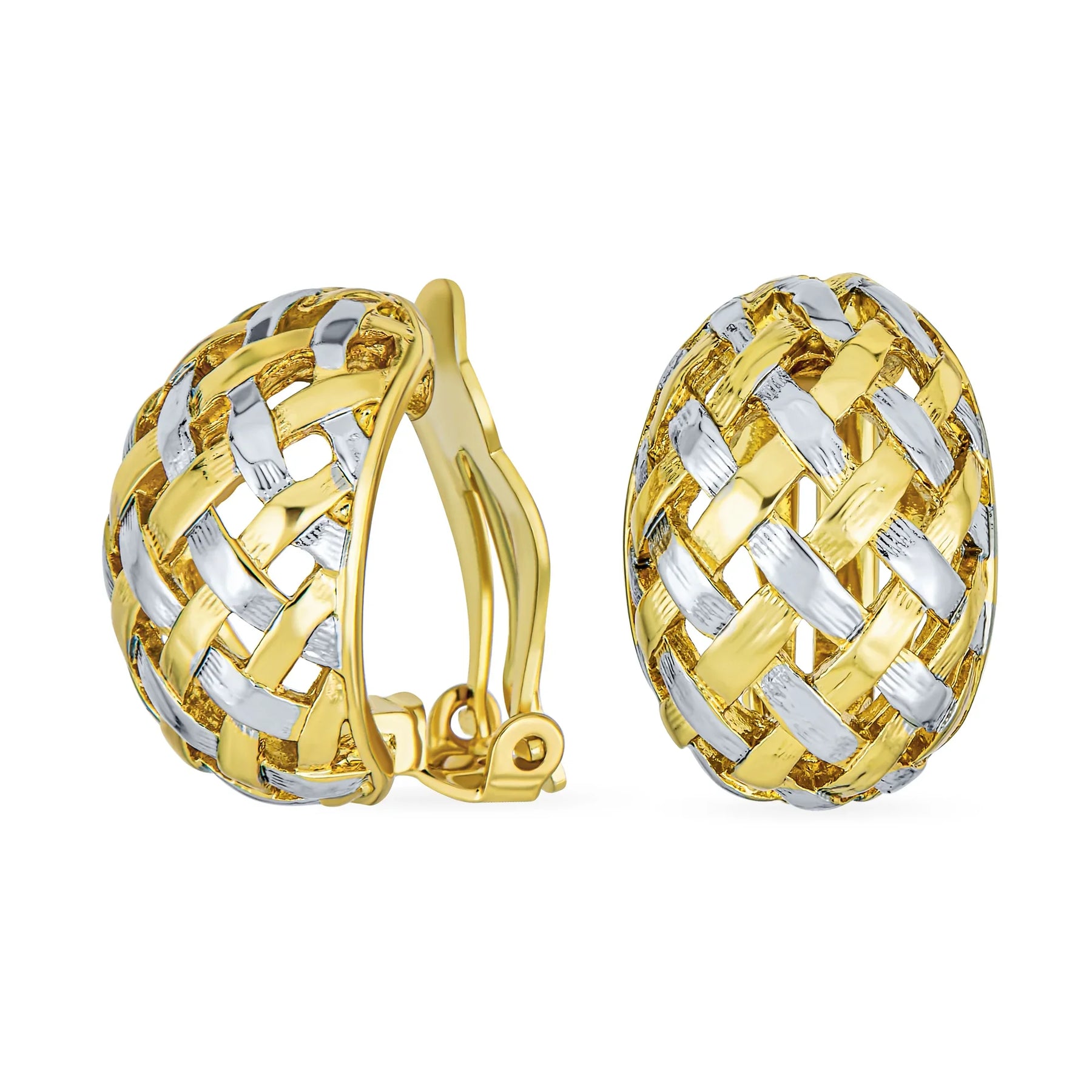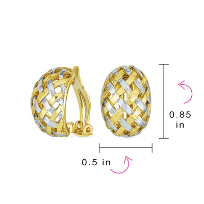 • Our newest Gold Plated basket weave half hoop earrings are versatile and elegant. Crafted in a timeless, braided pattern, they are chic this season. These fashion clip-on earrings are a perfect addition to your jewelry box. Looking for trendy, classic earrings? These woven half hoop clip-ons are ridged and textured. They frame your face stylishly. These clip earrings for women enhance any ensemble and your fashionable collection. Weighing just 9.0 grams, they are lightweight and comfortable. No pierced ears needed with clip-on backs. Gift these stylish clip earrings for women on special occasions.