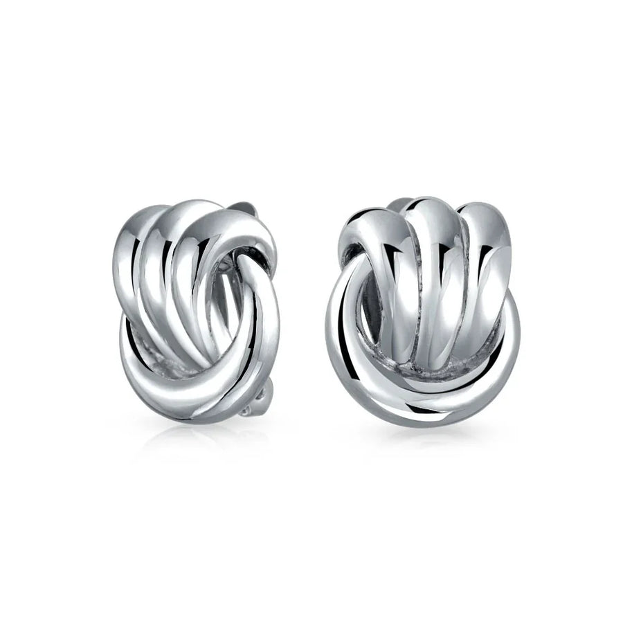 - Knot your average clip on earrings. These rhodium plated base metal clip on earrings sport a nautical style thanks to the shiny gold plated knot design. clip earrings are great gifts for women with unpierced ears, and are a classic jewelry staple for any women's jewelry box. Material: Rhodium or Gold Plated Base Metal, Measure: 0.82 in L x 0.70 in W, Total Weight: 16.9 Grams