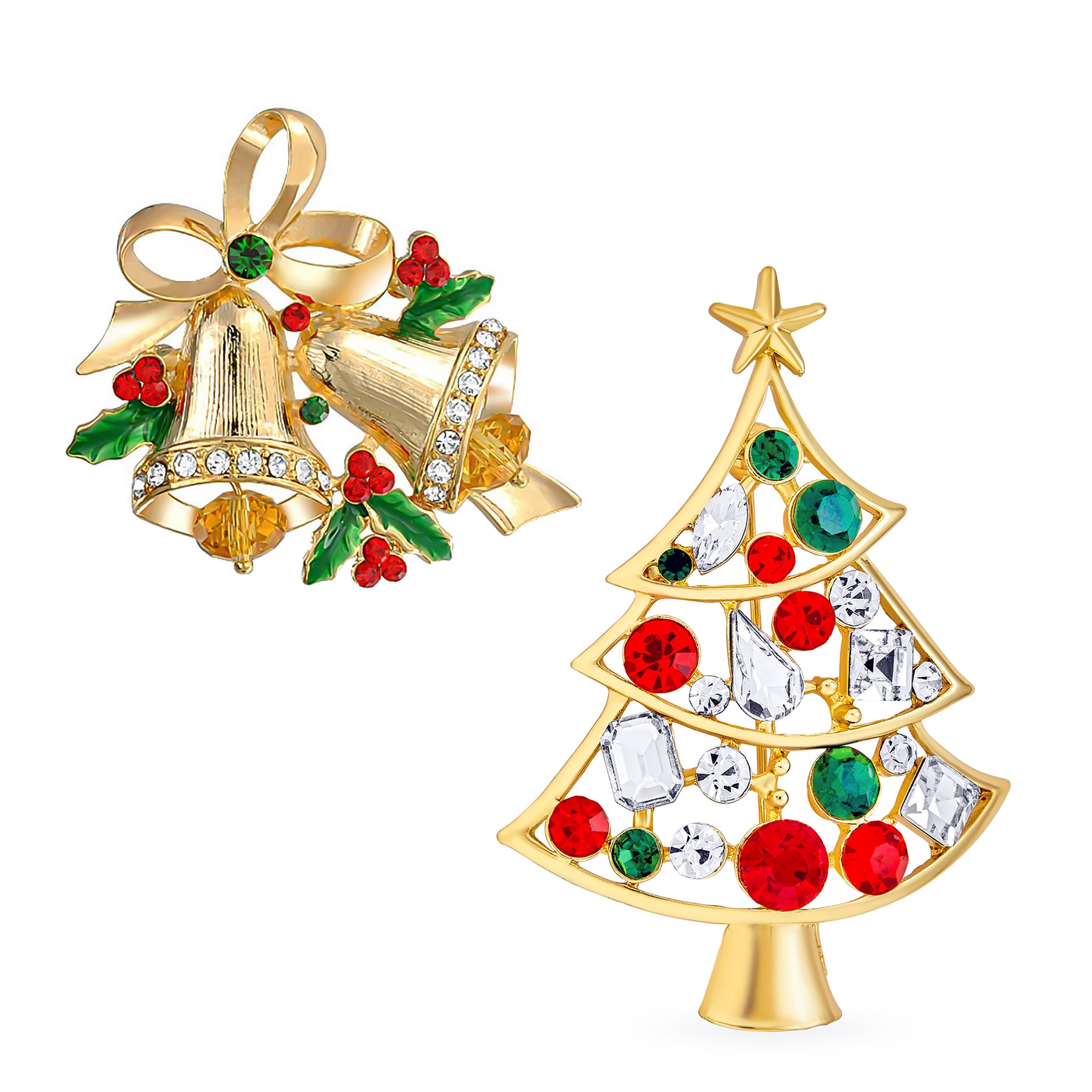 • Add a touch of holiday elegance to your ensemble or accessories with this set of 2 large Christmas tree and bells pins. Crafted with exquisite attention to detail, these gold plated brooches feature a stunning Christmas tree holly and berries motif adorned with sparkling simulated ruby and simulated emerald colored crystals. Perfect for adding a dazzling touch of winter magic to any outfit or accessory.