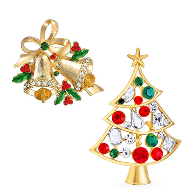 Set of 2 Large Colorful Crystal Christmas Tree and Bells Brooch Pin Gold Plated