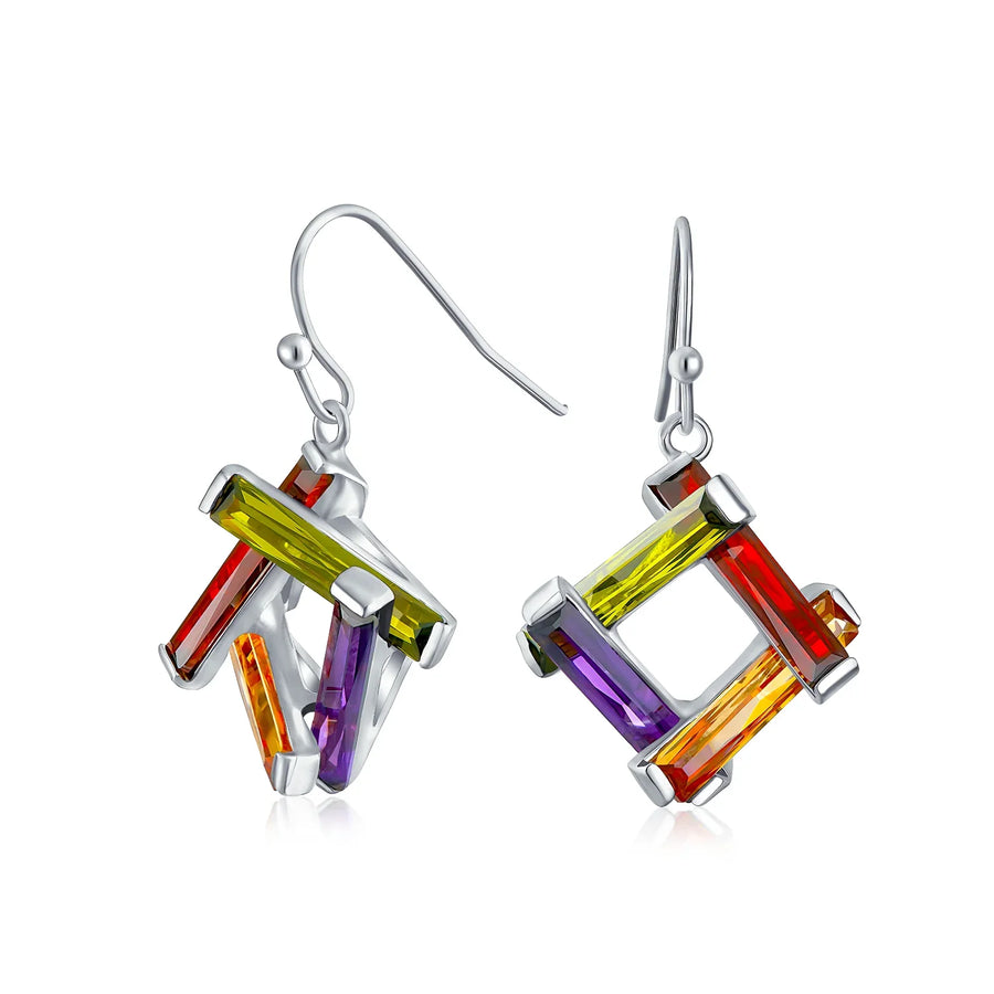 - Looking for unique, cool earrings to match your personality? These geometric dangle earrings feature fun, interesting designs. Four baguette-cut CZs form a square. Modern dangle earrings with Simulated Peridot, Garnet, Amethyst, and Citrine colors. Silver-plated with French wire backing. Perfect gift for birthdays or expressing love.