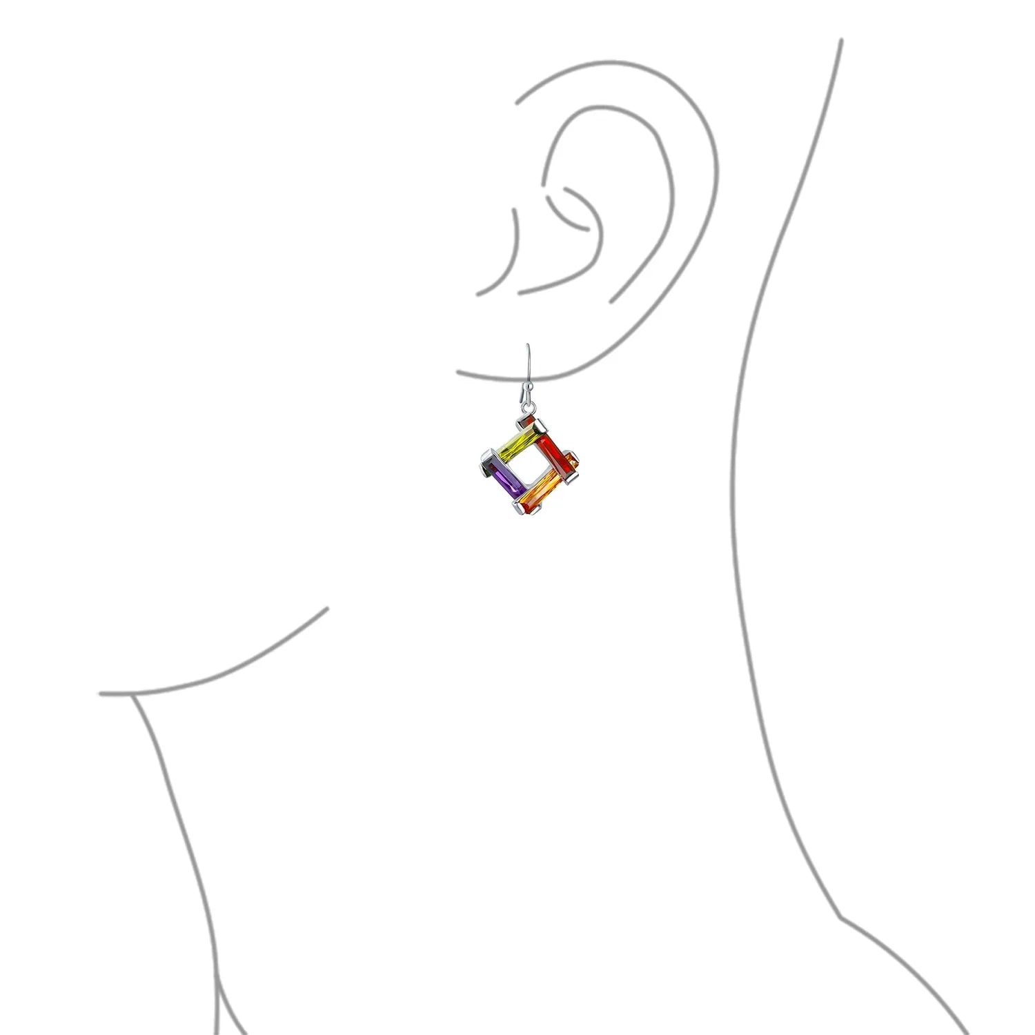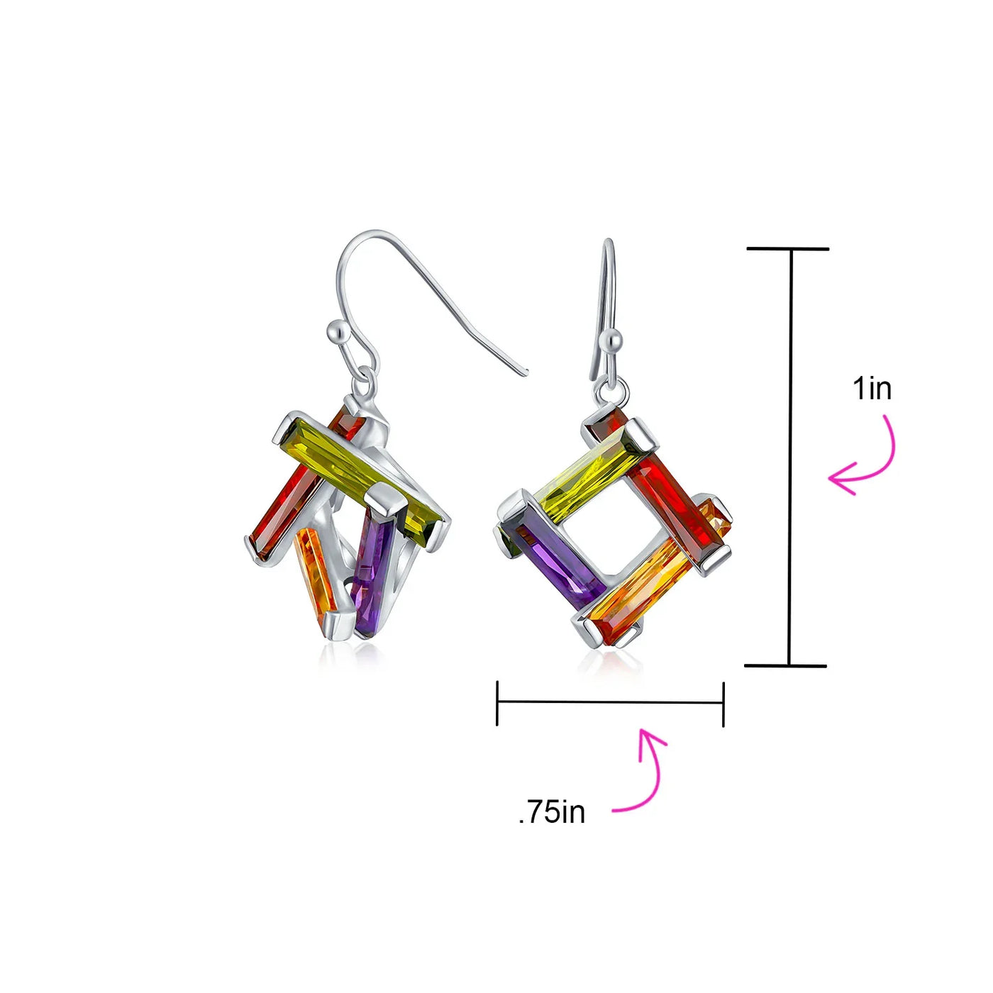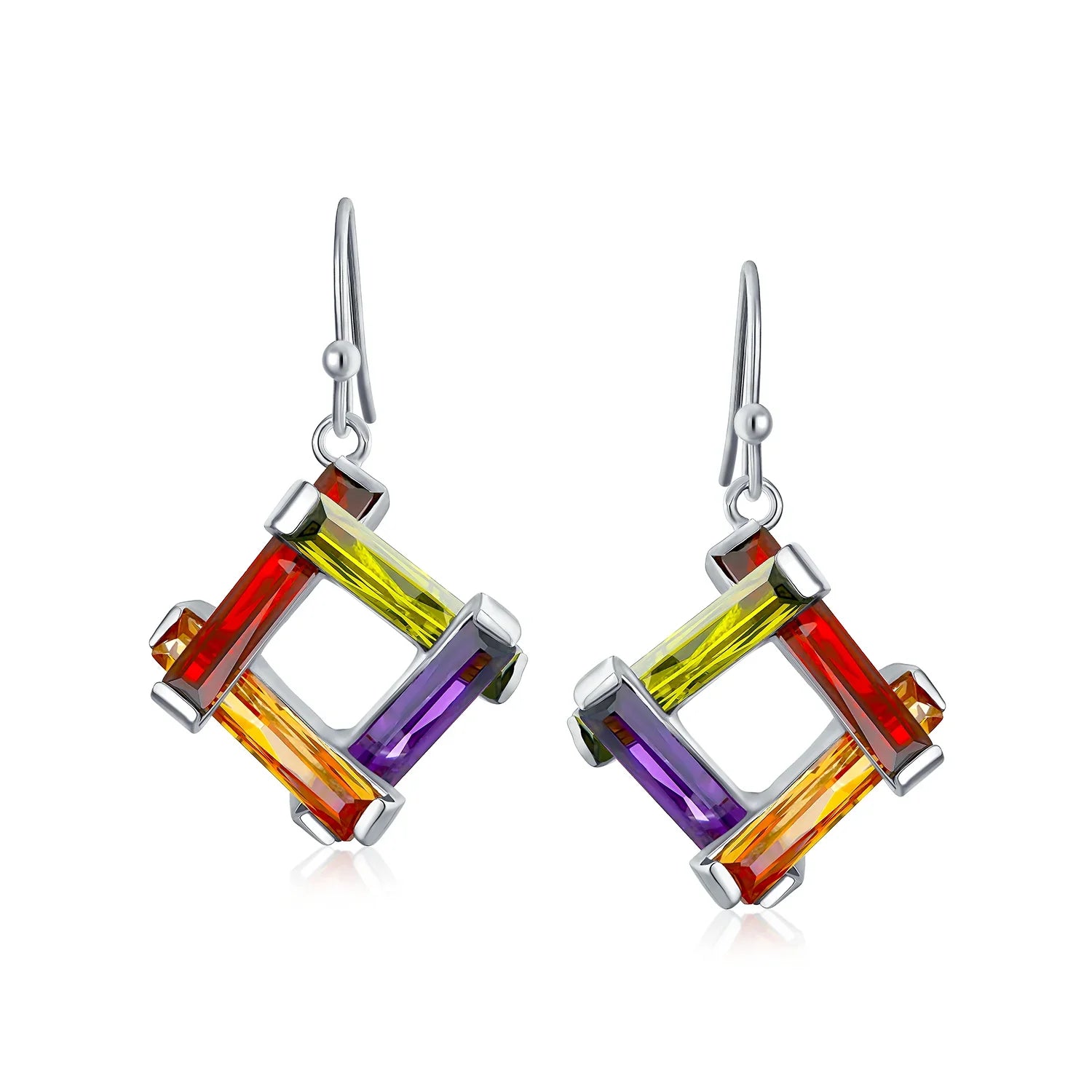 - Multicolored Eye- catching unique, express your style with pizazz with these sophisticated, geometric earrings. Featuring dazzling, multi color, baguette cut, cz squares accented with simulated green Peridot, simulated red garnet, simulated purple amethyst and simulated yellow citrine French wire back