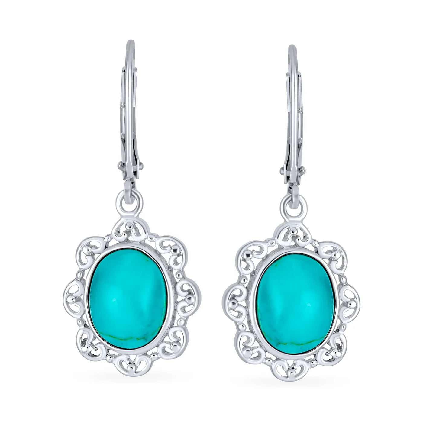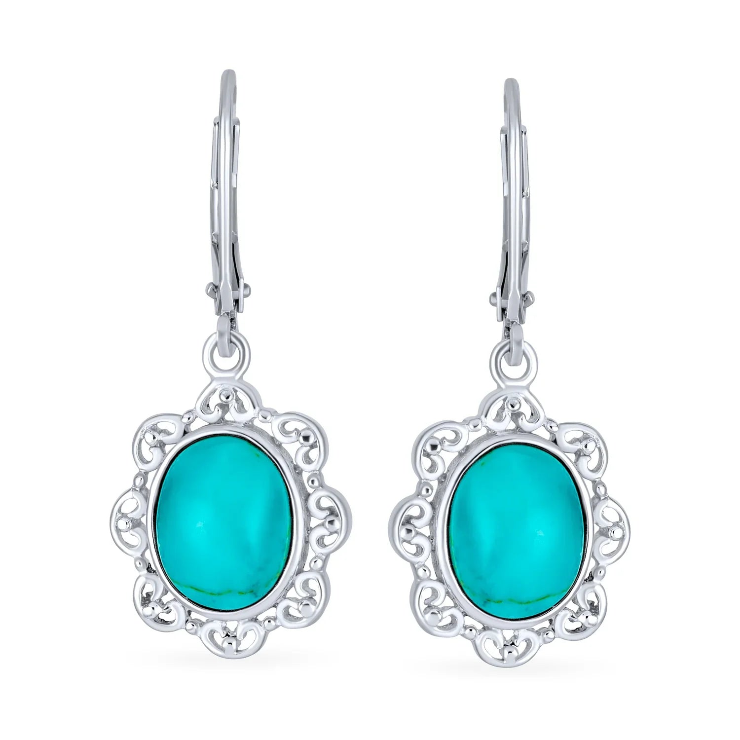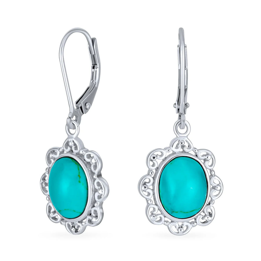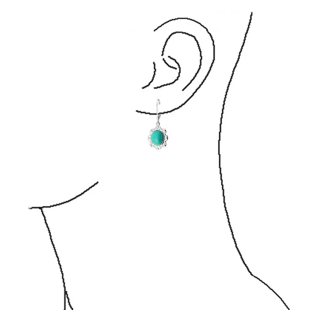 - Enhance your style with these stabilized turquoise oval drop earrings featuring a floral design. Perfect as a sparkling filigree gift for December birthdays.