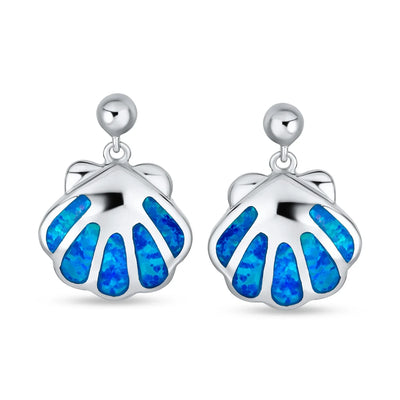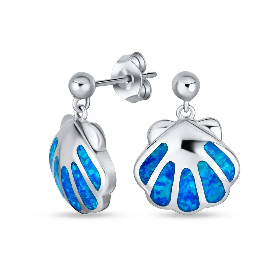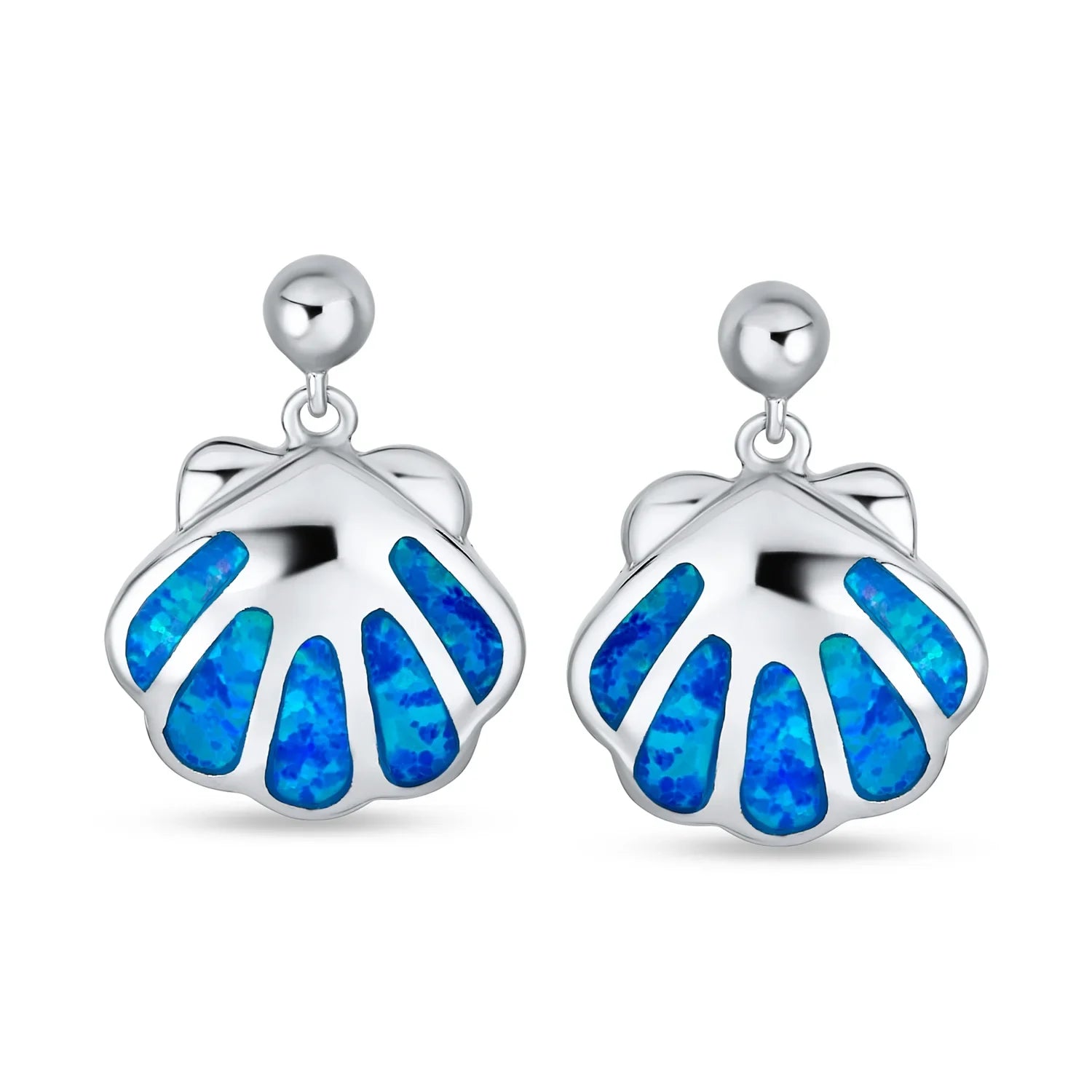 Created Blue Opal Dangle Gemstone Earrings Nautical Beach Clam Sterling Silver - Bling Jewelry