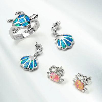 • Nautical Earrings - These exquisite dangling clam shell earrings showcase inlaid opals, capturing a stunning array of beach-inspired blue and green hues. Perfect for adding a touch of oceanic elegance to any outfit.