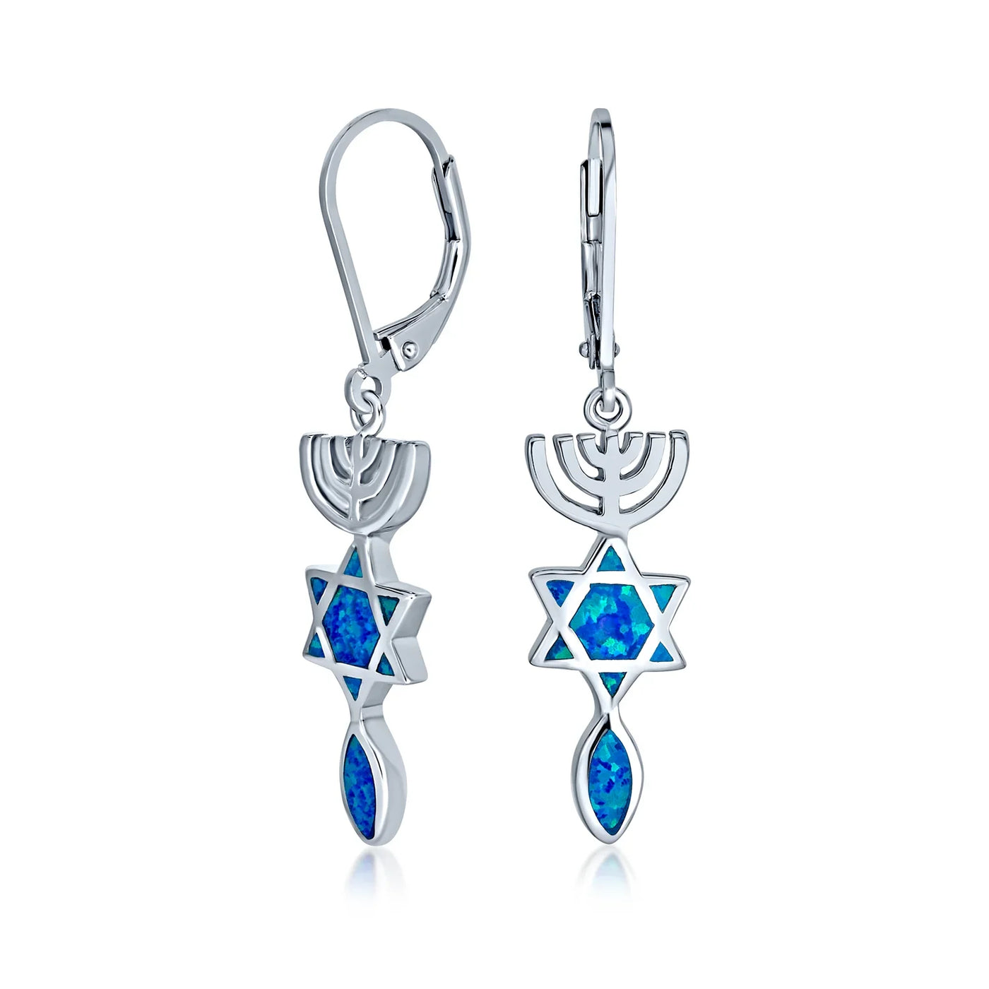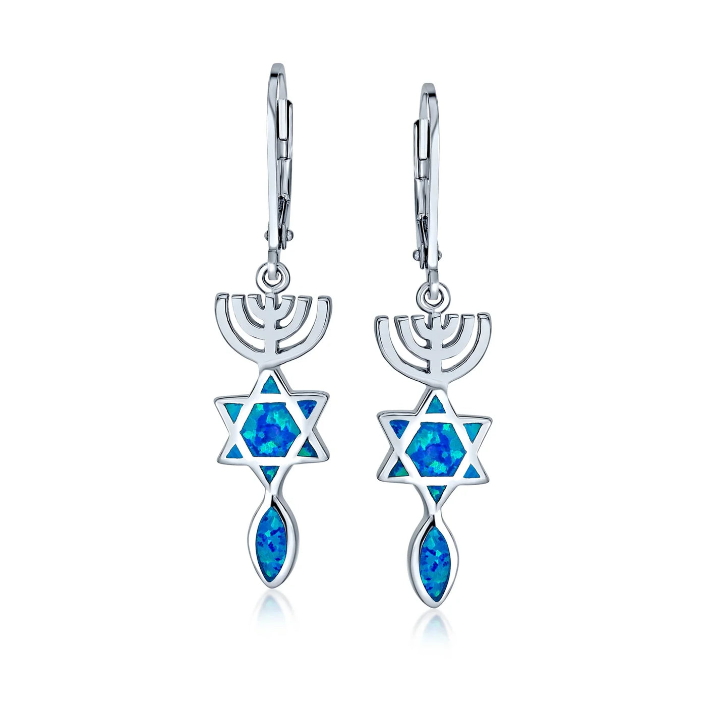 - Share your faith or heritage with these makes these opal gemstone Star Of David earrings, makes a great gift for October Birthstone, Bat Mitzvah, Passover or Hanukkah. Our stunning pair of Created Blue Opal Menorah & Star of David lever-back earrings flawlessly combines the classic hexagonal design with beautiful inlaid stones at each of its six points. These earrings stand out in the realm of religious jewelry, blending traditional aesthetics with a modern vibe.