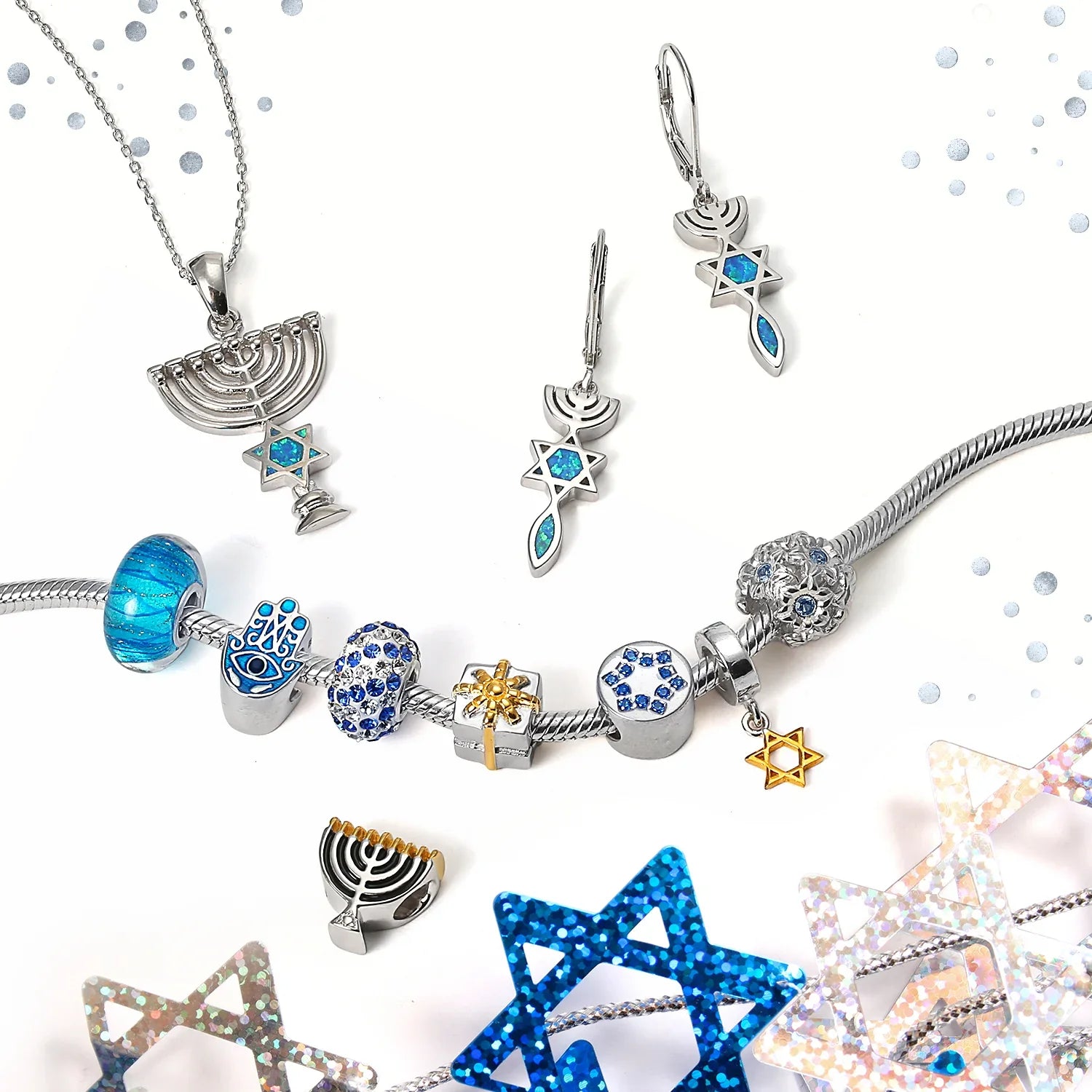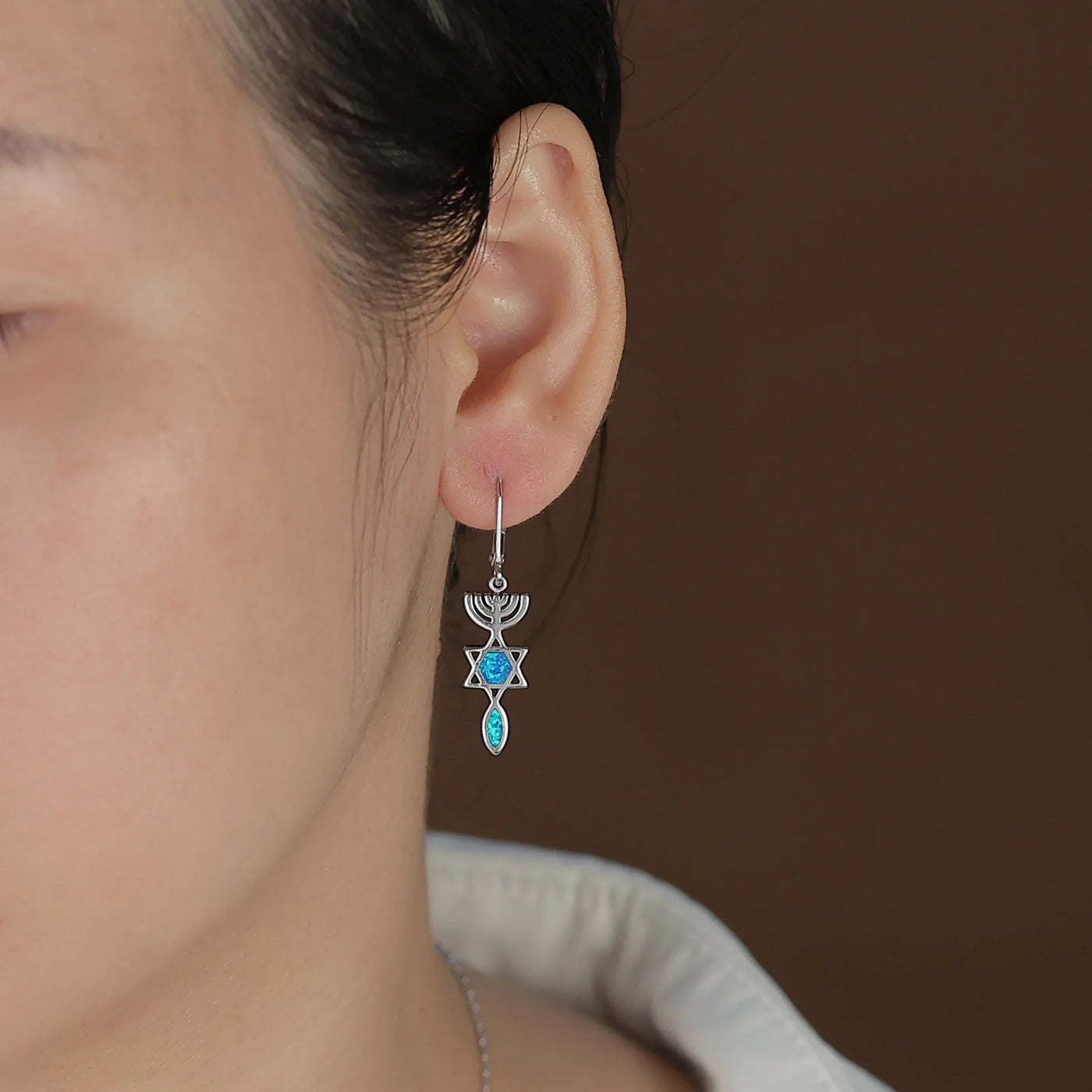 - Elevate your style with Hanukkah Menorah Blue Opal Star of David earrings in sterling silver. Perfect religious jewelry for women. Rhodium plated to resist tarnish, ensuring long-lasting shine. Express your faith with fashionable silver lever-back earrings. Ideal for gifting on holidays or October birthdays. Celebrate your faith in style all year round.