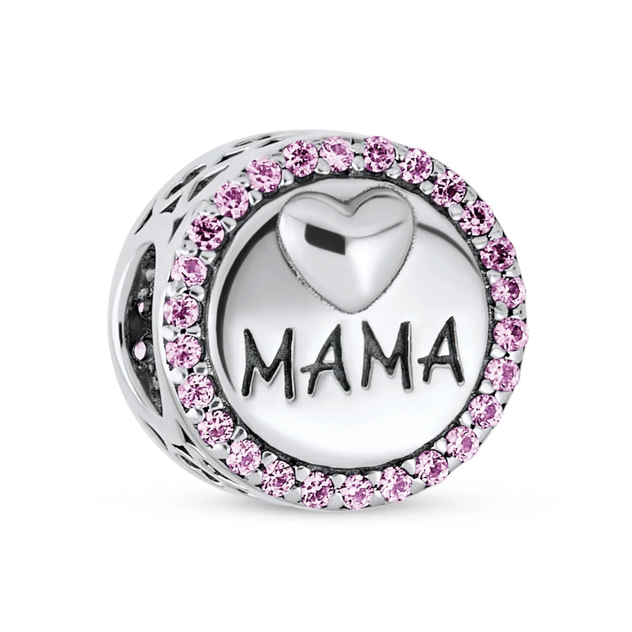 Round Pink Crystal Bead Charm MAMA Heart for Wife Sterling Silver Fits Bracelet - Bling Jewelry