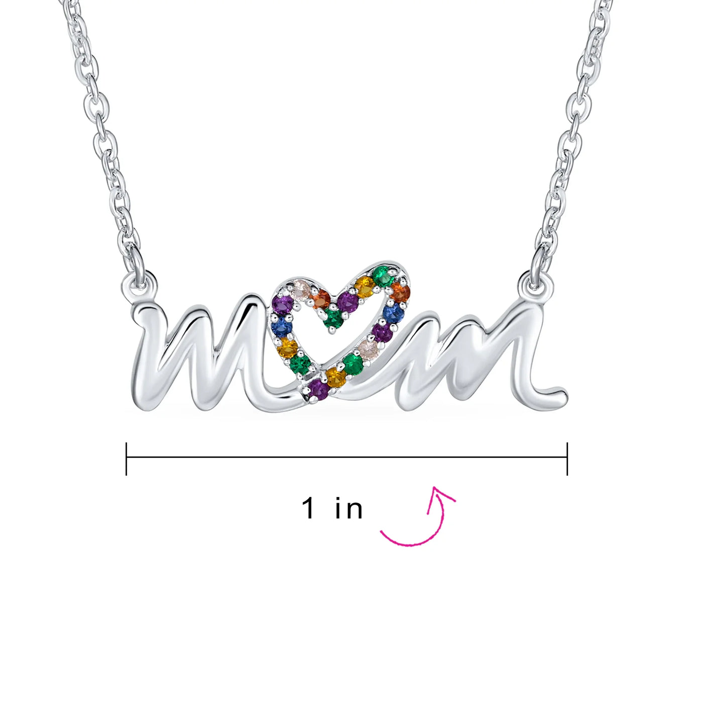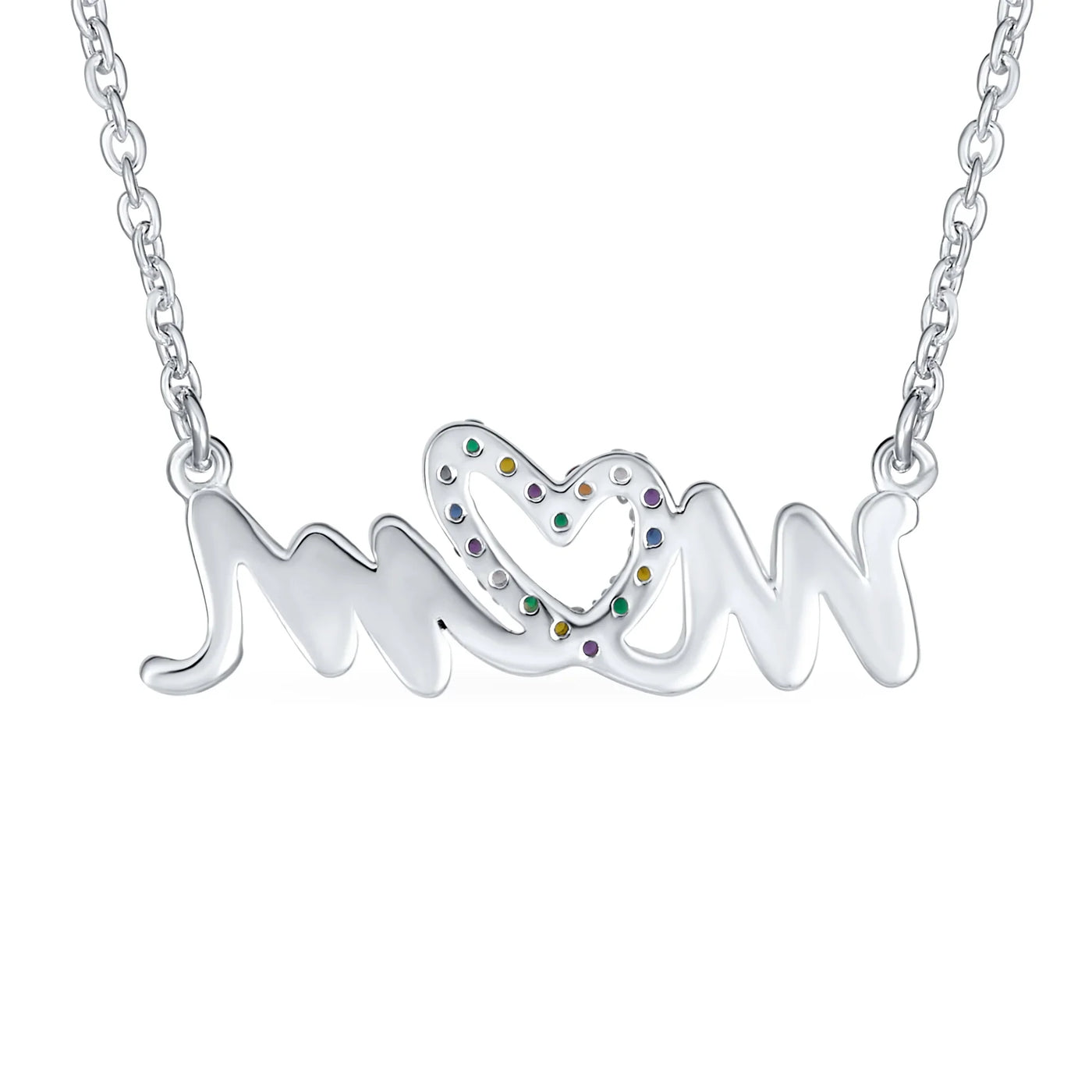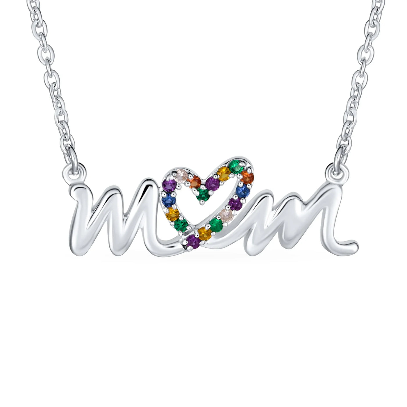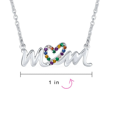 - HAPPY DESIGN - An ideal present for Mothers Day, this darling chain necklace features a cursive message of "MOM," stunningly crafted in lustrous .925 sterling silver. Colorful crystal heart creates the O in MOM for extra sparkle. Perfect gift for your loving Mommy.