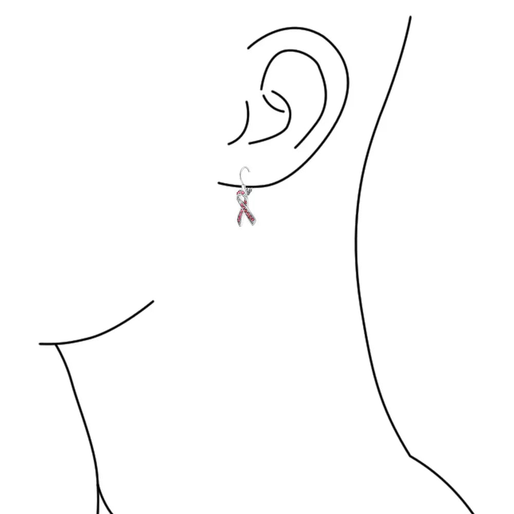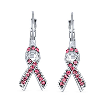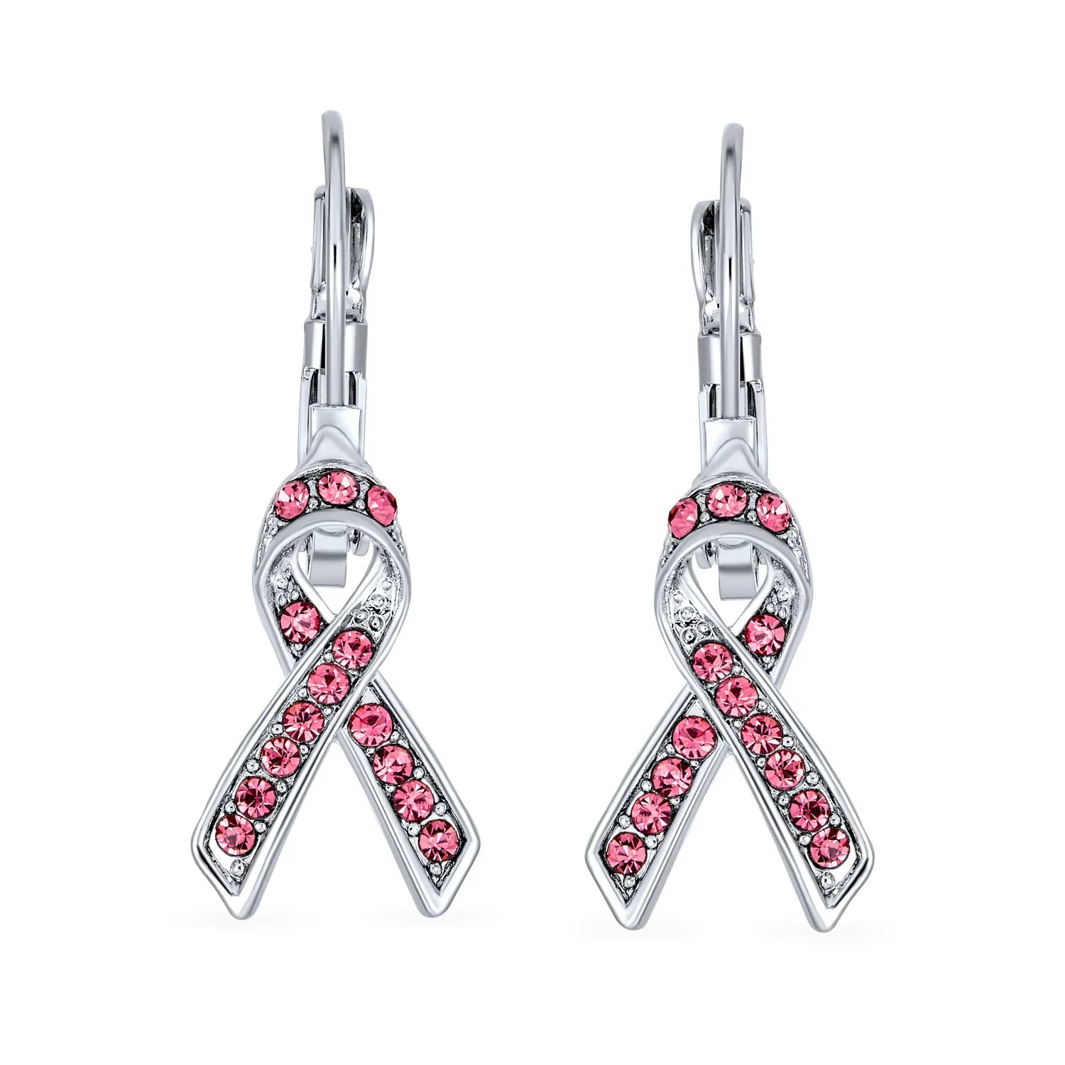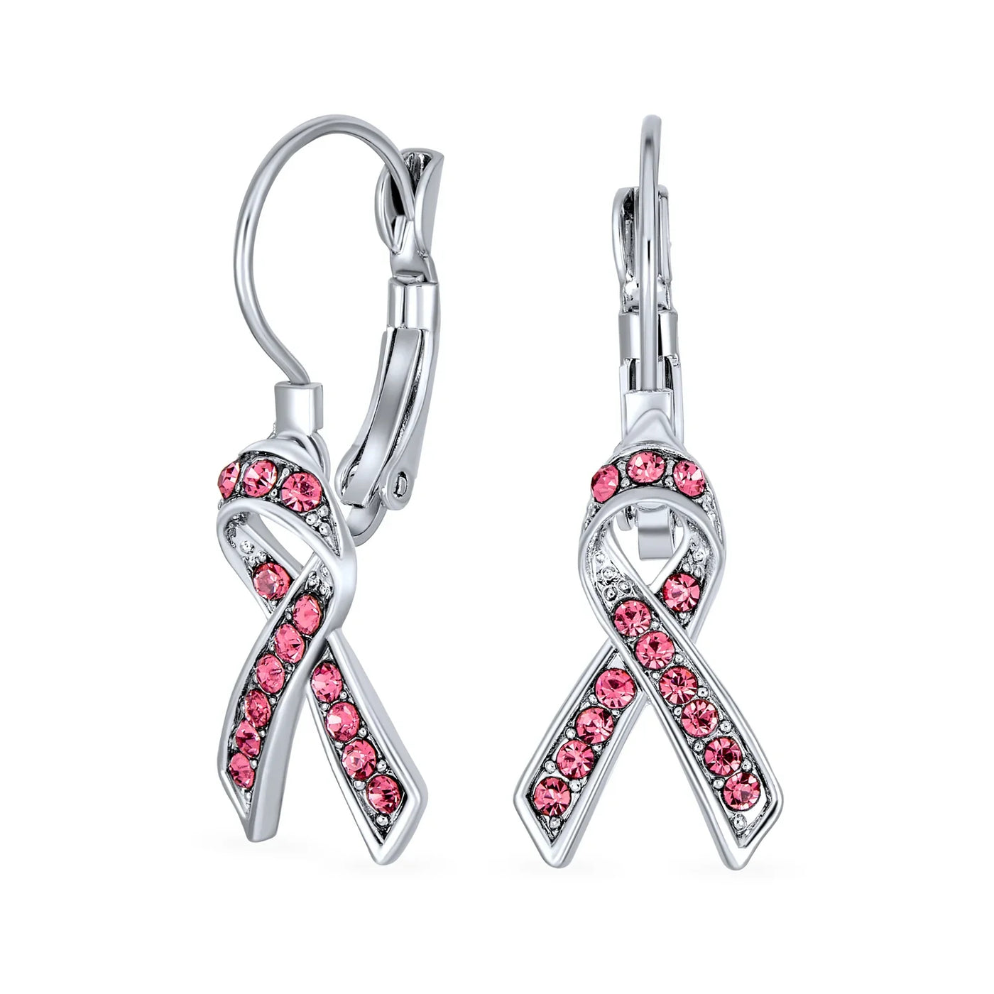 - breast cancer awareness is a cause close to many hearts. Join a caring community with these pink ribbon earrings. Gorgeous pink crystals bedazzle the inside of these breast cancer ribbon drop earrings. A chic lever back keeps them secure. Made from alloy, these crystal lever back earrings are rhodium plated to resist tarnishing. These pieces of cancer awareness jewelry will keep on shining. Whether a survivor or supporter, these pink dangle earrings show your passion. Designed for pierced ears only, they make a wonderful gift for you or loved ones.
