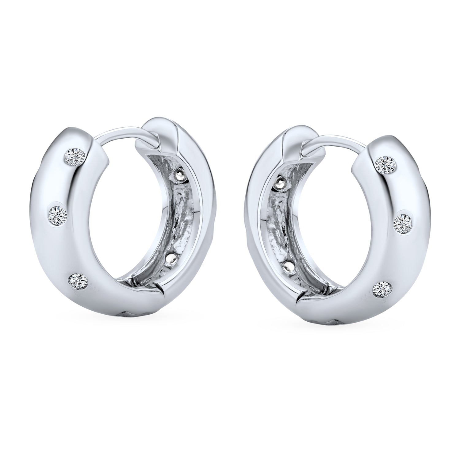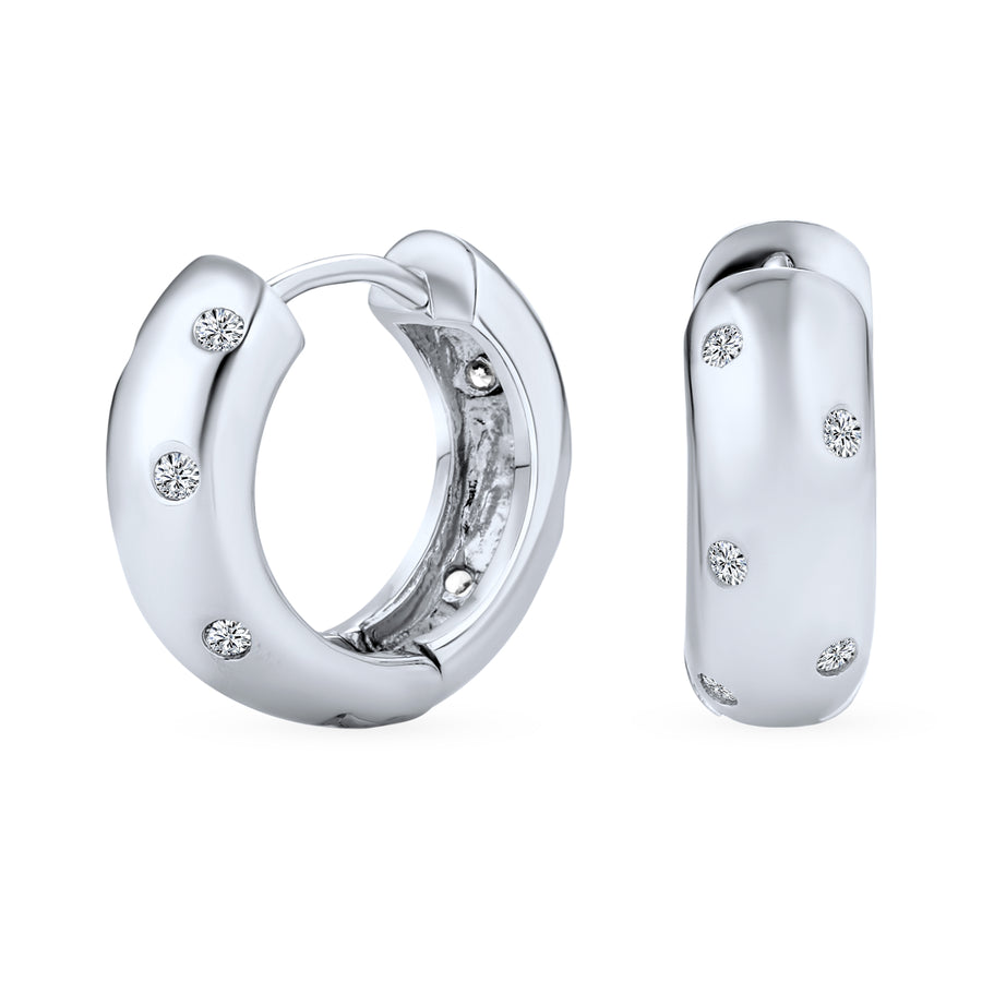 - These .925 sterling silver cubic zirconia huggie hoop earrings feature an etoile motif. Each earring has eleven dazzling stones. Polished to a shiny finish, they sparkle beautifully. Versatile and stylish, wear them with any outfit. Rhodium plated to resist tarnishing, perfect for day or night.