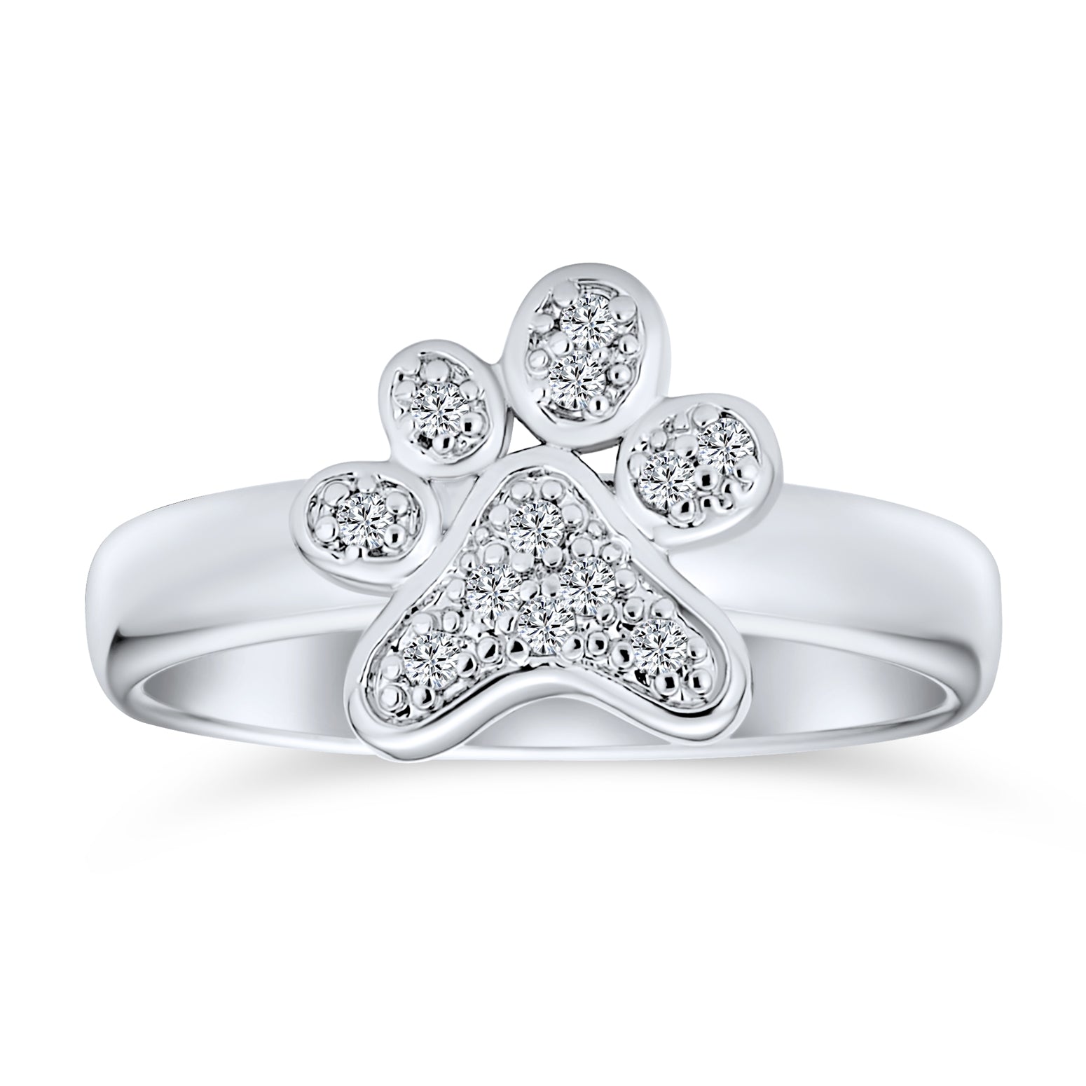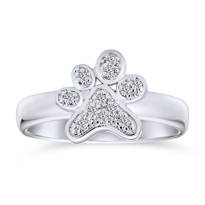 - animal lovers take note. Our newest silver paw print ring was designed with you in mind. Fashioned out of clear, shimmering CZs designed to resemble an animals paw print, our pave cz animal paw print ring will make a perfect gift for both dog and cat lovers alike. Add a little sparkle and fun to your look when you wear cz animal jewelry for people. Silver stackable rings are an easy, playful way to add a little extra style to your everyday and remind you of the pets you love. Pair this paw print jewelry with other stackable rings to mix and match themes and add some whimsy to your style. Our cz silver paw print ring has been rhodium plated to resist tarnish and keep its highly polished look for many years to come. Show off your love for animals along with your good taste with this purchase.