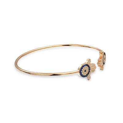 - Ward off bad luck stylishly with this evil eye bracelet . The Hamsa and evil eye symbols protect against misfortune. Crafted from rose gold plated sterling silver, it features two blue CZ stone evil eyes for added protection and sparkle.