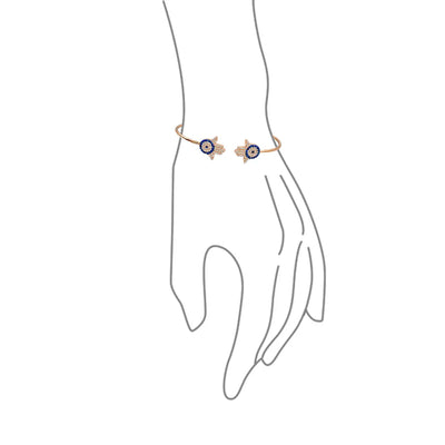 - Add mystical beauty to your look with the spiritual aura of this chic rose gold plated .925 silver, cuff bracelet. Highlighted by a brilliant, Hamsa hand motif with a blue, evil eye design accent. Shimmering Cz embellishment adds a touch of glam.