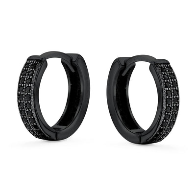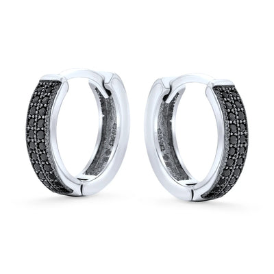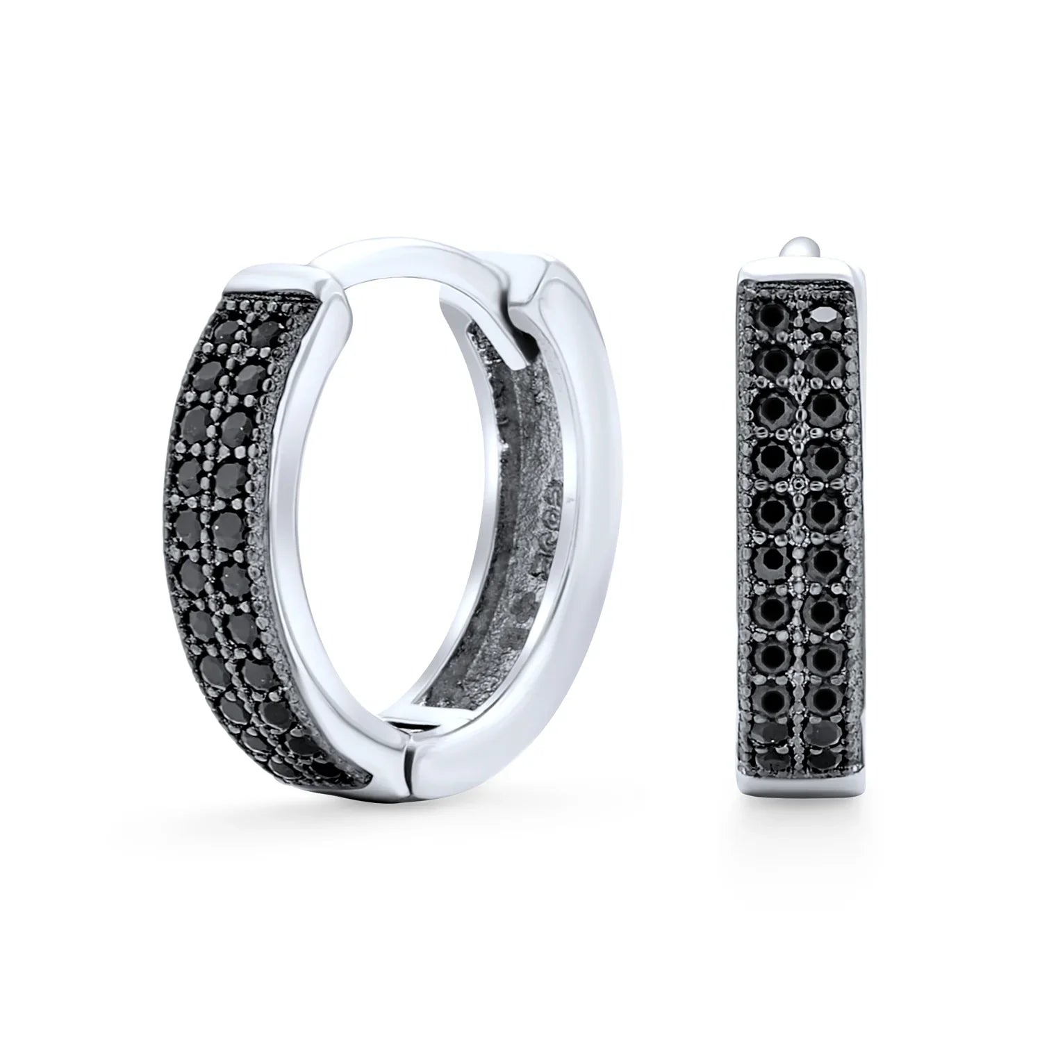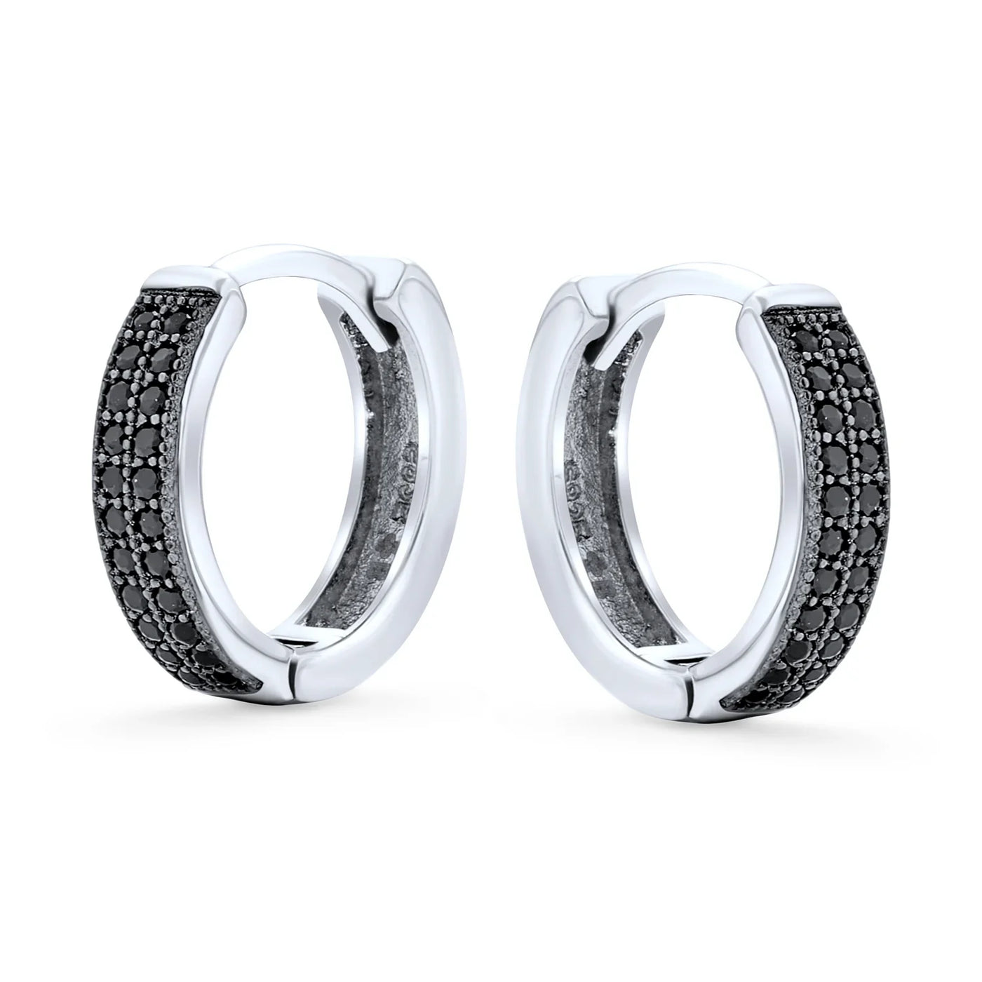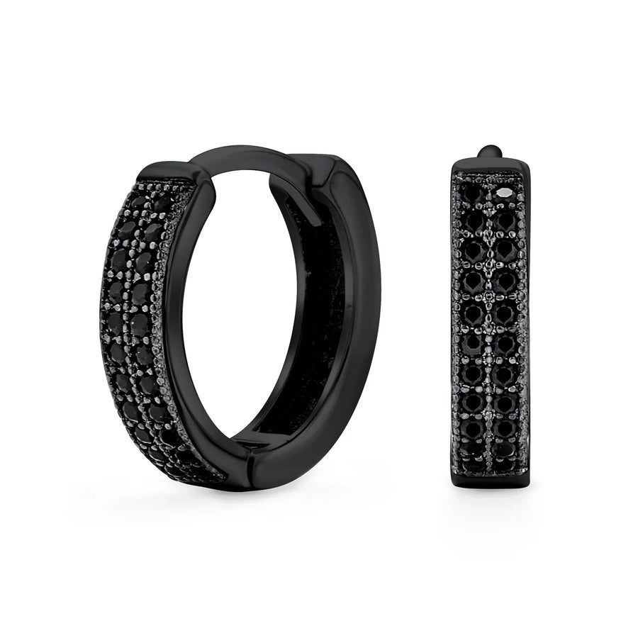 - Shine in style with Micro Pave Simulated Black Onyx CZ Huggie Hoops. Crafted from .925 rhodium plated sterling silver, these men's earrings feature two rows of micro pave black CZ stones. Versatile and perfect for gifting, they are ideal for jewelry lovers with pierced ears. Make your holiday shopping easy with these stunning CZ hoop earrings.