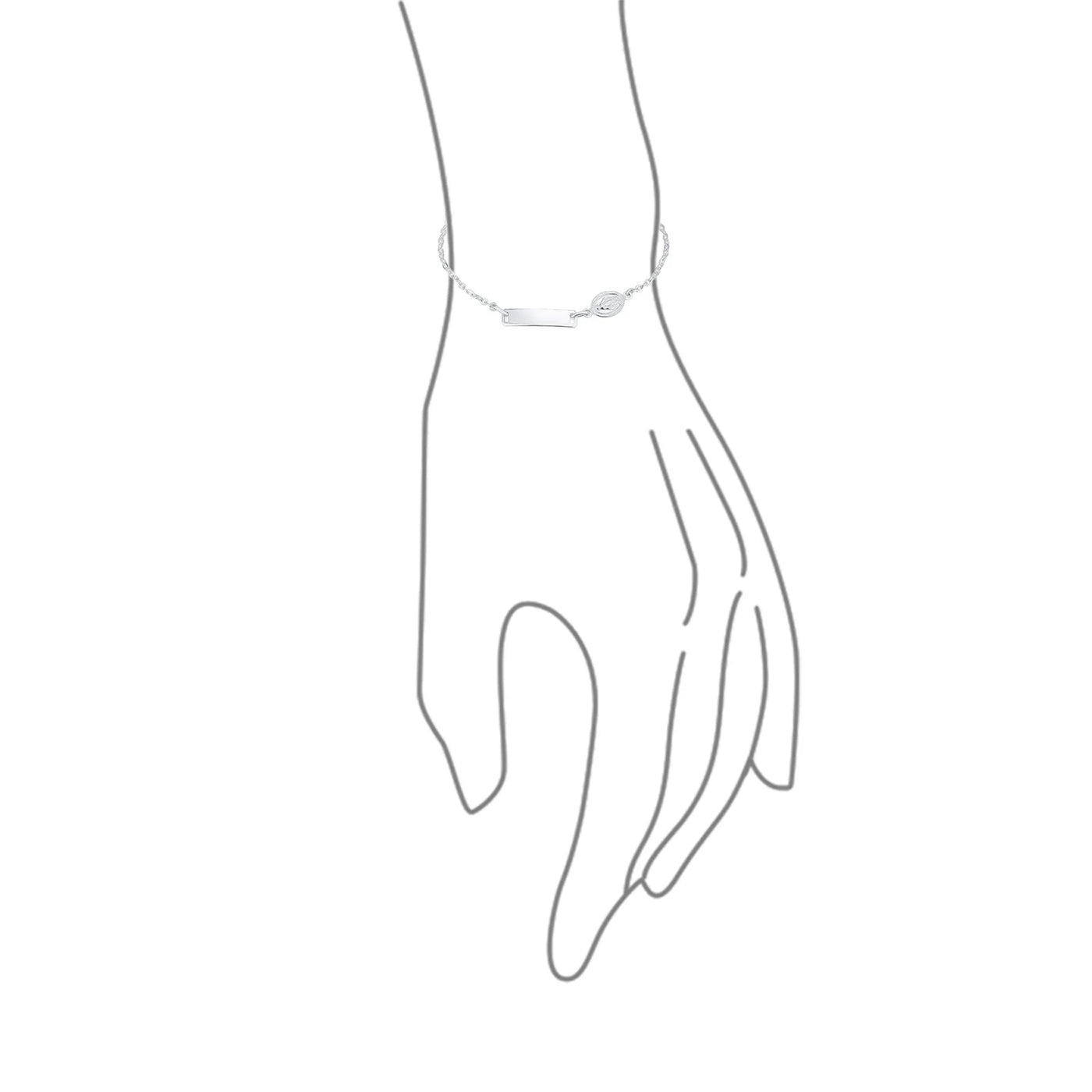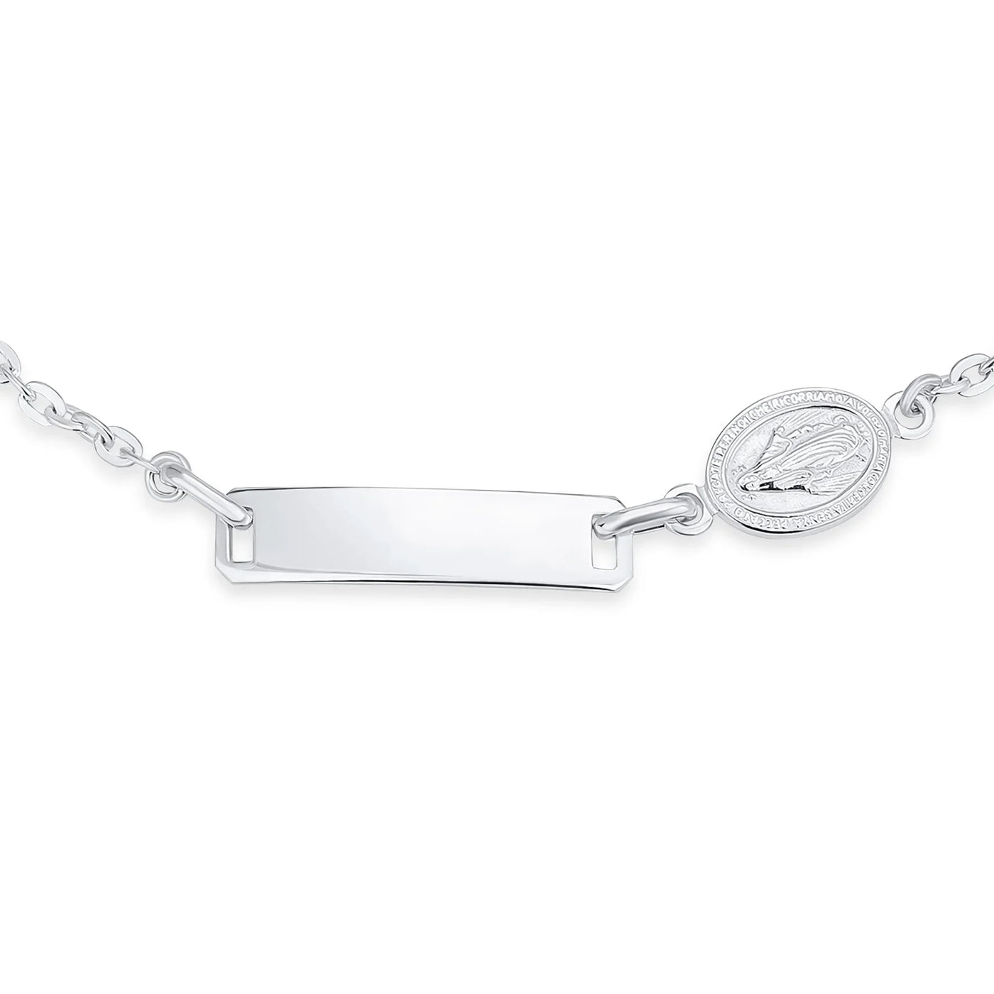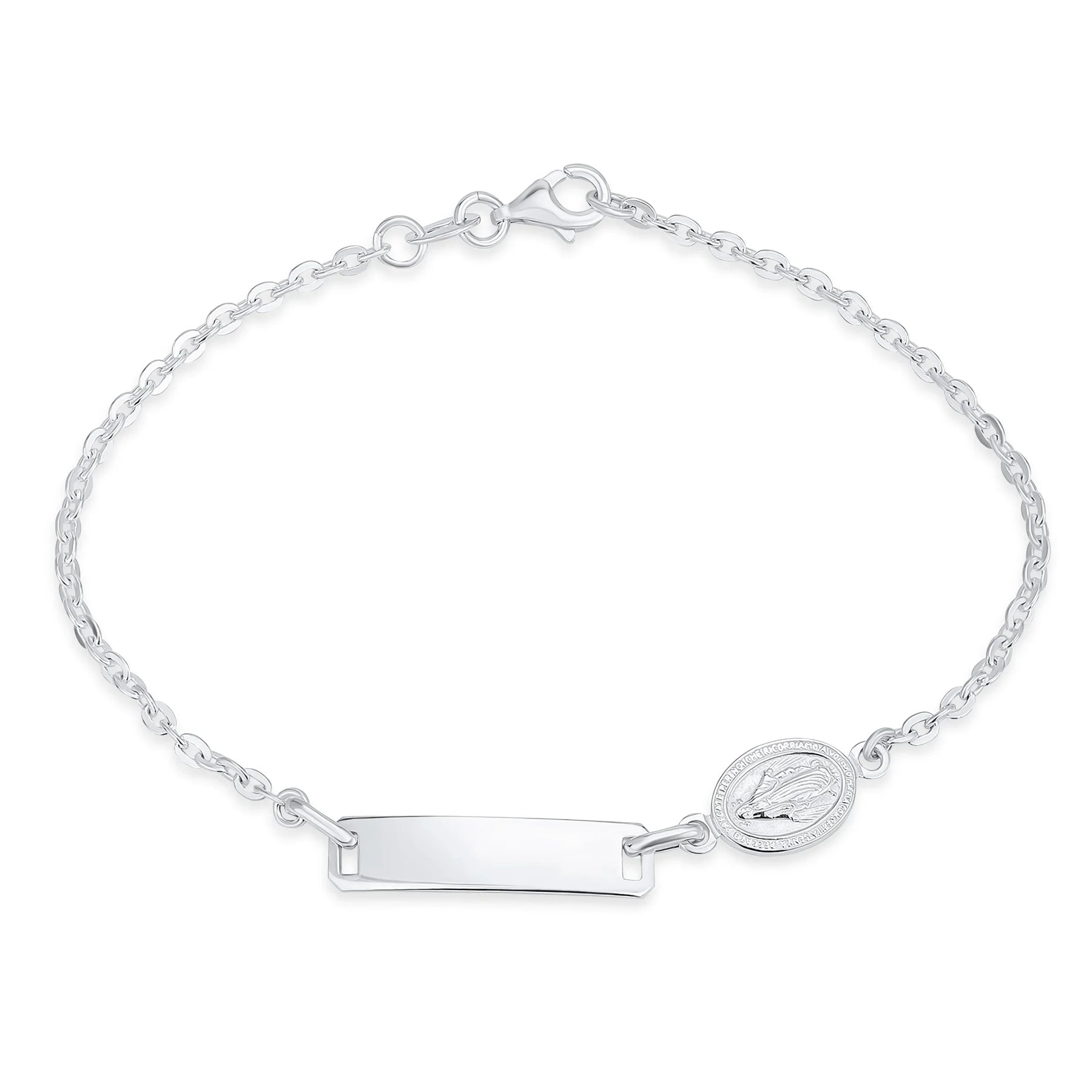 - Discover our stunning silver Virgin Mary religious ID bracelet, crafted from premium .925 sterling silver. The delicate Figaro link chain adds elegance. Secure spring ring clasp ensures style and functionality. Perfect for a 7-inch wrist, it features a customizable ID tag. Ideal personalized birthday or holiday gift.