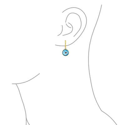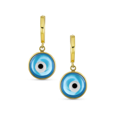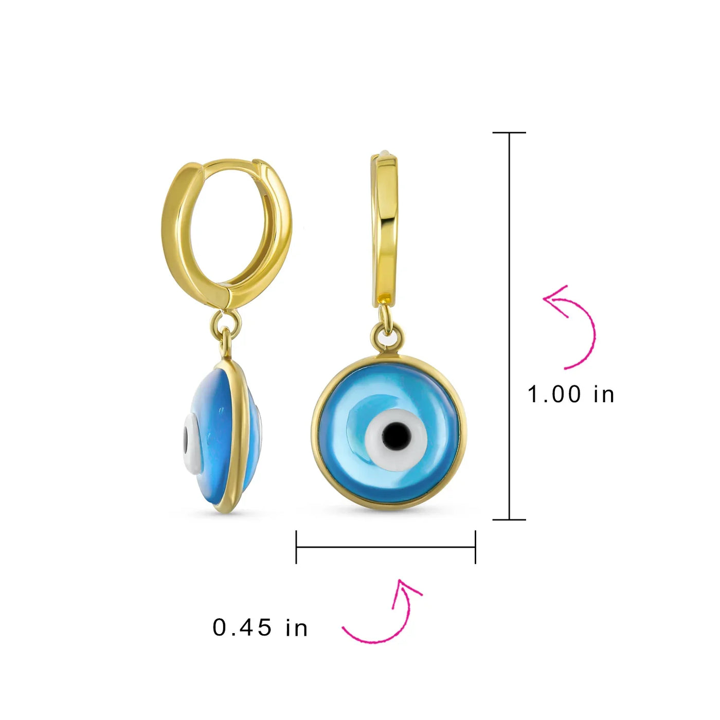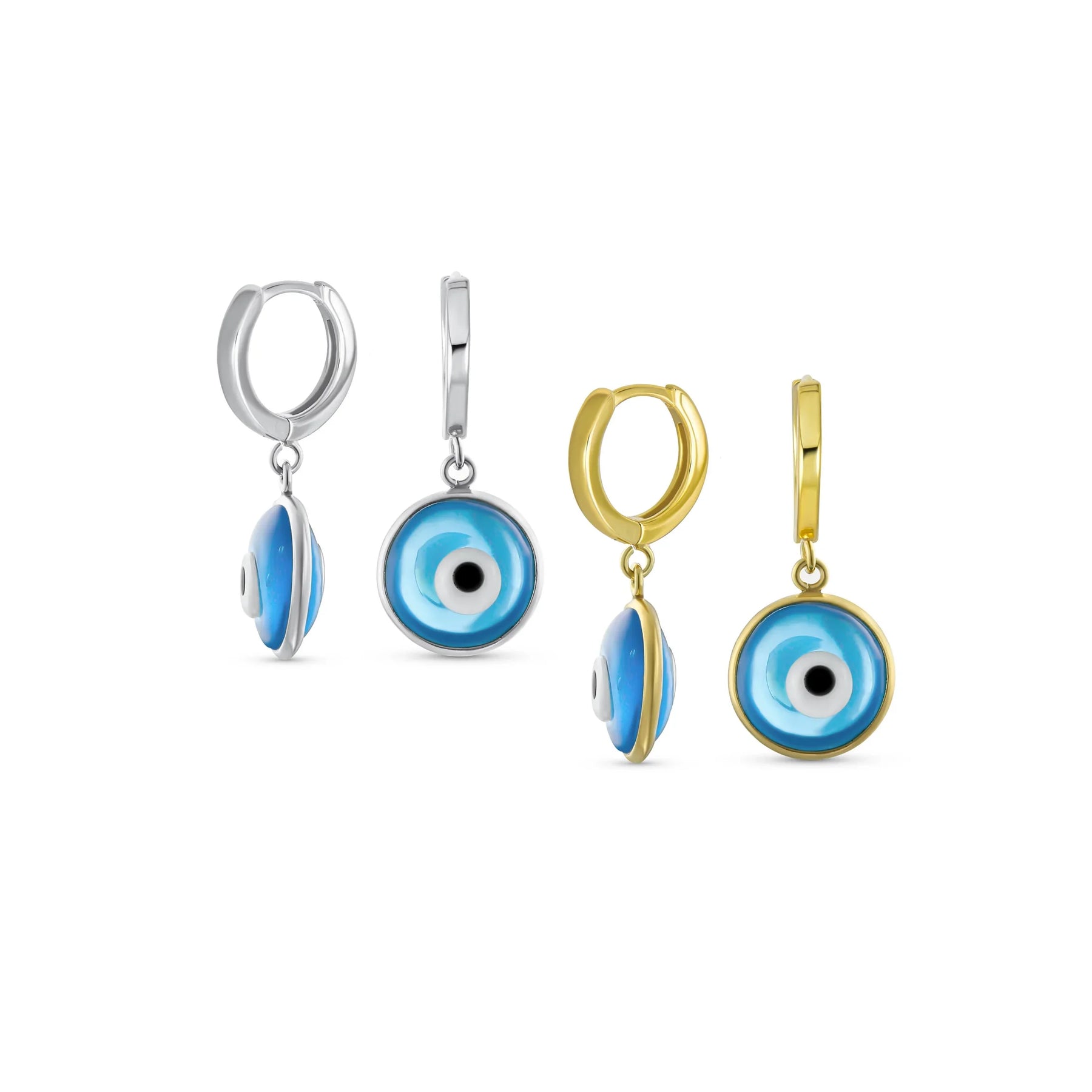 - Introducing our stunning Evil Eye Blue Dangle Earrings, a chic blend of style and mystique. Crafted with care, these enchanting earrings feature a remarkable round glass blue evil eye, surrounded by stunning .925 sterling silver. Inspired by ancient Middle Eastern beliefs, these delicate earrings offer a touch of protection. Feel confident and turn heads with their unique, trendy look. Perfect for special occasions or everyday glamour. These fashionable evil eye studs are the ideal accessory. Looking for a thoughtful gift? These earrings make a perfect present, embracing the beauty and symbolism of the evil eye. Give the gift of style and protection with these exquisite earrings.