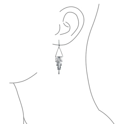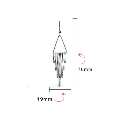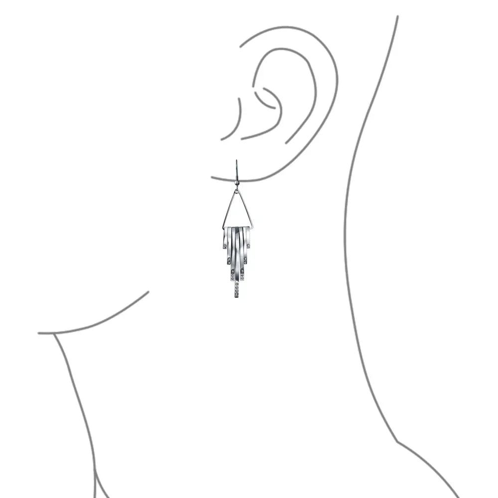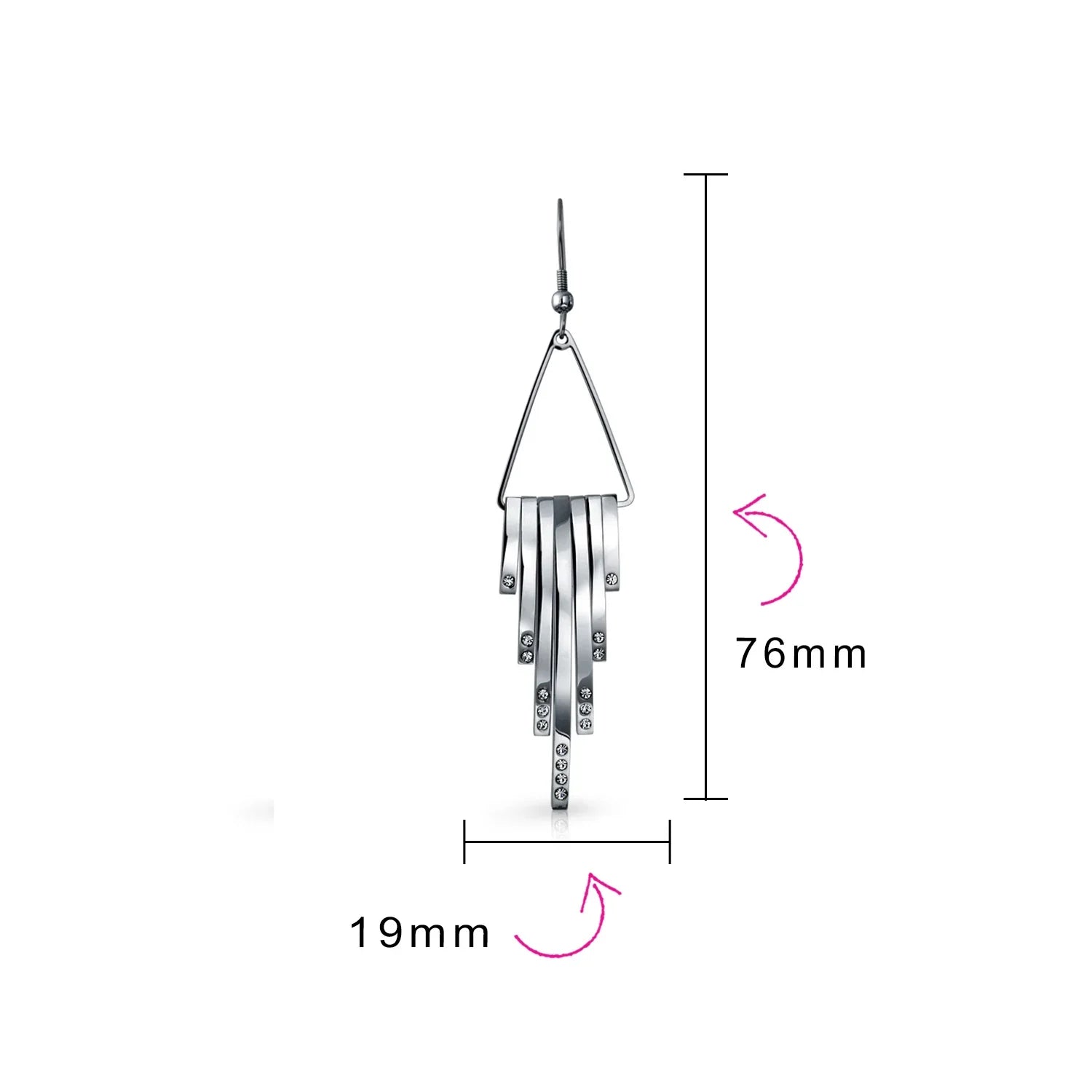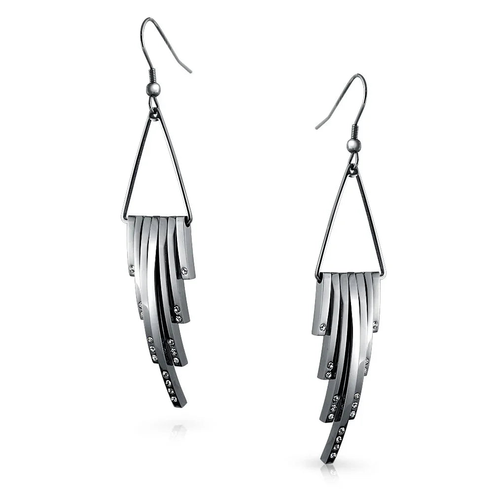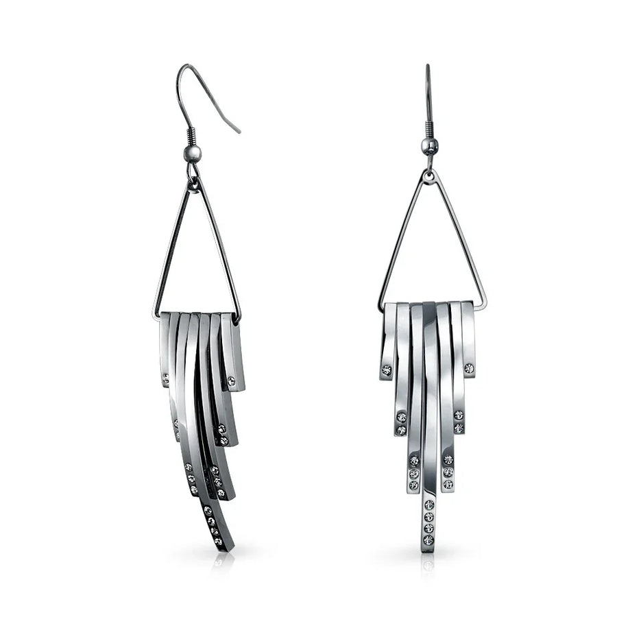 - Make a striking, art deco inspired statement with these ravishing, stainless steel, long dangle earrings. Accented by a geometric fringe design with shimmering crystal accents adding alluring movement to any look.