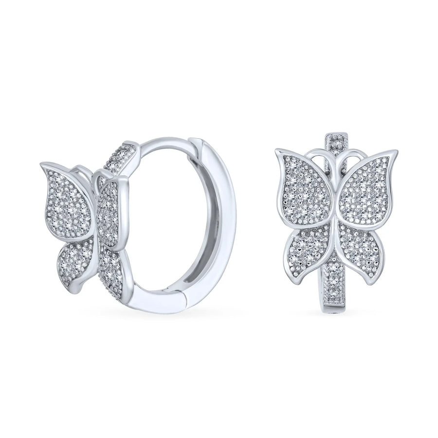 - Delicate and dainty butterfly jewelry is perfect for animal lovers. Our cubic zirconia hoop earrings feature a delightful butterfly design. These dainty silver hoops have pave-covered butterfly wings. Made from .925 sterling silver, they are rhodium plated to resist tarnish. Each earring has a secure hinge and snap closure. This lightweight, affordable animal jewelry is ideal for nature-loving friends with pierced ears.