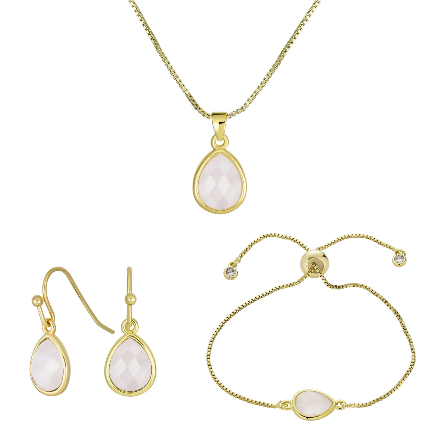 Delicate Rose Quartz Jewelry Set Earrings Bracelet & Pendant in 18K Gold Plated