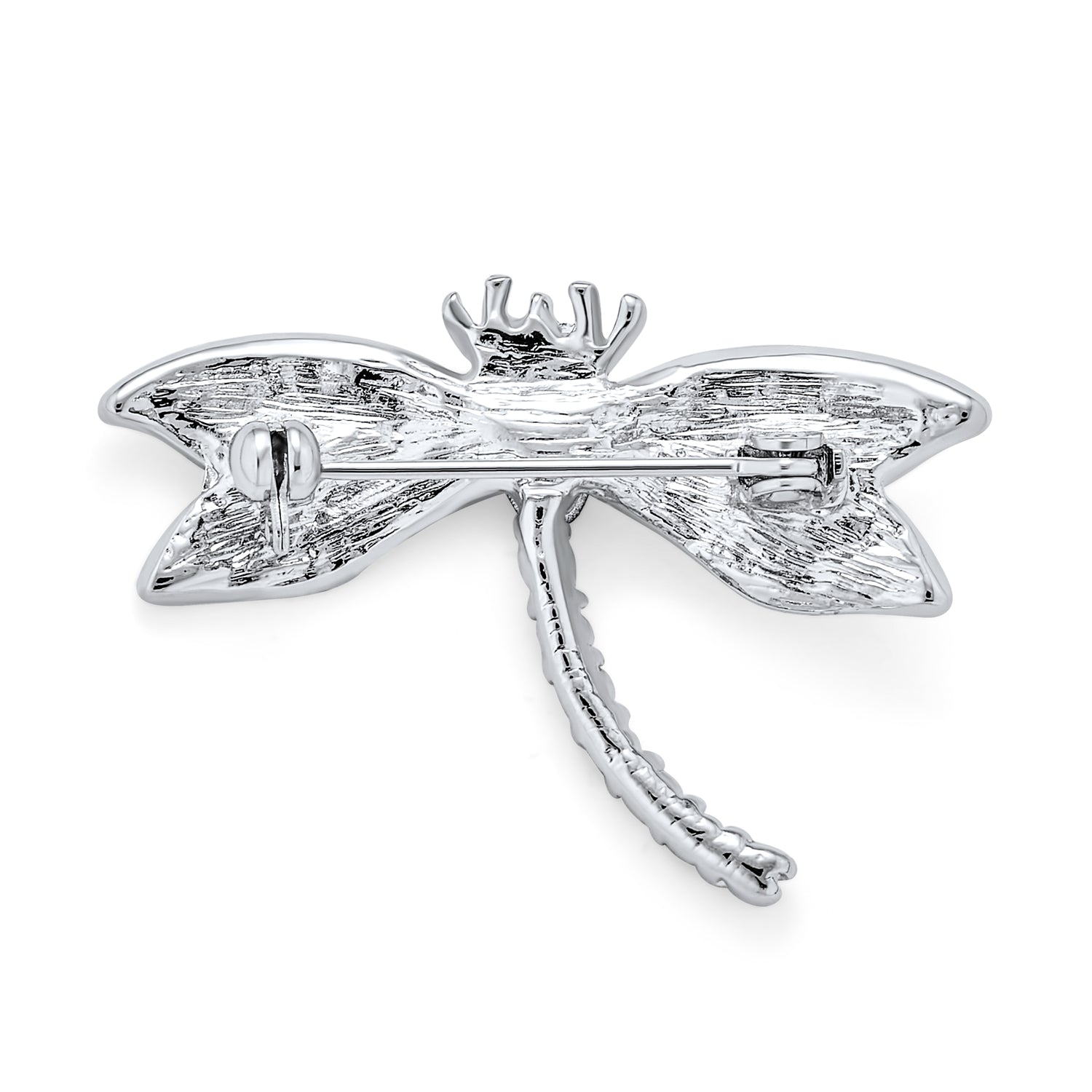 - This exquisite vintage-style Brooch features a chic dragonfly design. Rhodium-plated brass and CZ, intricately detailed with clear CZs on wings. The tail glows with simulated sapphire blue and clear cubic zirconia, ending in a glittering blue oval CZ.