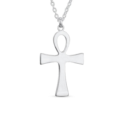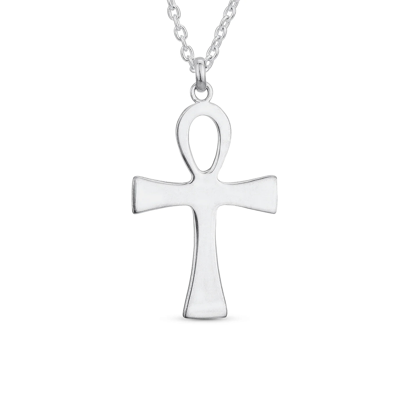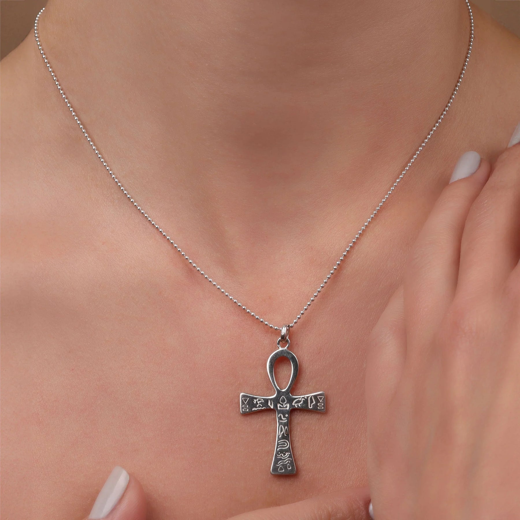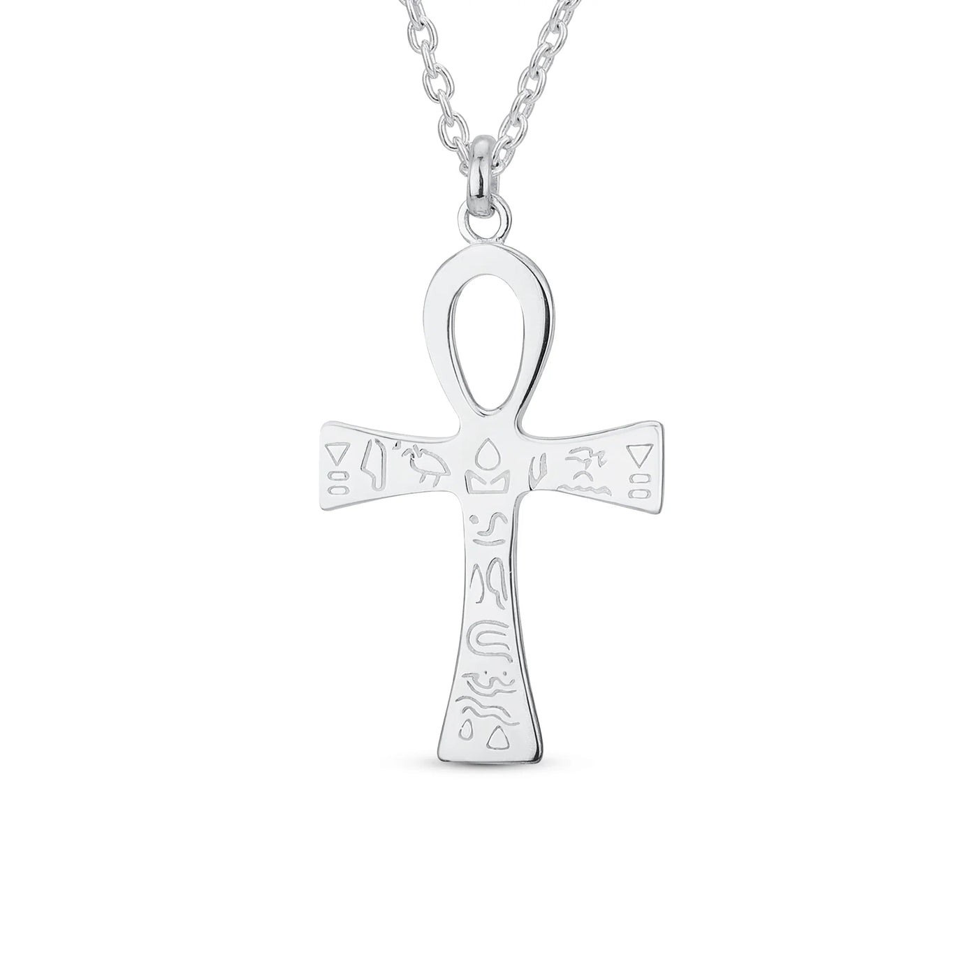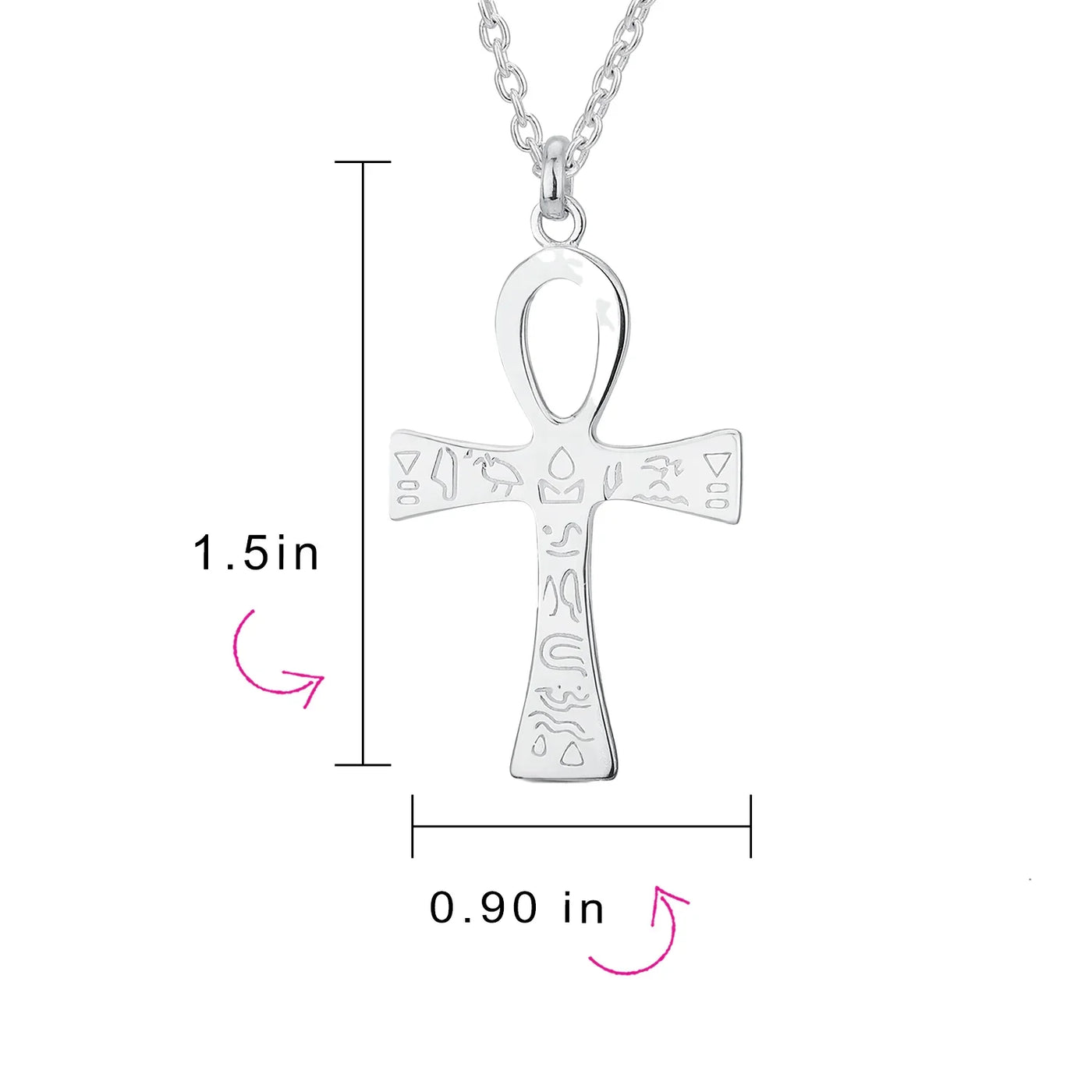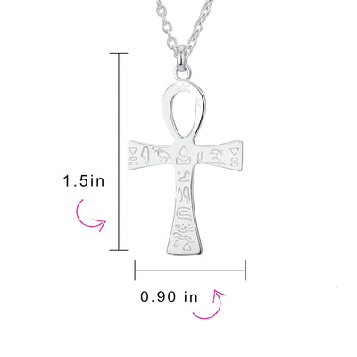 - Discover our exquisite .925 Silver Ankh Cross Pendant, symbolizing eternal life from ancient Egyptian culture. Crafted from high-quality .925 Sterling Silver, it features a stunning Antique Style finish. Explore intricate hieroglyphics, including water, reeds, textiles, a basket, a vulture, and a quail. Perfect for those who appreciate ancient cultures and seek spiritual or exotic accessories. This elegant and meaningful ankh cross pendant is a remarkable treasure. Comes with an 18 Inch rolo chain for a complete and stylish look.