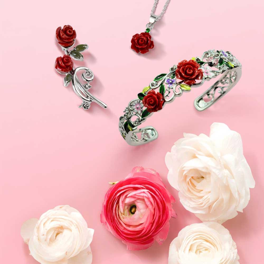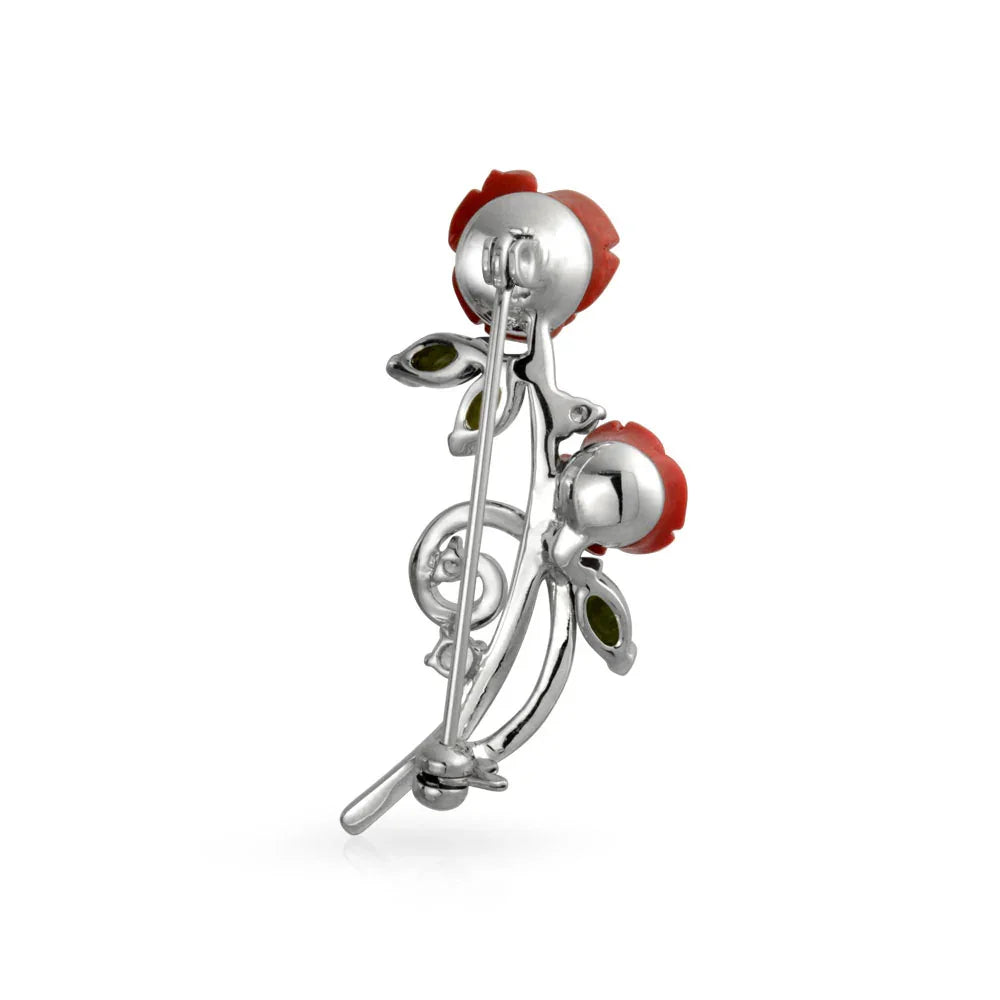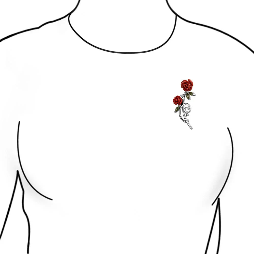 - Showcase your floral passion with this stunning red resin flower Brooch Pin. Featuring three marquise-shaped dark green leaves and clear CZ accents, it captures nature's beauty. Rhodium plated brass makes it a perfect Mother's Day gift, adding springtime charm to any outfit. Ideal for aunts or friends, this modern scarf pin enhances purses, hats, blazers, sweaters, and dresses. Affordable silver pins and brooches are a timeless choice for trendsetting ladies, making a delightful addition to any jewelry box.