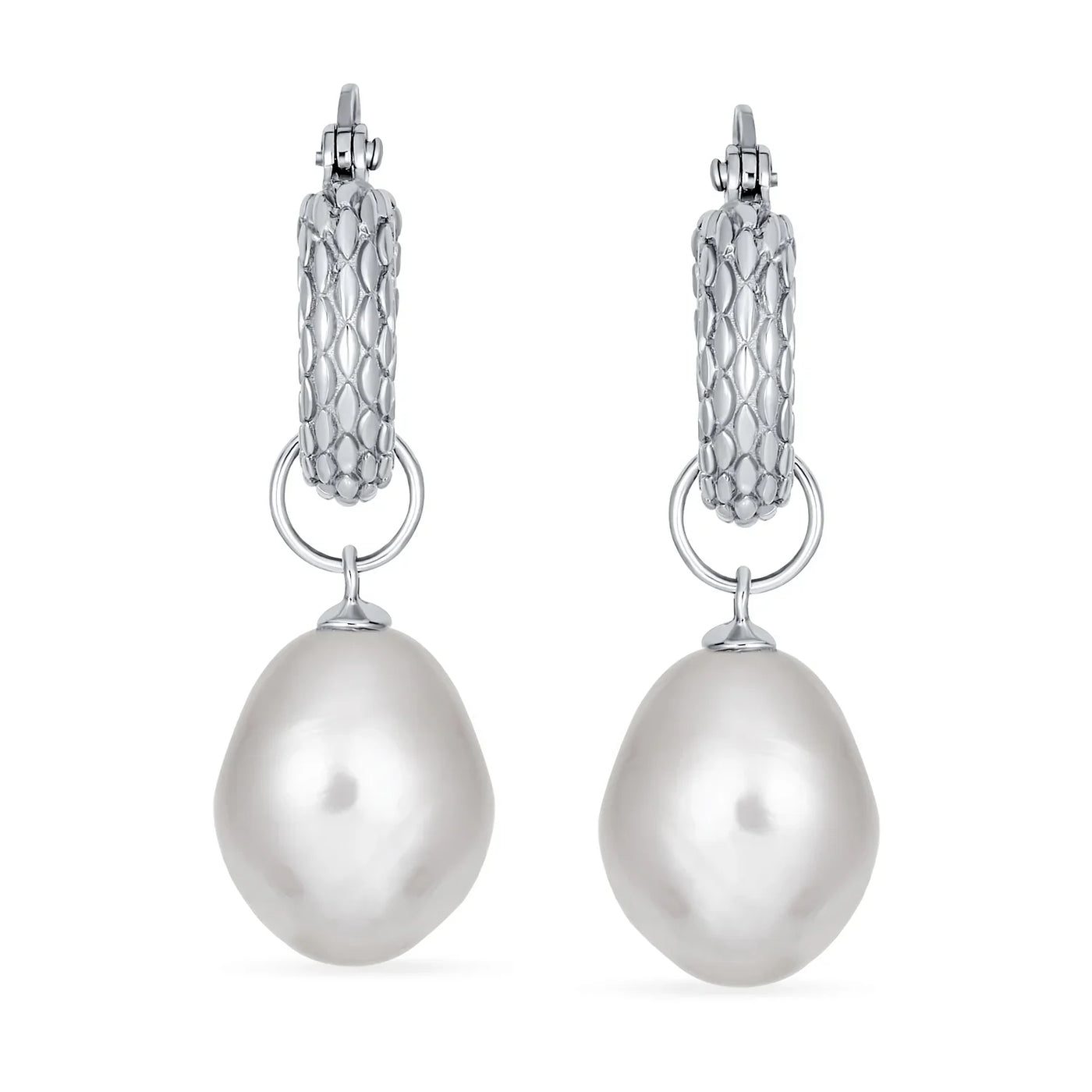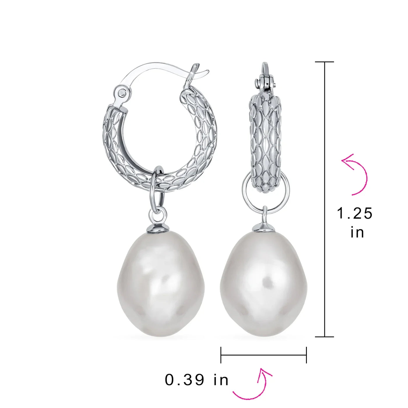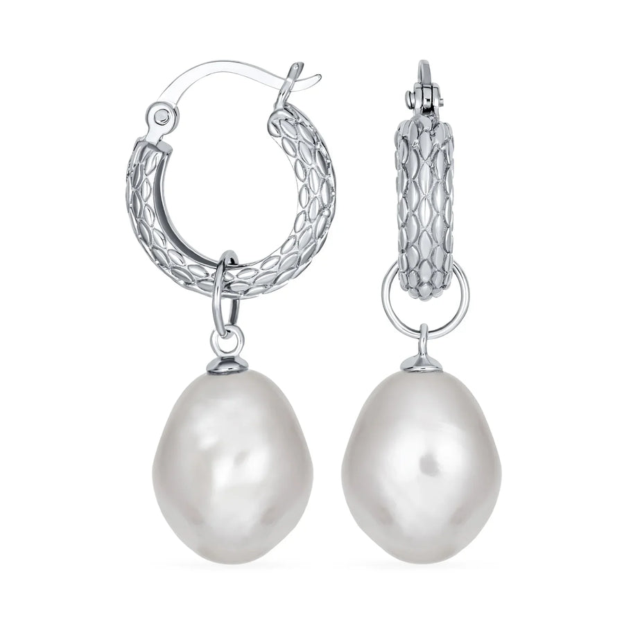 - On your wedding day, and every day after, you will be radiant in these precious, classic yet timeless hoop dangle pearl earrings. Featuring a nicely-sized freshwater cultured pearl in a irregular teardrop, shape may vary as nature of Baroque pearl.