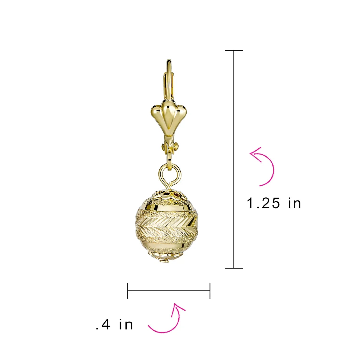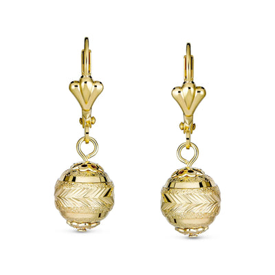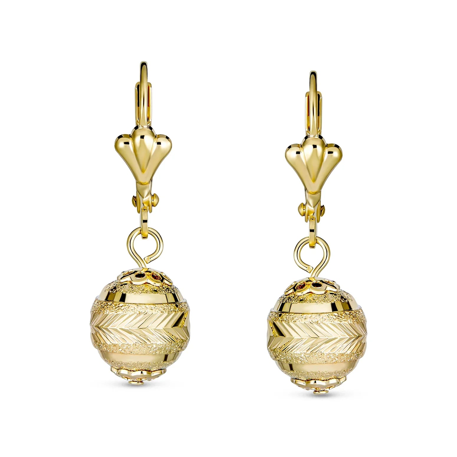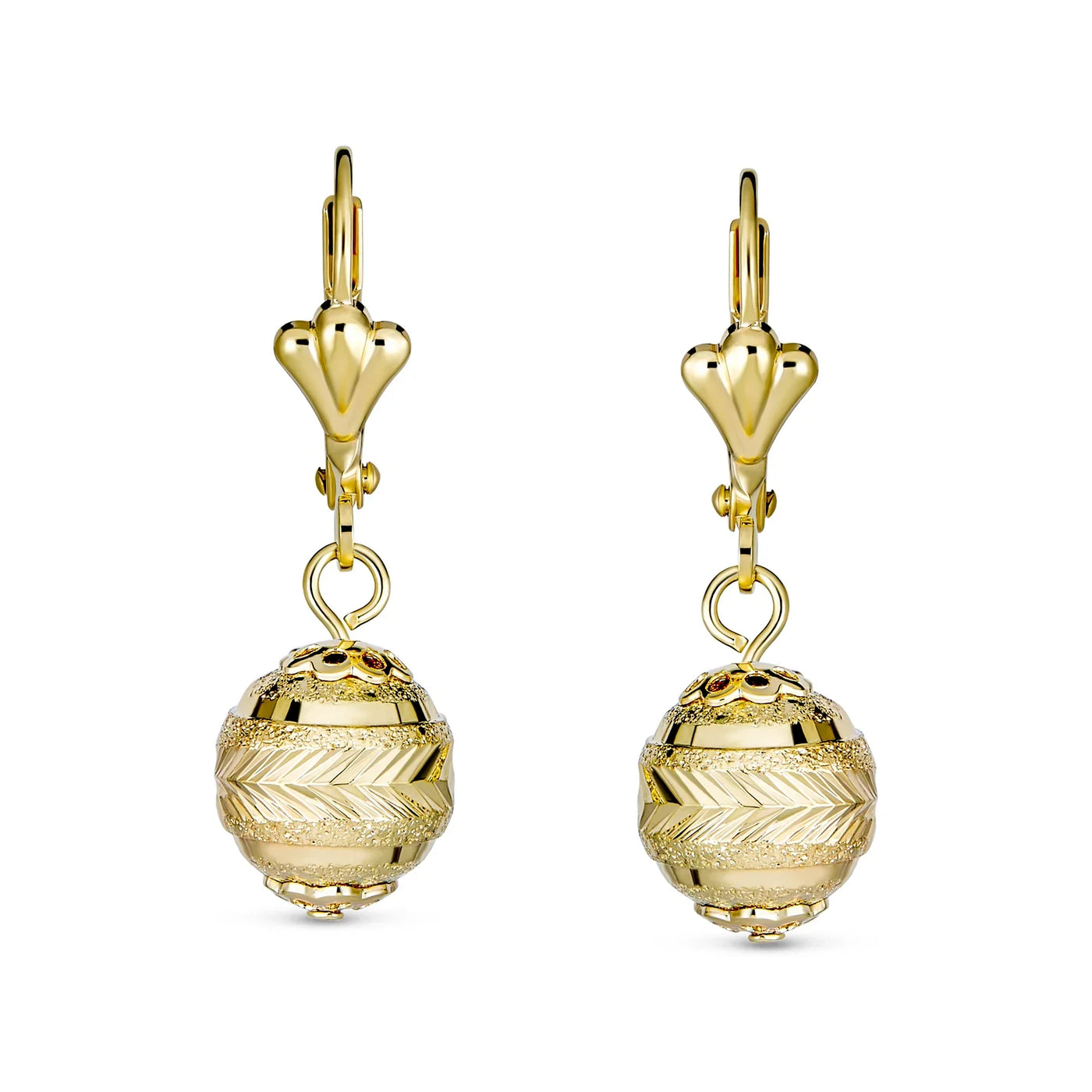 - Enhance your style with a touch of classic European elegance by adorning yourself with these exquisite etched 18K Gold Plated Brass drop ball earrings. Crafted with precision, these earrings boast shimmering gold ball beads that effortlessly elevate any outfit. Perfect for gifting, these chic earrings are sure to delight.