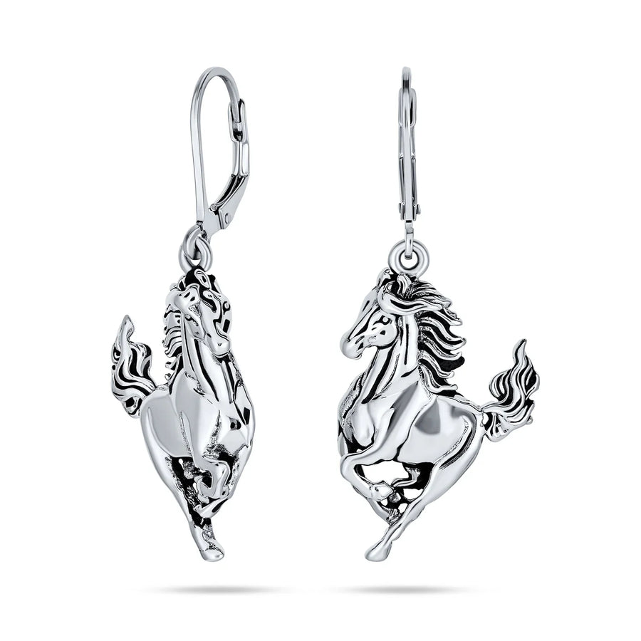 - Discover the latest trend in sterling silver equestrian horse earrings. These stunning running horse dangle earrings are fun and stylish. The detailed design, enhanced by an oxidized finish, highlights the mane, tail, and face. Update your style with these exquisite horse lever back earrings. Celebrate nature's majestic creatures with this unique jewelry. Order now and surprise a friend who loves equestrian gifts. Be prepared with a fabulous gift for any special occasion.