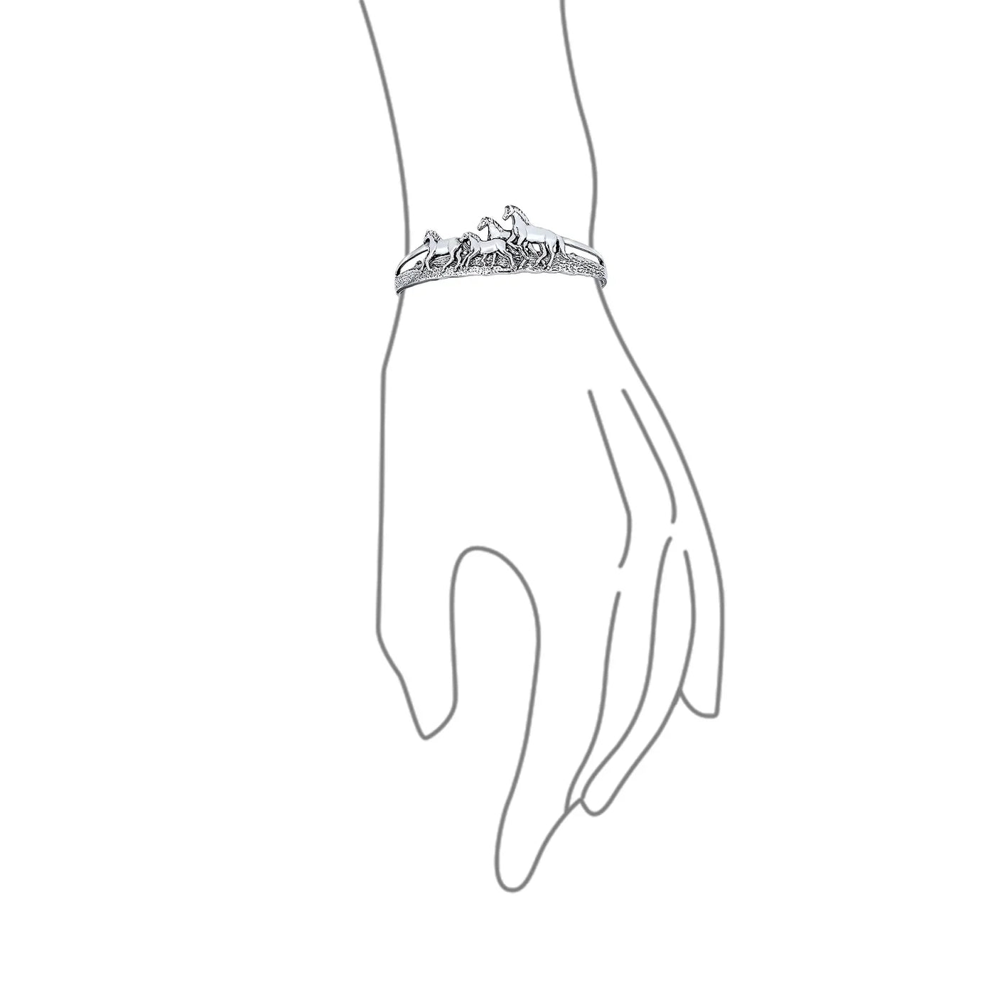 - This galloping horses bracelet is a stylish way to show off your love for riding or horses. Horses symbolize power, will, nobility, freedom, and industry. Revered by Celts, Greco Romans, and Native Americans, horses hold high cultural significance. Express your love for this spirited animal easily. Crafted from solid 925 sterling silver and oxidized for an antique look. You'll love wearing this animal jewelry daily. These cuff bracelets make great holiday gifts for loved ones.