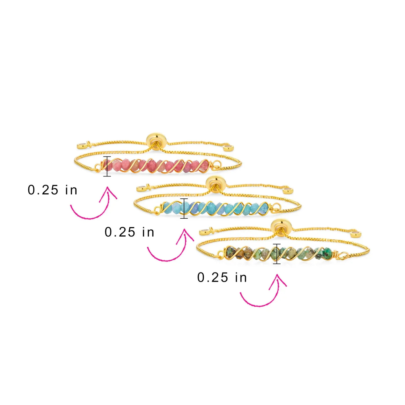 • Discover a fresh take on gemstone bracelets. Our Aquamarine gold-plated brass adjustable bracelet features a sparkling row of wire-twisted gems. The box chain offers a modern, contemporary look. Lariat styling with rubber lining ensures a secure fit. Adjustable from 6 to 9 inches to fit any wrist.