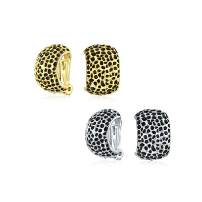 - Antique-style half dome shrimp design wide hinge clip-on earrings with a spotted finish