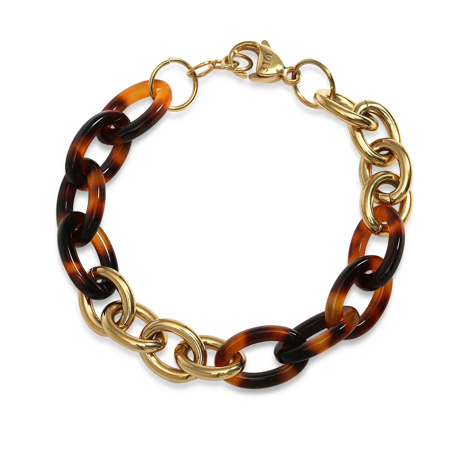 - Glamorous style for everyday elegance that will complement your office suit to your ladies night out ensemble. A gorgeous gold plated stainless steel lobster claw clasp link bracelet is elevated by a modern oval link design, featuring acrylic tortoise shell.