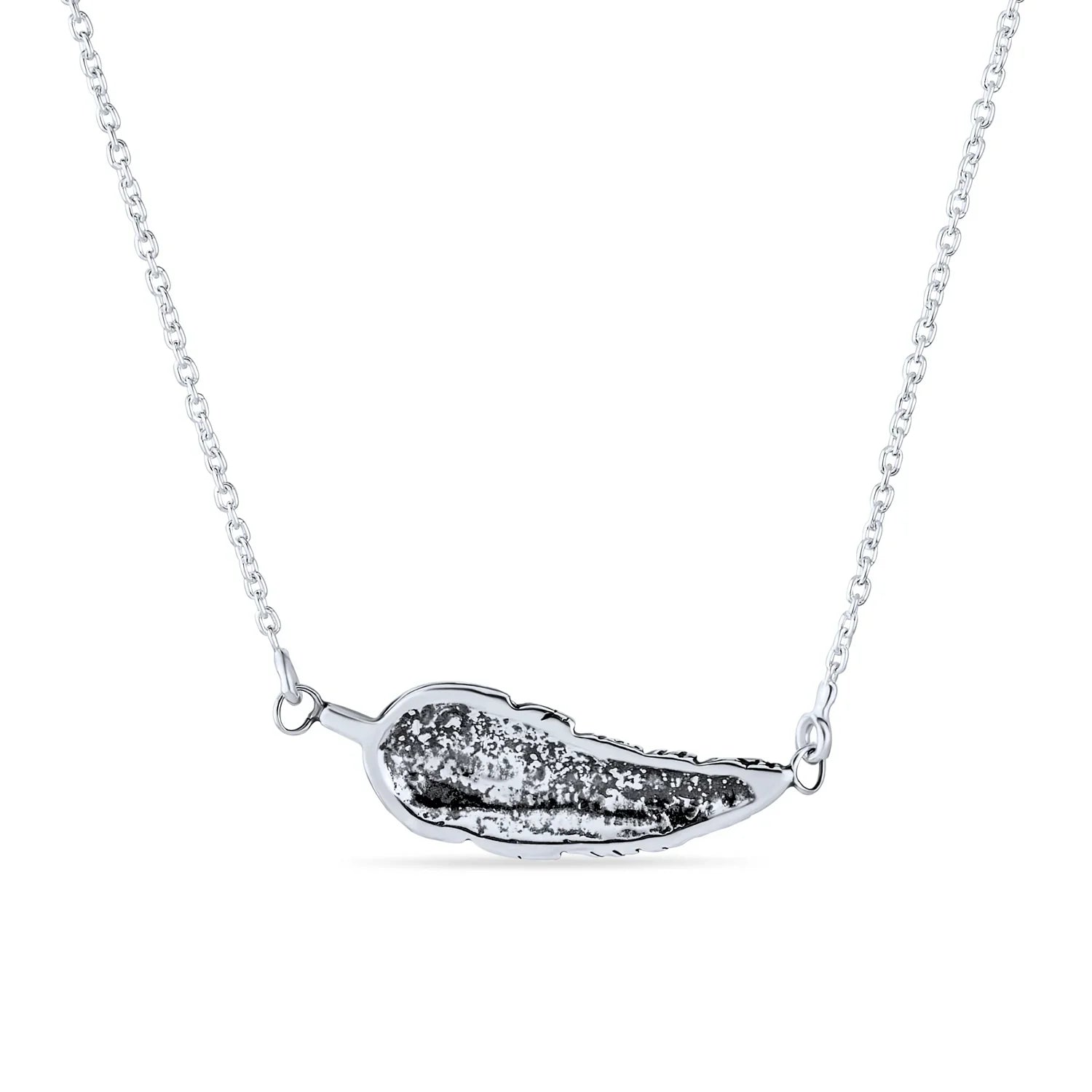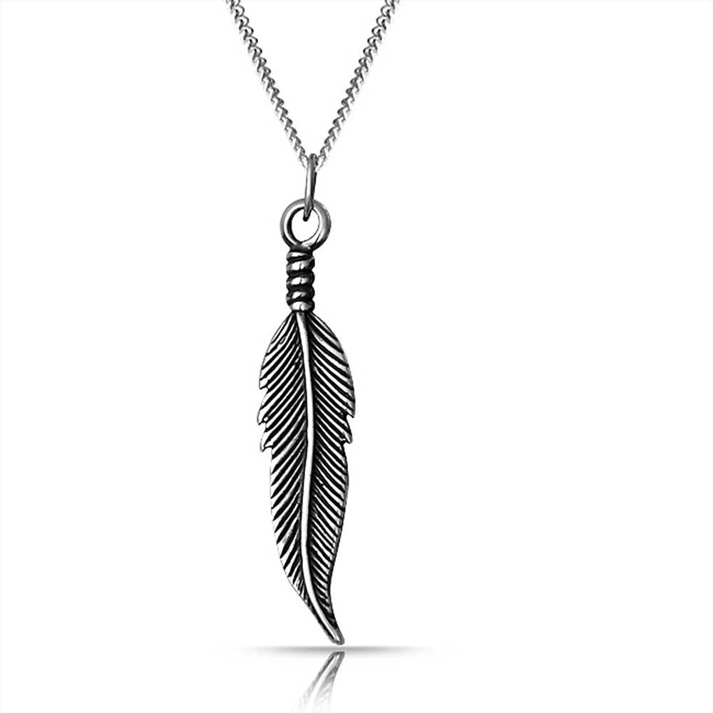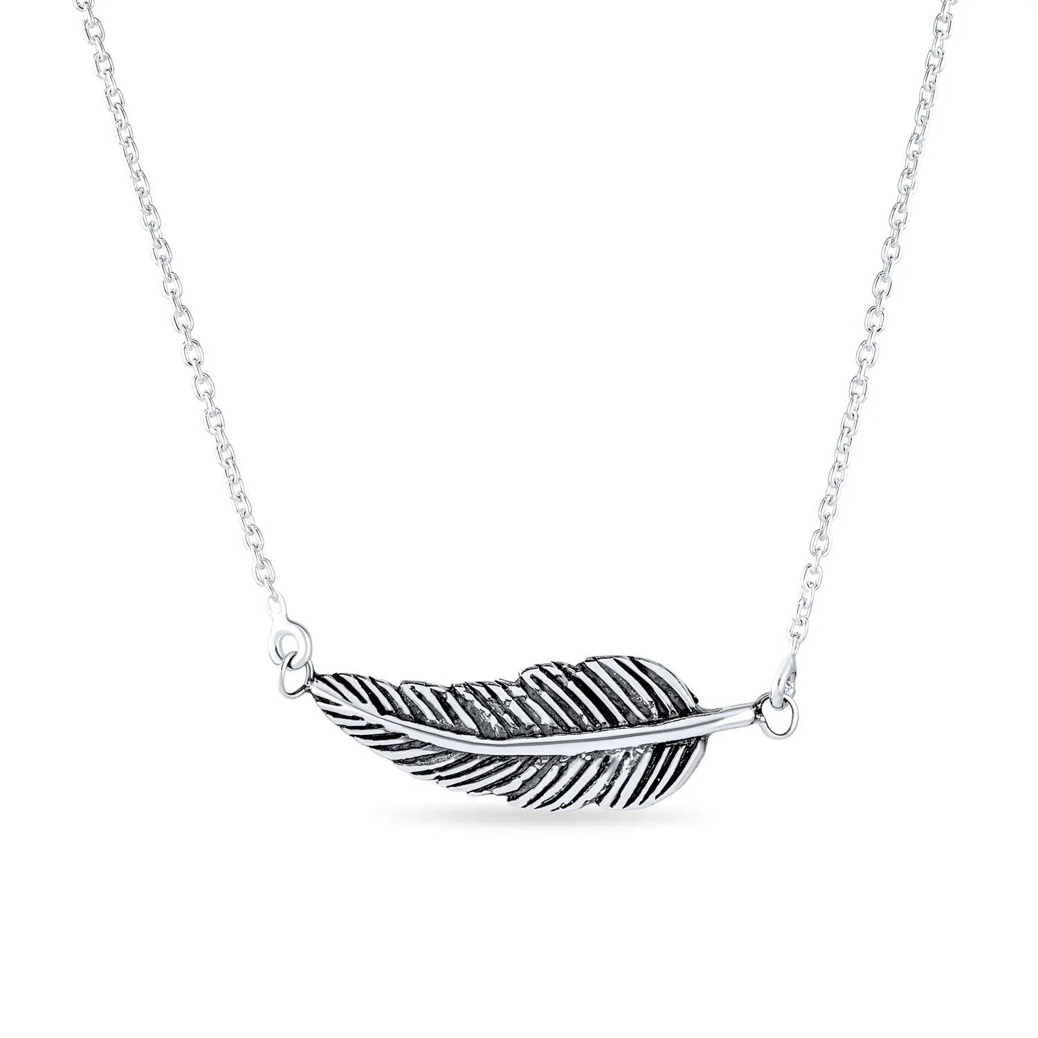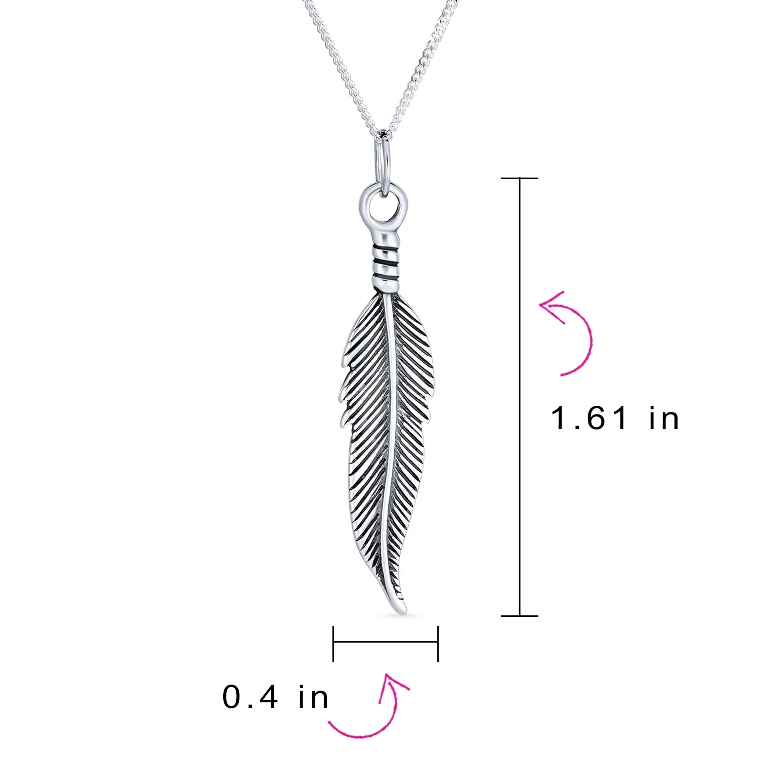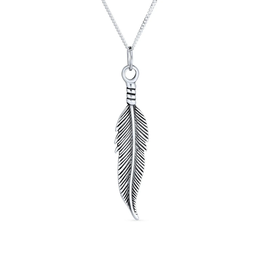 • This bohemian .925 Sterling Silver necklace is ideal for nature-inspired jewelry lovers. It features a feather pendant on an 18-inch silver Cuban curb chain. The oxidized .925 Sterling Silver adds an antiqued look. Perfect for those who love Southwestern and Native American style. Layer with real feather pieces for a bohemian princess vibe. This trendy Southwestern jewelry is a must-have. Get this quality .925 Sterling Silver piece today!