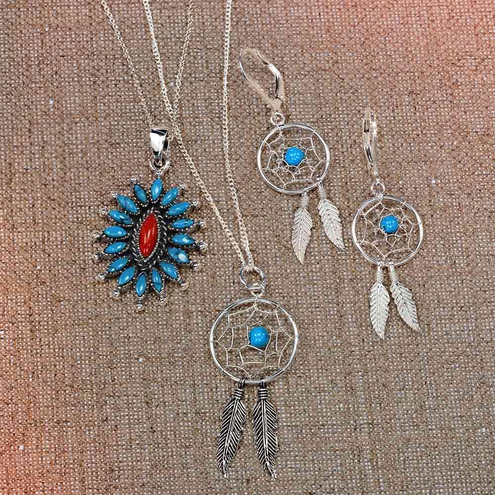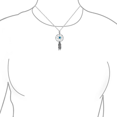 • Adore Southwestern style? Our sterling silver dream catcher necklace with compressed Turquoise cz and feather accents is perfect. Wear solo or layered.