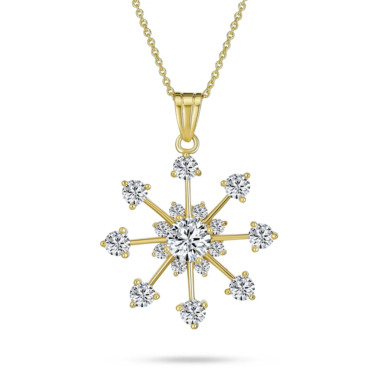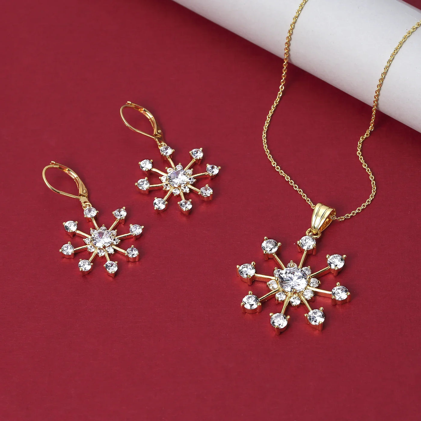 - Festive Sprite - Elevate your holiday then style with these exquisite gold plated necklace & drop earrings jewelry set. Featuring a charming snowflake motif adorned with sparkling cz accents, add a touch of winter-themed luminosity to any outfit.