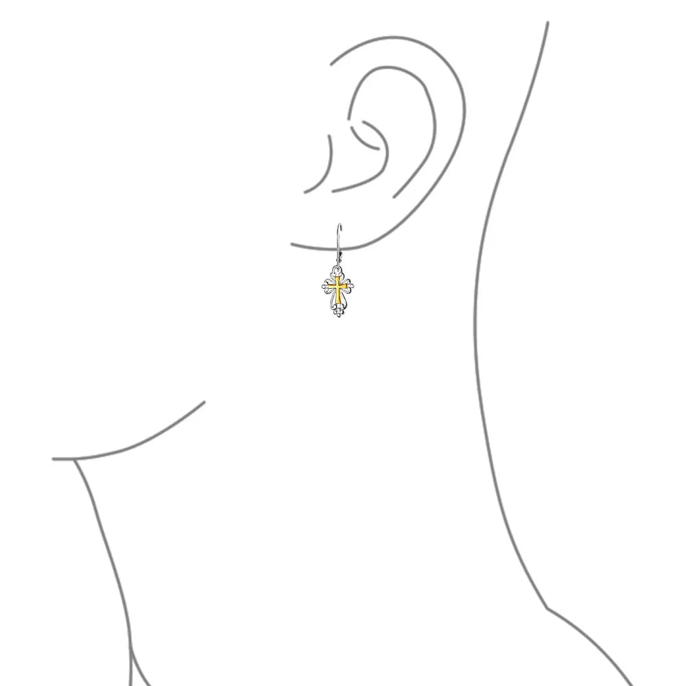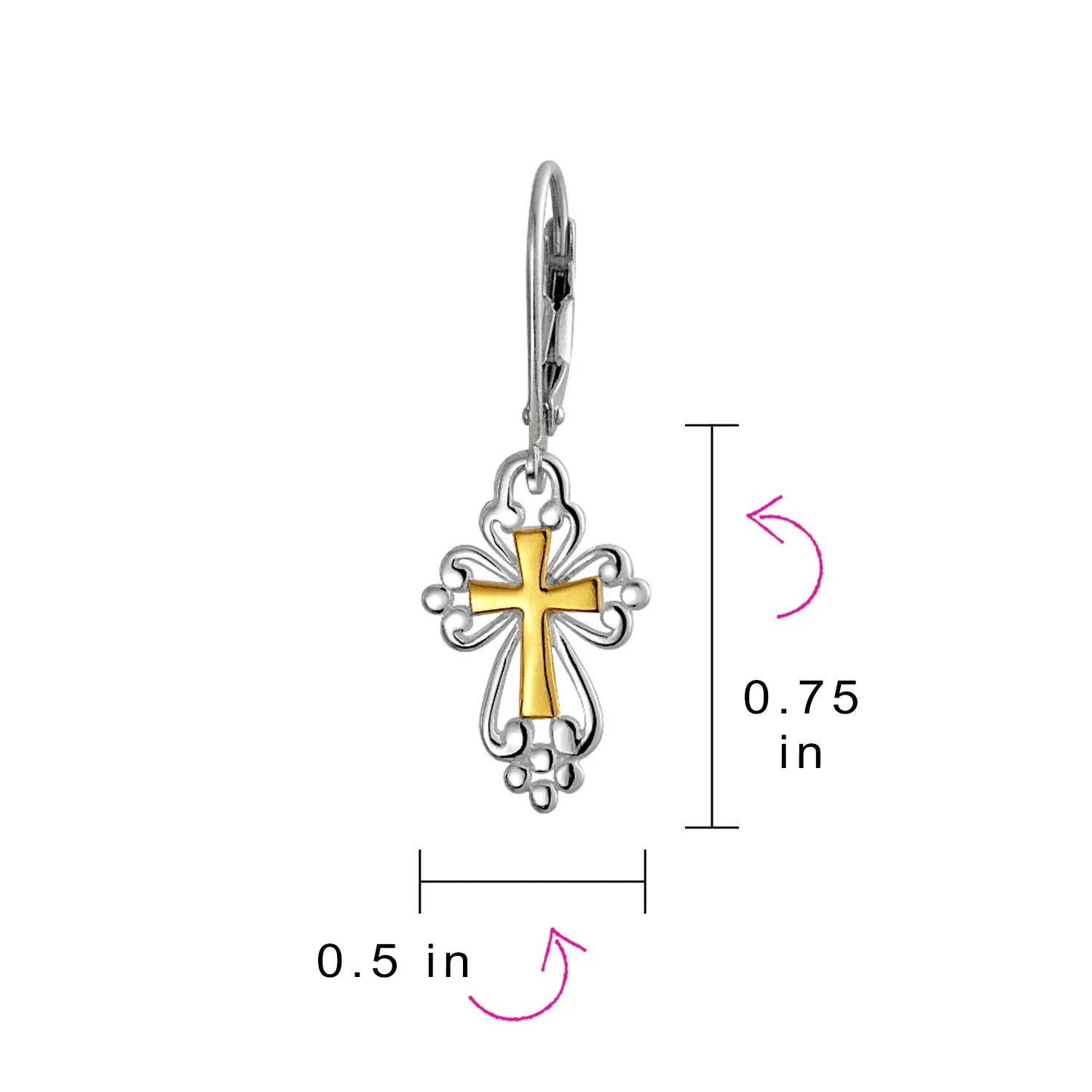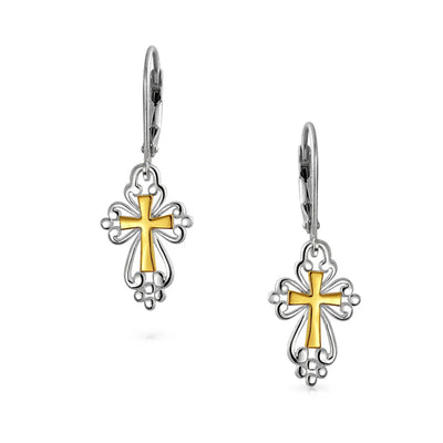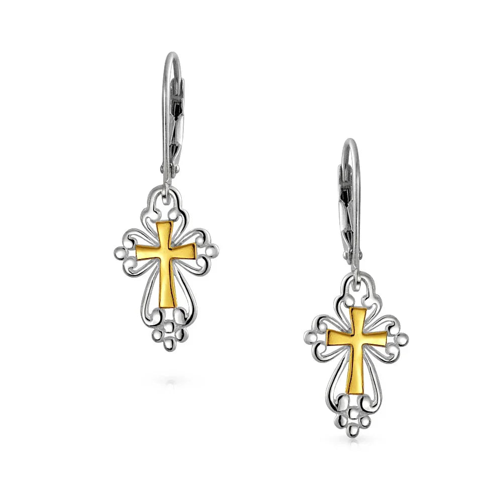- For a captivating, spiritual look with a medieval touch, adore these beautifully crafted dangle lever back earrings. These enchanting dAngles showcase a stunning two-toned design with a gold-plated religious cross over sterling silver.