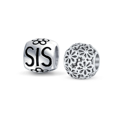 - Celebrate the special sisterly bond with this exquisite barrel-shaped charm, engraved with "SIS" to honor a cherished relationship. Each Bling Jewelry Sterling Silver Sister Charm Bead is individually handmade, ensuring unique patterns and colors.
