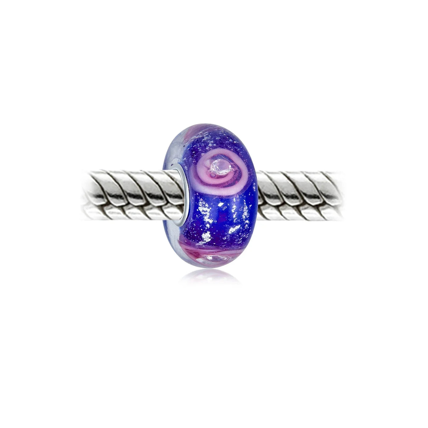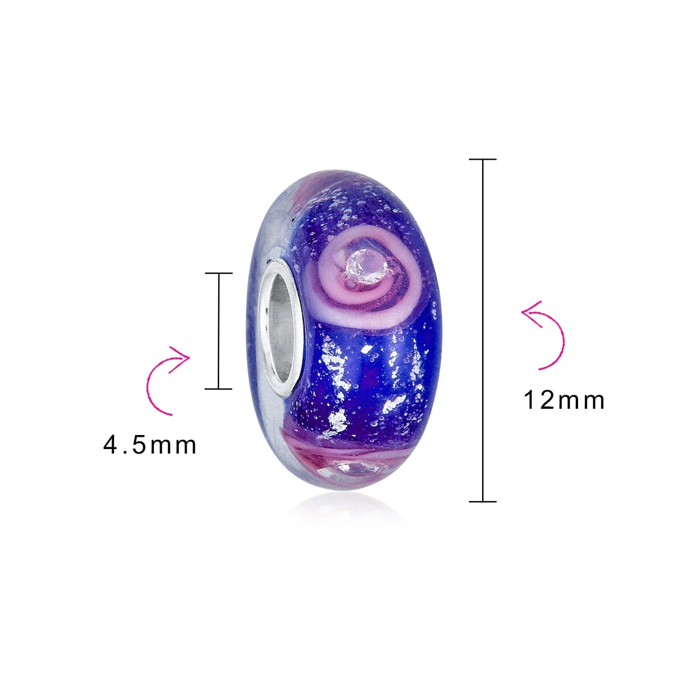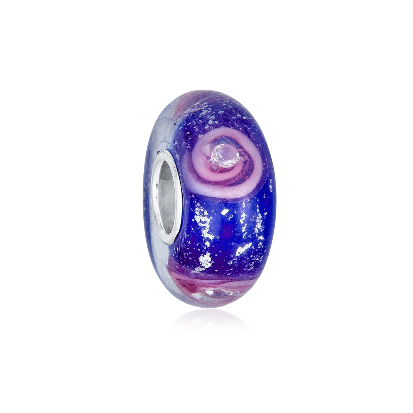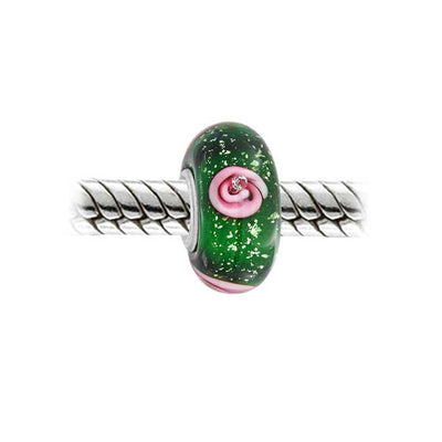 - This is one of the most sensational Murano Glass Beads you will find anywhere. Flecks of glitter are interspersed throughout our glitter Glass Bead and really make it shimmer and shine. Each rose even boasts a tiny CZ stone in its center. The deep, rich Simulated gemstone background is a lush and lovely contrast to the pink flower on our sterling silver rose bead. You can add one or two of these May birthstone beads to your beads bracelet and add a brilliant pop of color to your wrist. Just like a beautiful bouquet of pink roses, any woman would be happy to add our pink rose flower beads to her unique story bracelet. Bead core is 5MM.