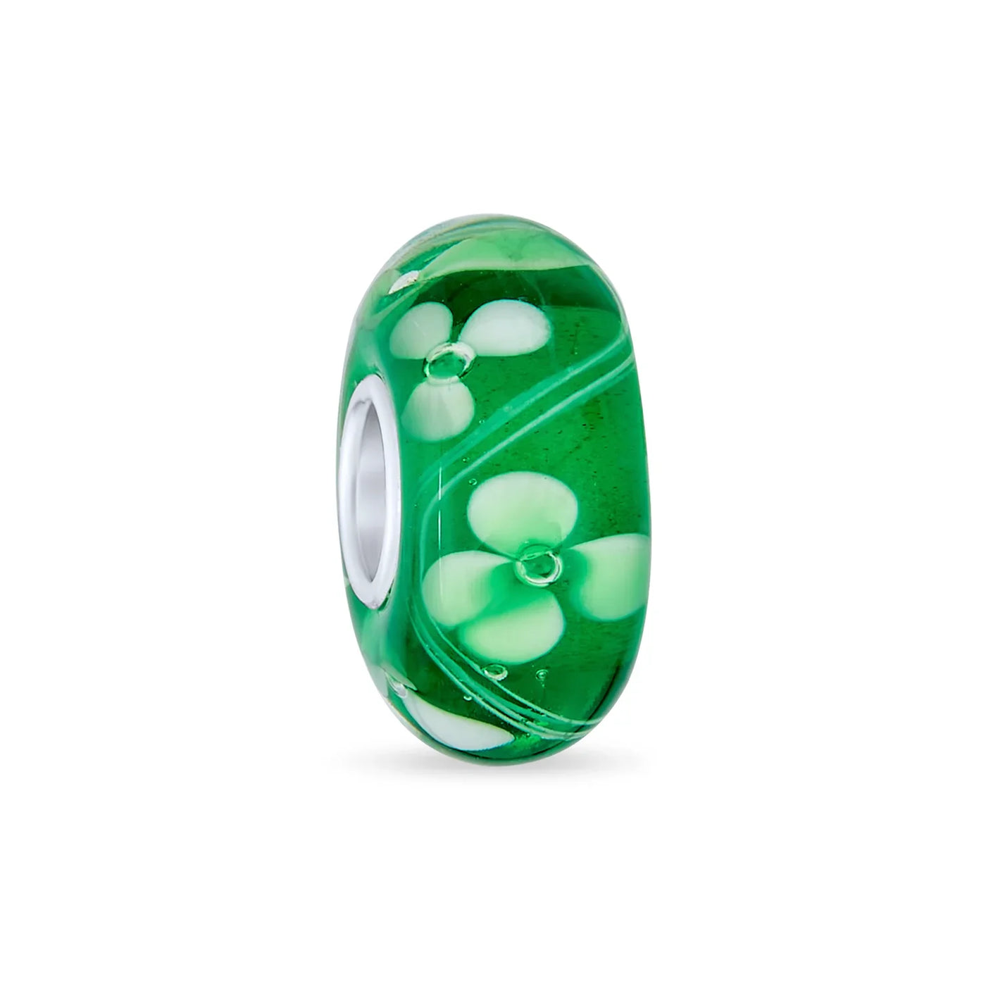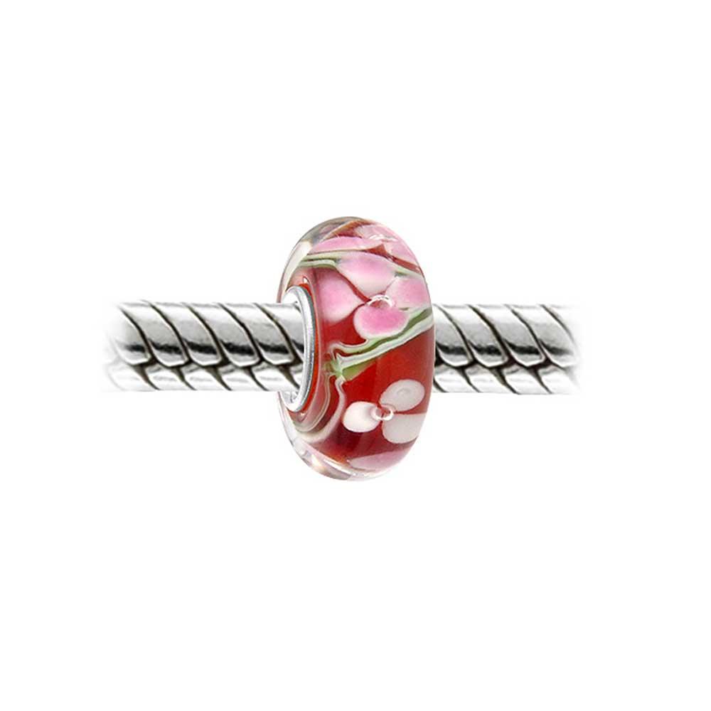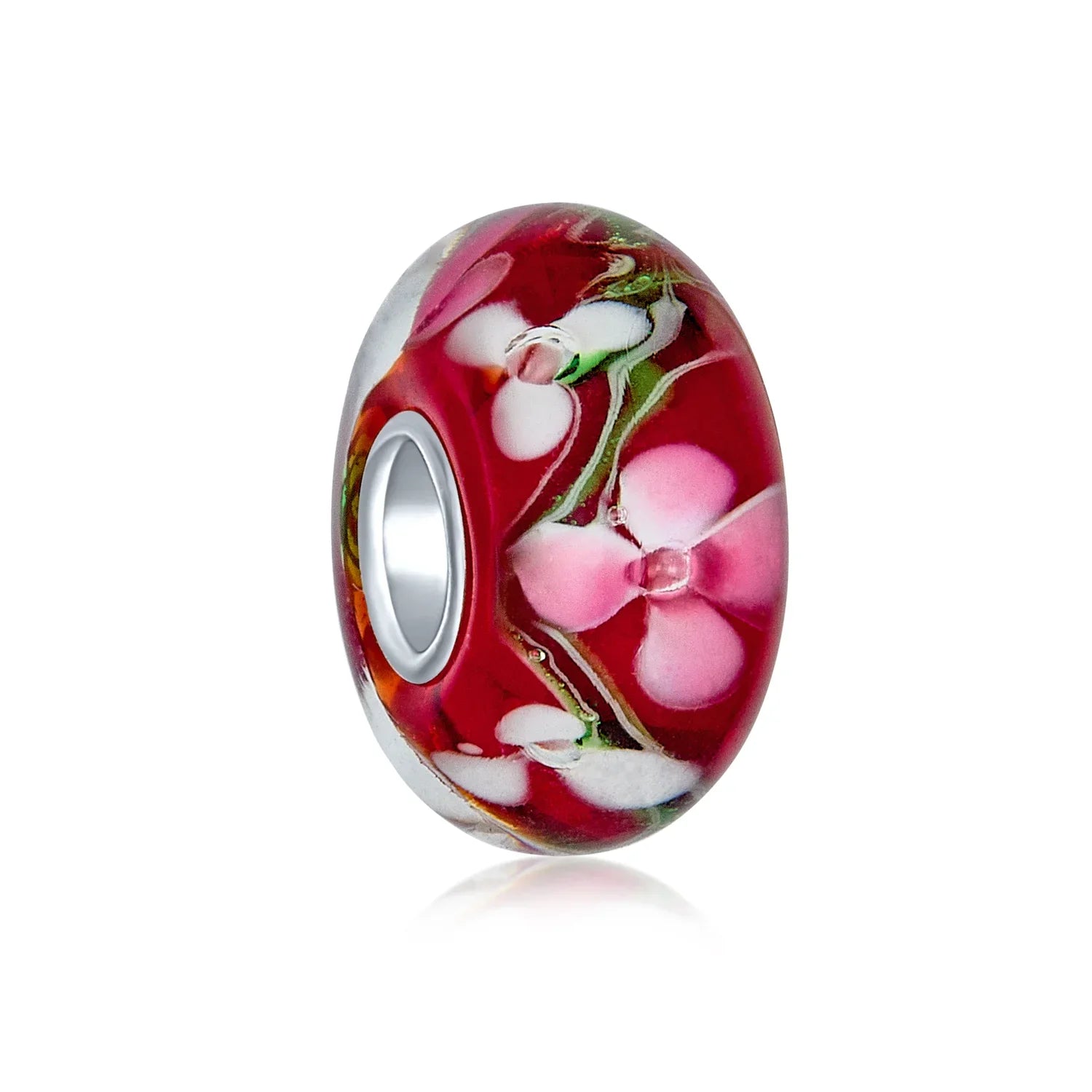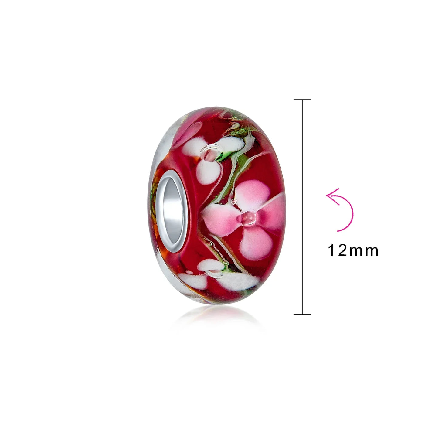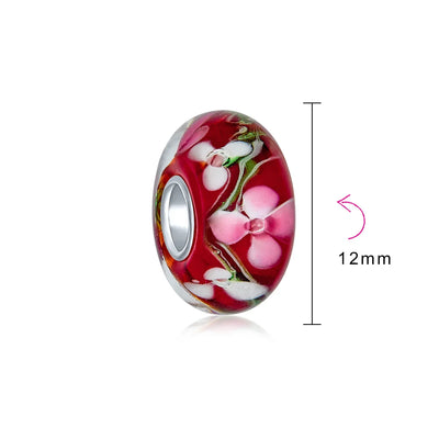 - Enhance your charm bracelet with this elegant glass flower bead. Crafted with three delicate flowers in Murano glass, it fits 3mm snake chains, cords, and European bracelets. Available in vibrant red, soft pink, or lush green, it adds a pop of color. Elevate your style with this versatile, stunning accessory.