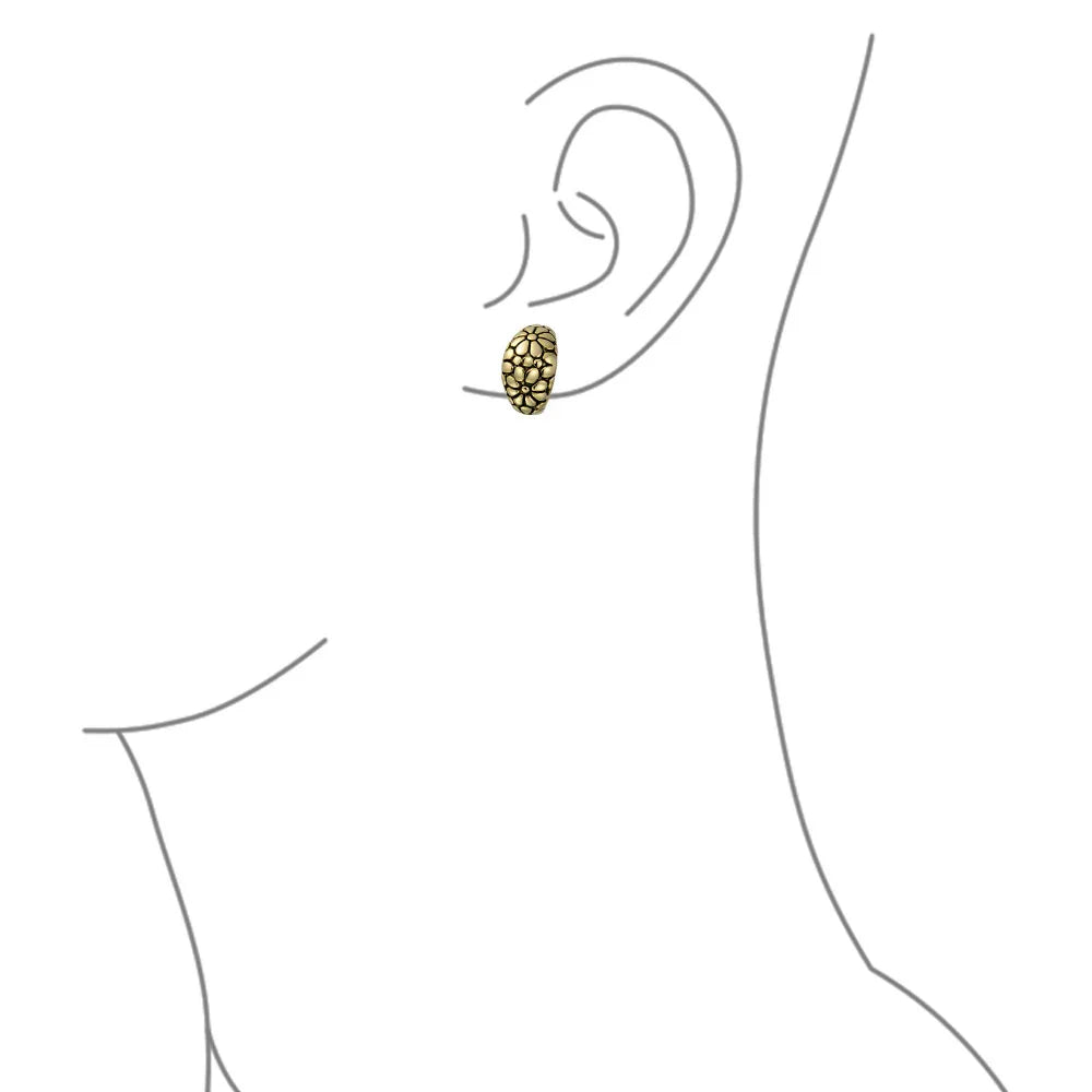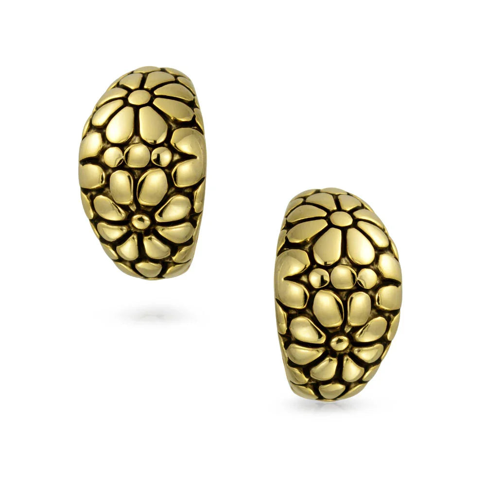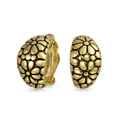 - STUNNING DESIGN- Bring some antique sass to your everyday jewelry collection. These clip on daisy half hoops are gold plated and have a retro pattern perfect for daytime or evening.