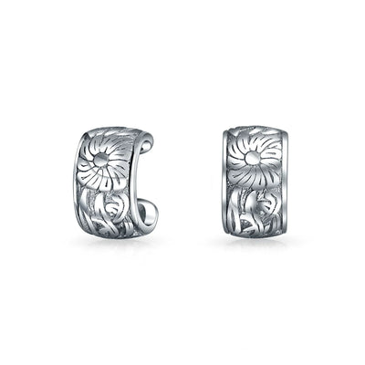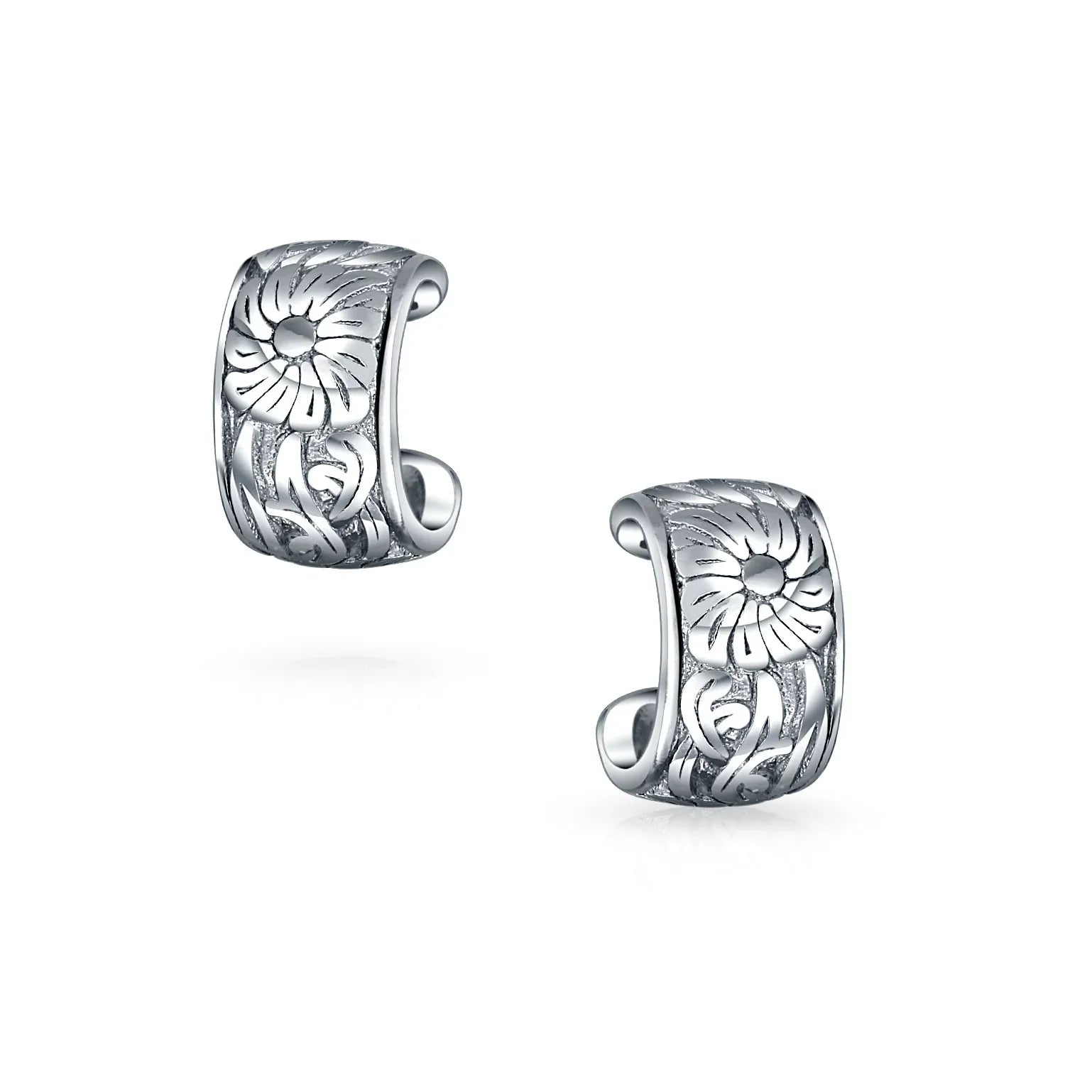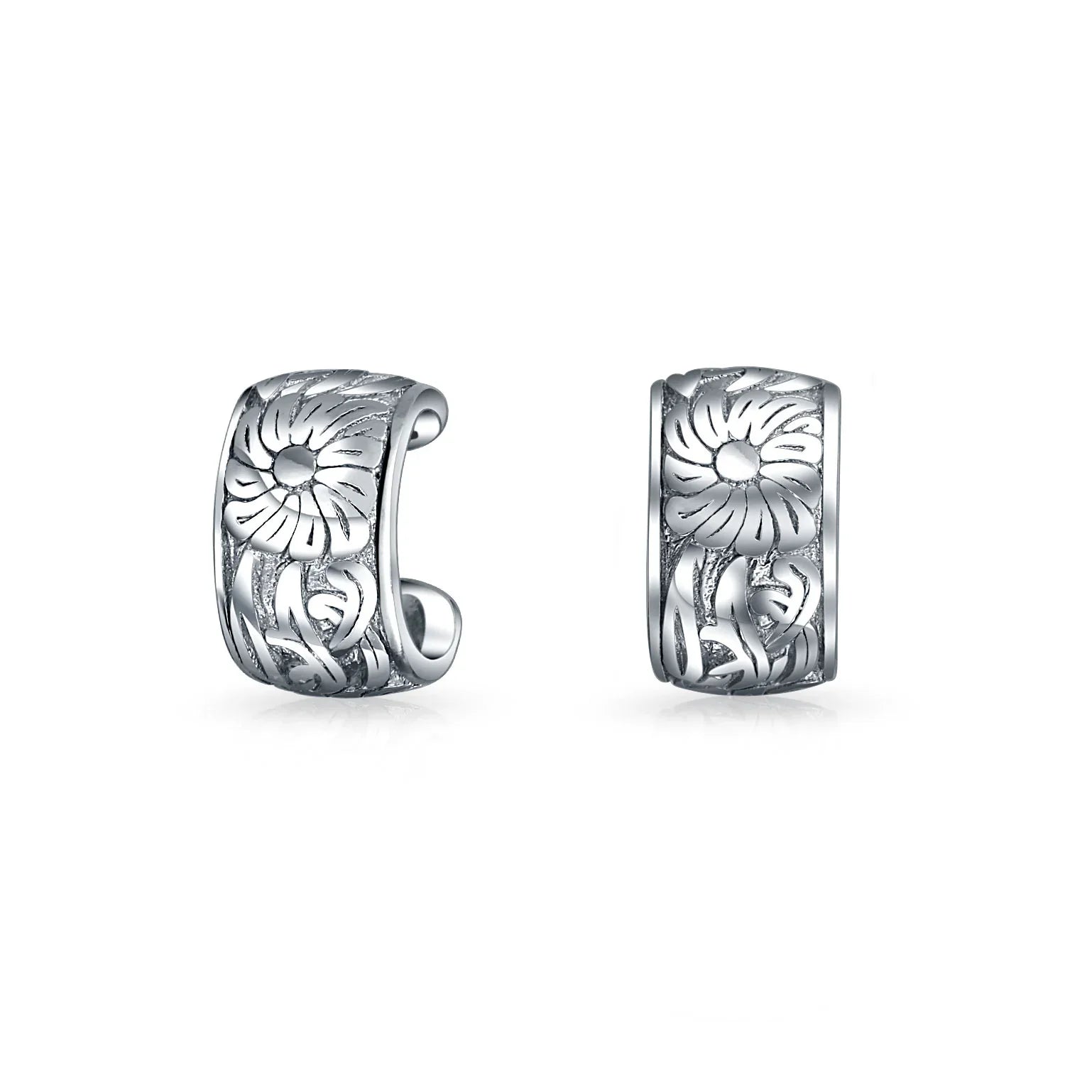 - Elevate your style with these stunning .925 sterling silver ear cuffs that effortlessly blend on-trend fashion with a feminine, natural charm. Adorned with an intricately engraved floral motif, complete with delicate leaves, these ear cuffs are designed specifically for non-pierced ears. Sold as a pair, they are the perfect accessory to add a touch of sophisticated allure to any ensemble.